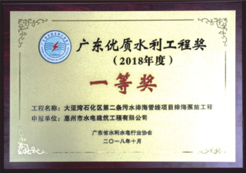廣東優(yōu)質(zhì)水利工程獎(jiǎng)(一等獎(jiǎng))——大亞灣石化區(qū)第二條污水排海管線項(xiàng)目排海泵站工程