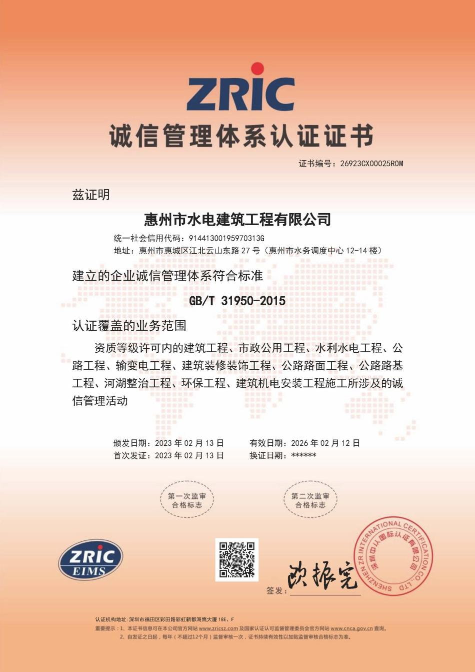為全面提升誠信水平和市場競爭力,建立運行有效的誠信管理體系,促進公司健康可持續發展,市水電公司于2023年2月9日至10日由領導班子牽頭組織各部門相關人員參與誠信管理體系評審。功夫不負有心人,經過公司上下的共同努力,我司于2023年2月13日榮獲由深圳中認國際認證有限公司…......