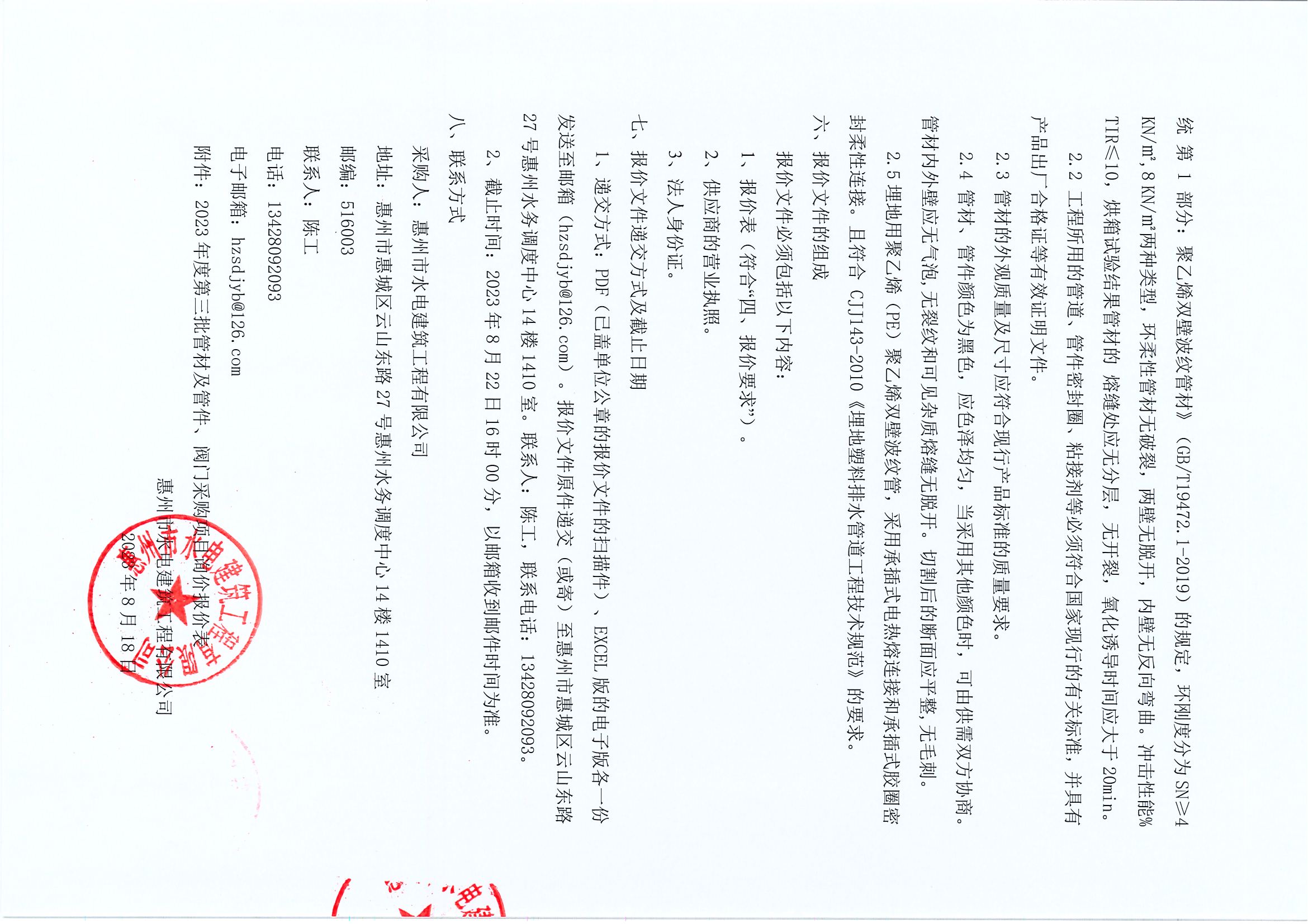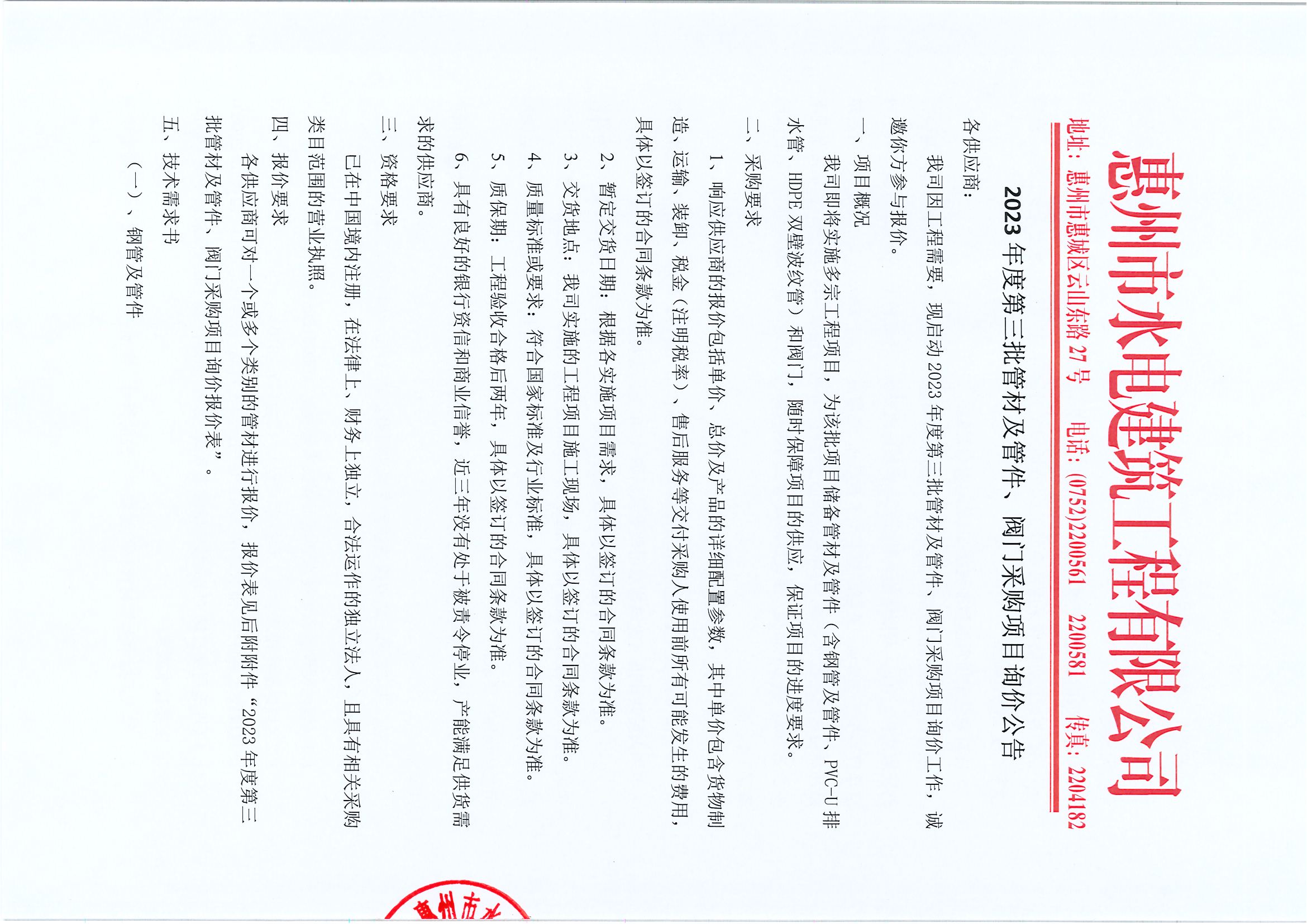 2023年度第三批管材及管件、閥門采購項目詢價公告