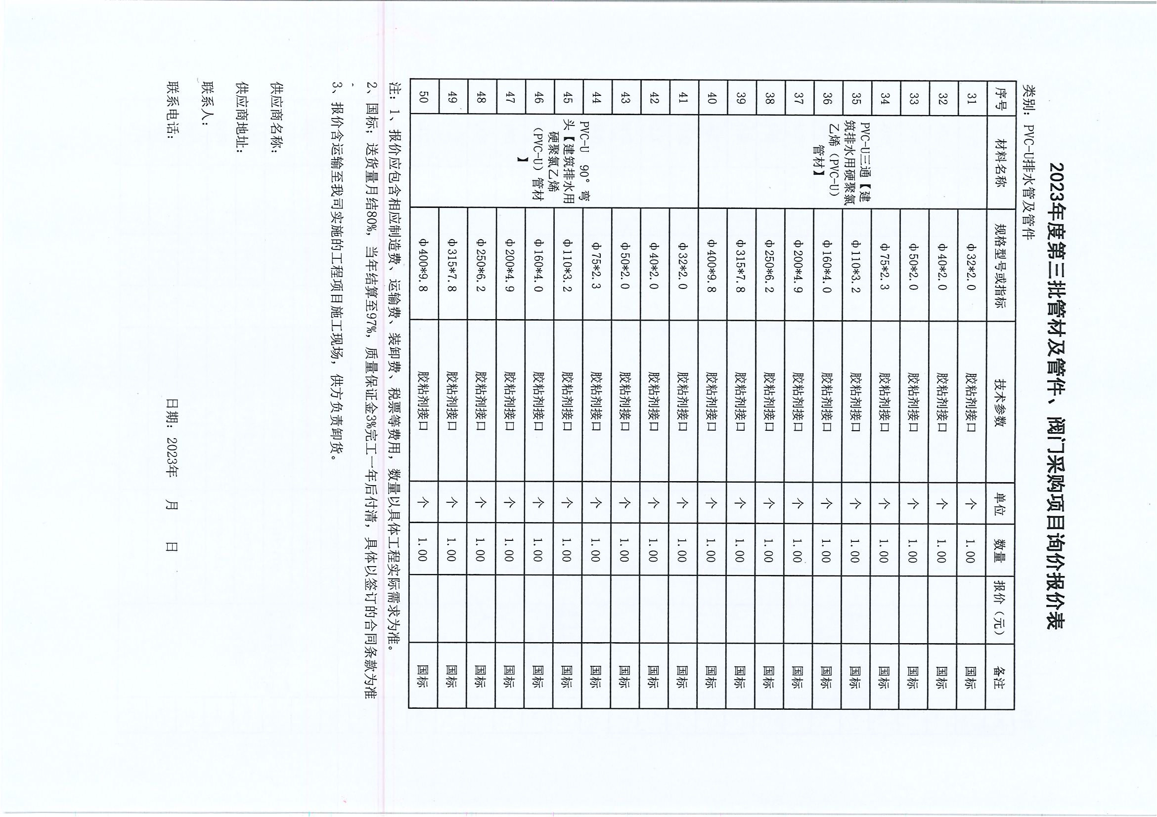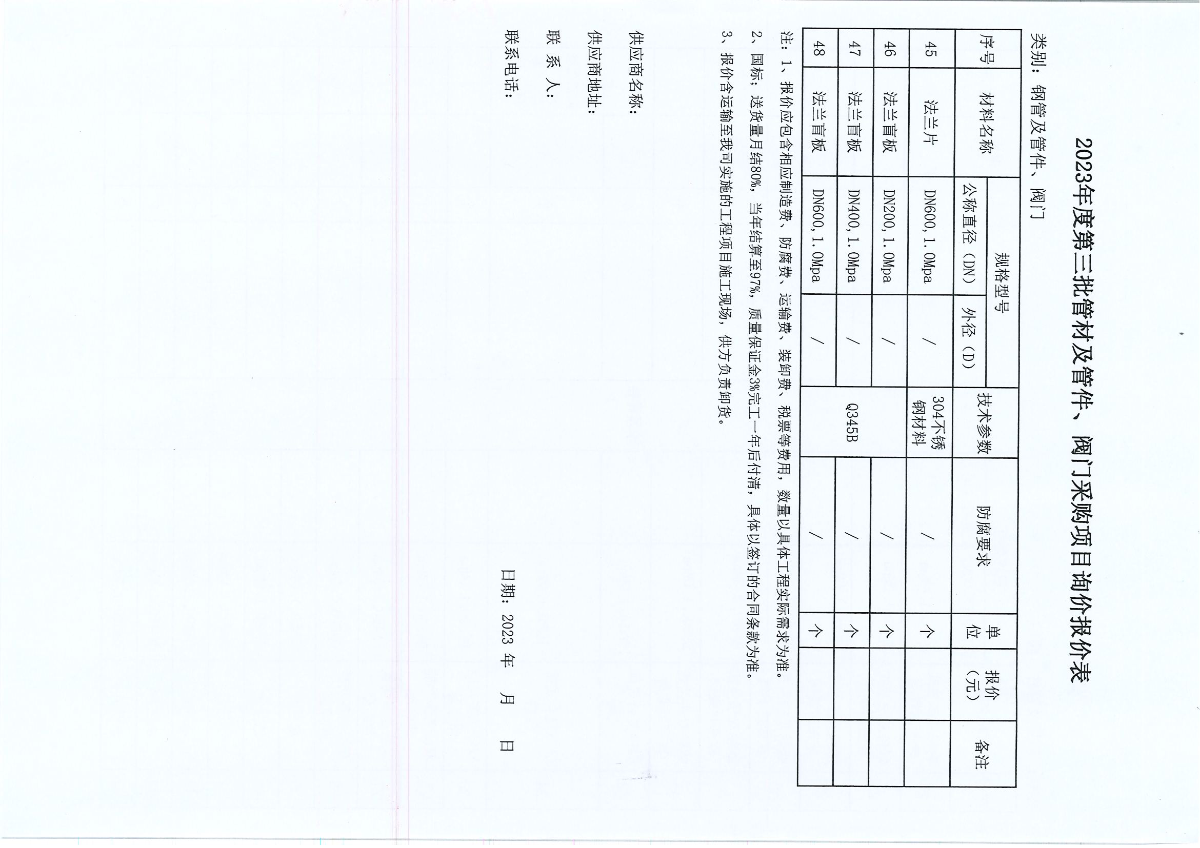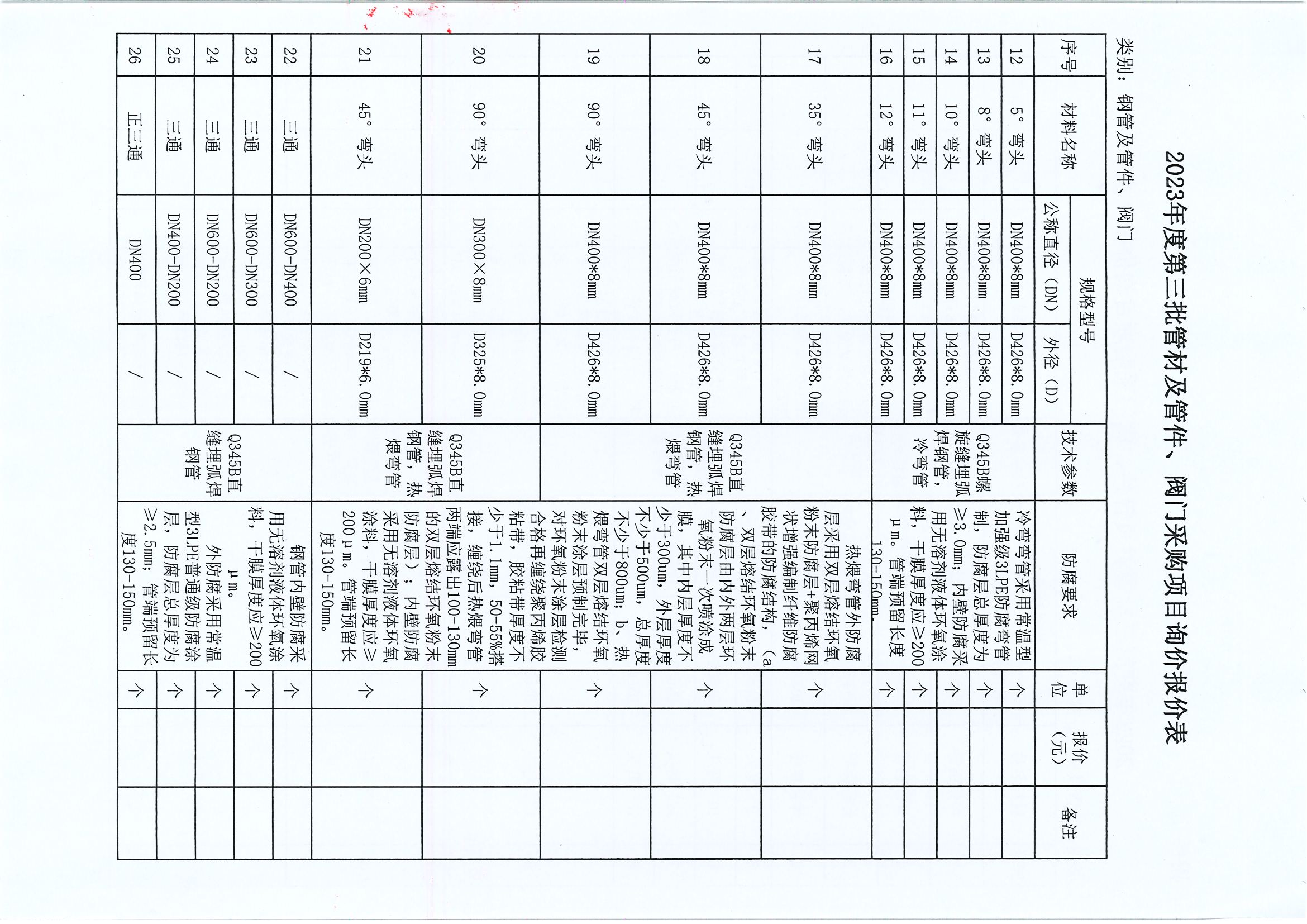 附件:2023年度第三批管材及管件、閥門采購項目詢價報價表