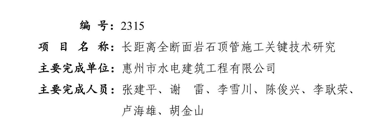 9月14日,廣東省水利學會水利科學技術獎勵委員會公布了《關于授予第十五屆廣東省水利學會水利科學技術獎的決定》,由市水電公司獨立完成的《長距離全斷面巖石頂管施工關鍵技術研究》獲得三等獎。