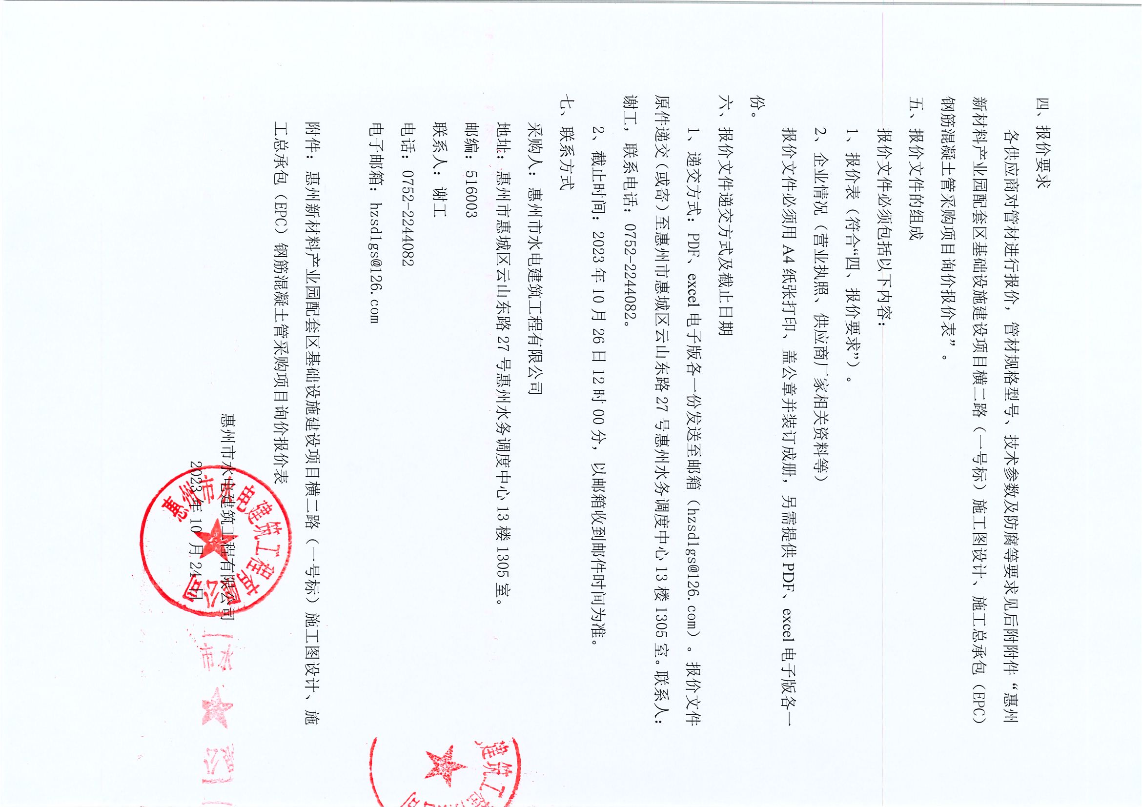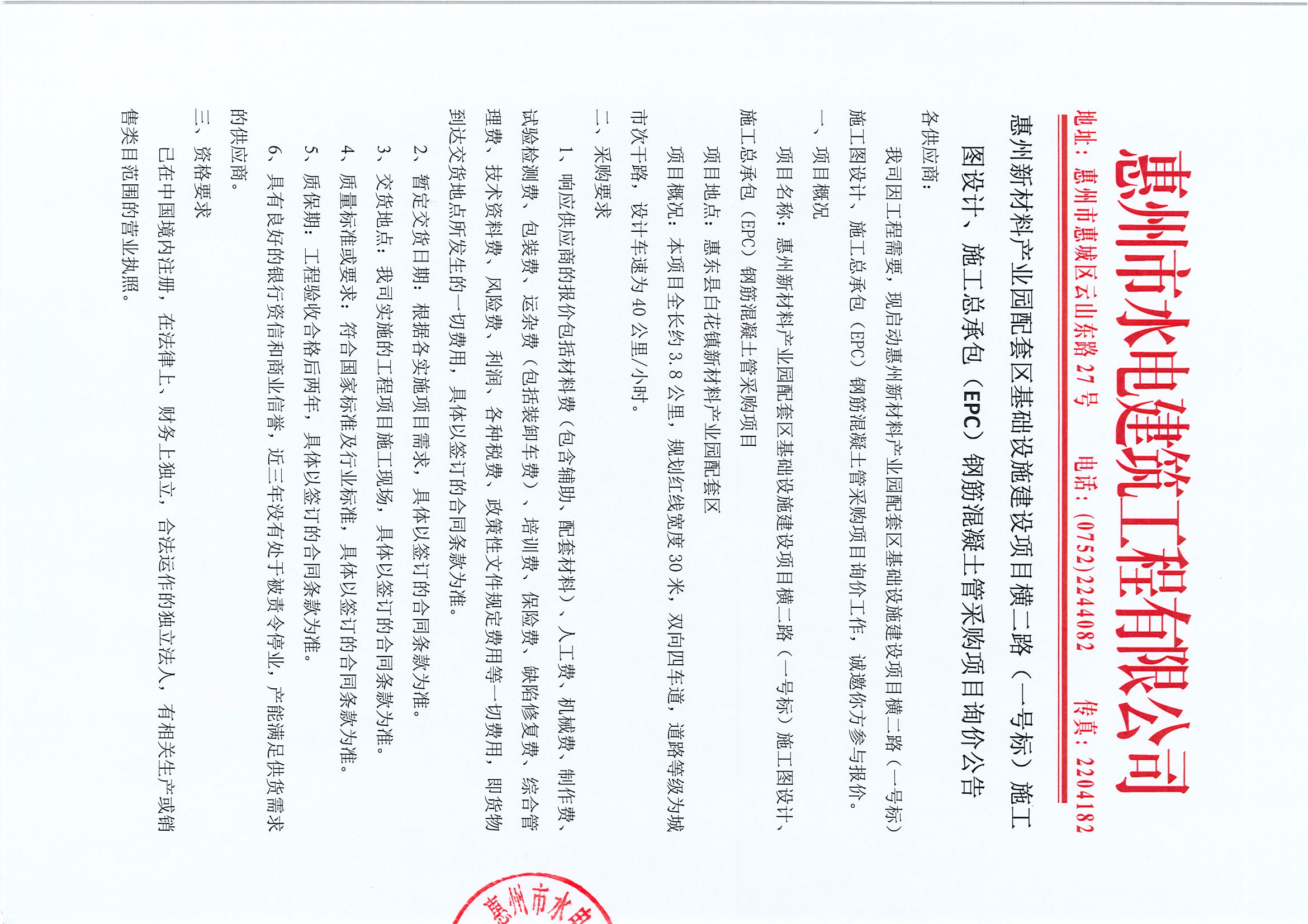 惠州新材料產業園配套區基礎設施建設項目橫二路(一號標)施工圖設計、施工總承包(EPC)鋼筋混凝土管采購項目詢價公告