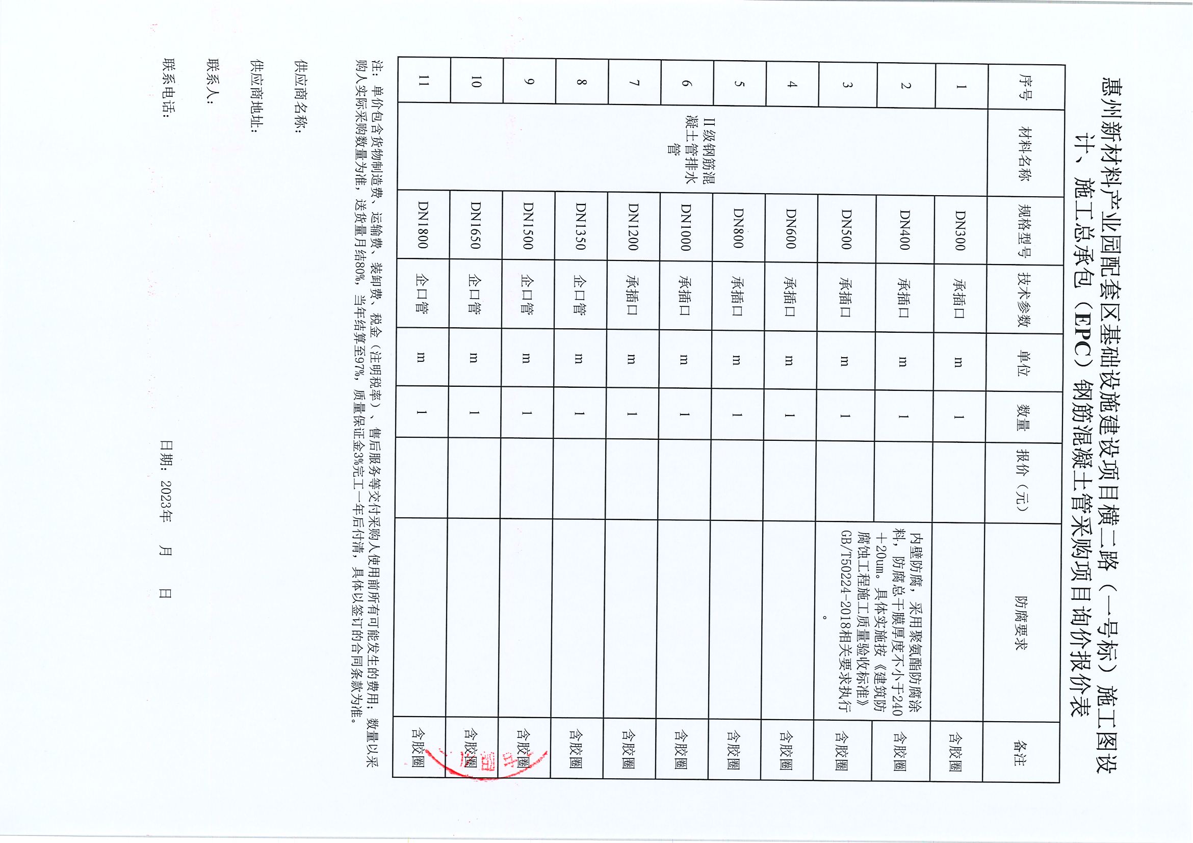 附件:惠州新材料產業園配套區基礎設施建設項目橫二路(一號標)施工圖設計、施工總承包(EPC)鋼筋混凝土管采購項目詢價報價表