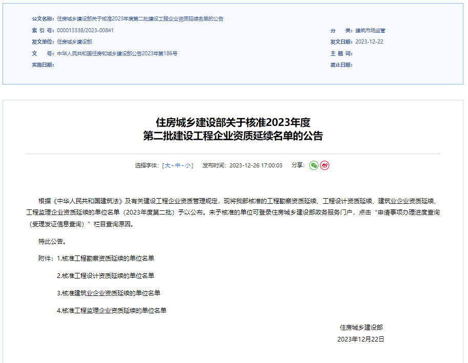 2023年12月26日,住房和城鄉建設部官網發布了2023年度第二批建設工程企業資質延續核準名單,我司提交的建筑工程、水利水電工程、市政公用工程三個專業施工總承包壹級資質延續申請全部獲得審批通過。