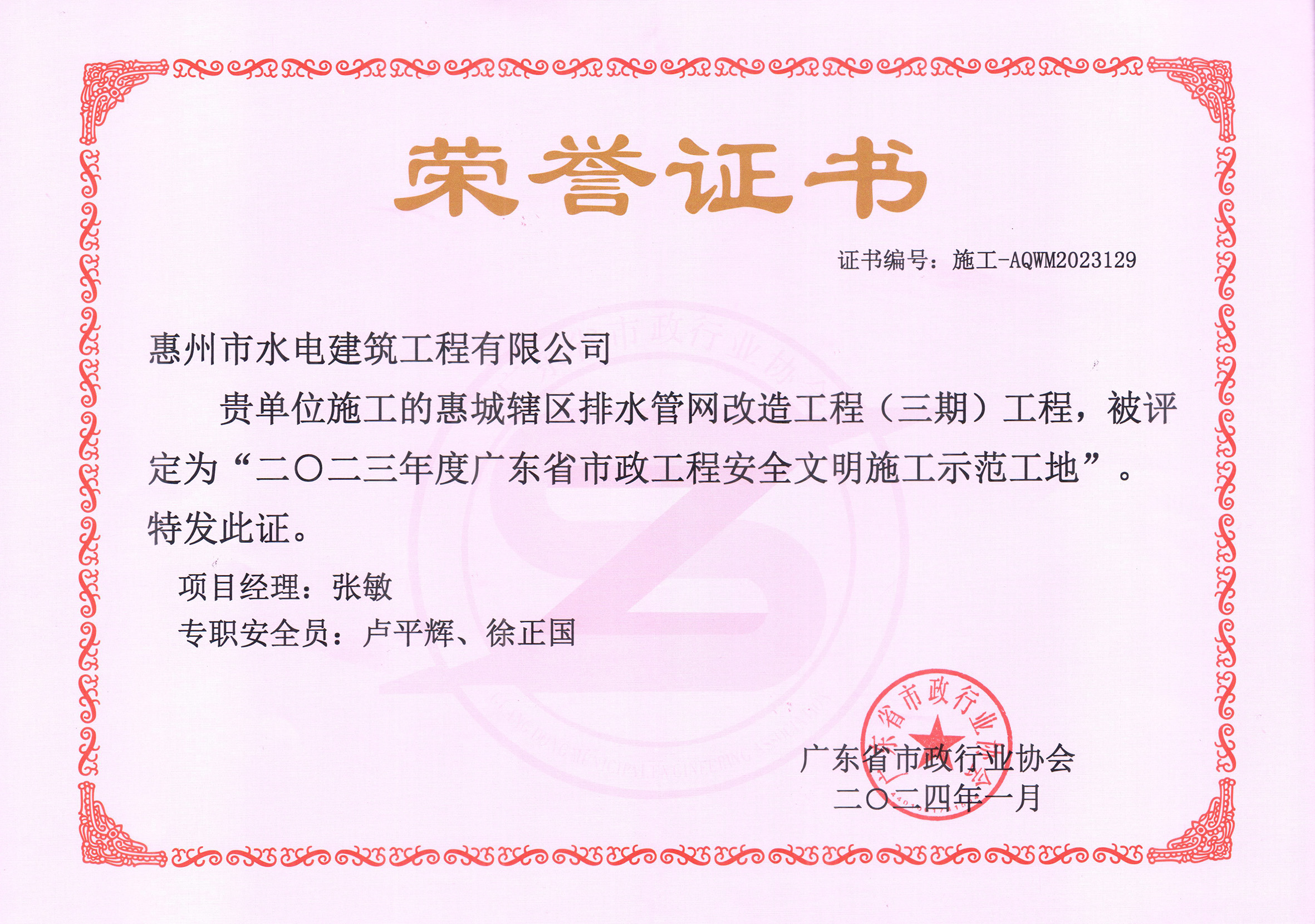 近日,我司收到廣東省市政行業協會發來的榮譽證書,承建的惠城轄區排水管網改造工程(三期)工程榮獲“2023年度廣東省市政工程安全文明施工示范工地”。這是繼惠州市白花河防洪排澇治理工程項目之后,公司在2023年度獲得的又一項省級安全文明工地獎項,為公司年度創優工作劃上圓滿的句號。