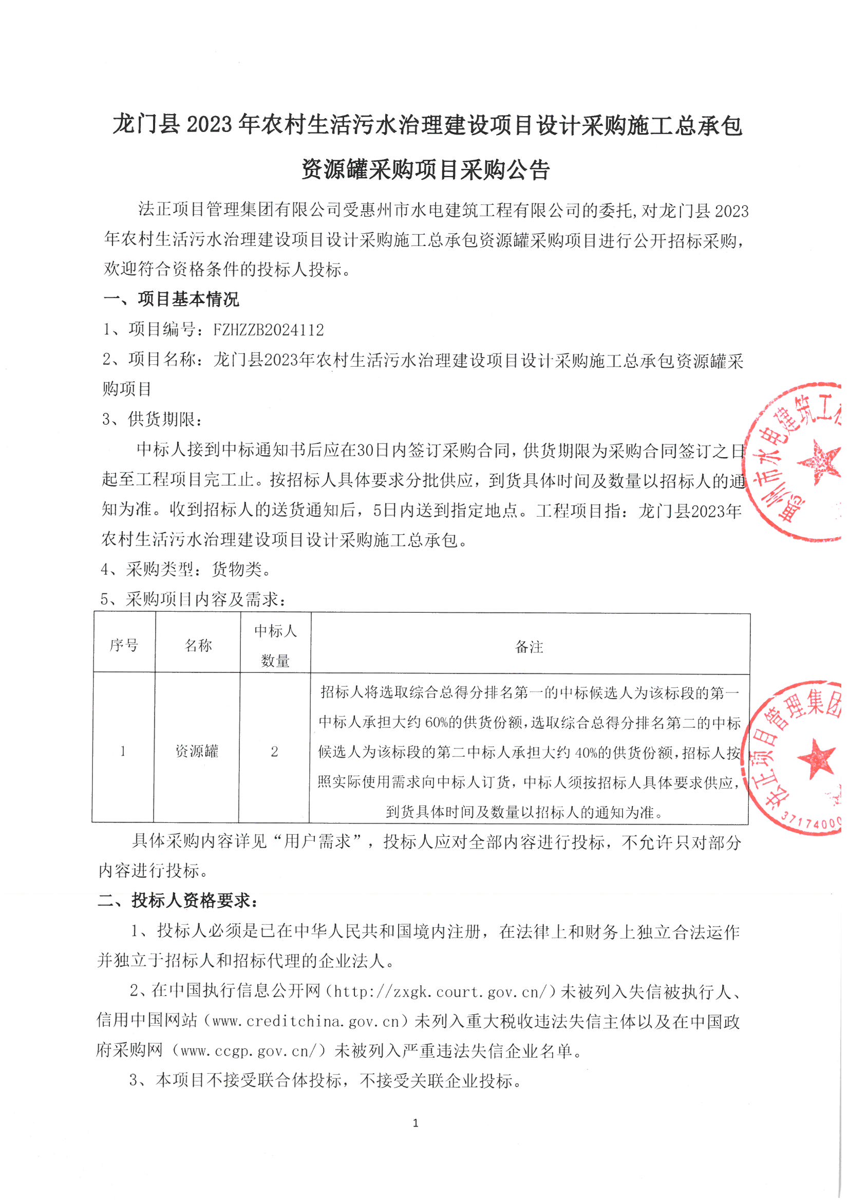 龍門縣2023年農村生活污水治理建設項目設計采購施工總承包資源罐采購項目采購公告