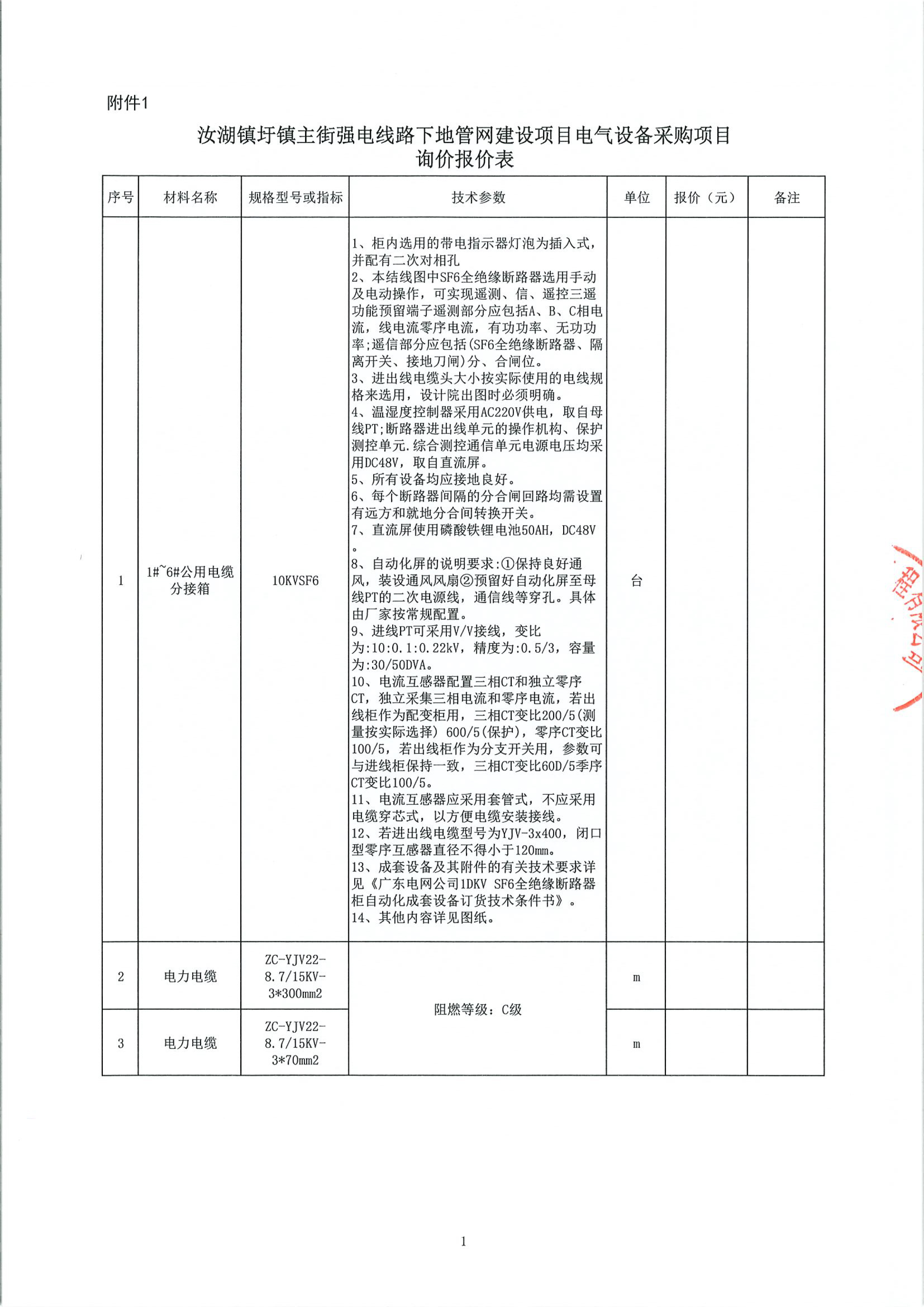 附件1:汝湖鎮圩鎮主街強電線路下地管網建設項目電氣設備采購項目詢價報價表