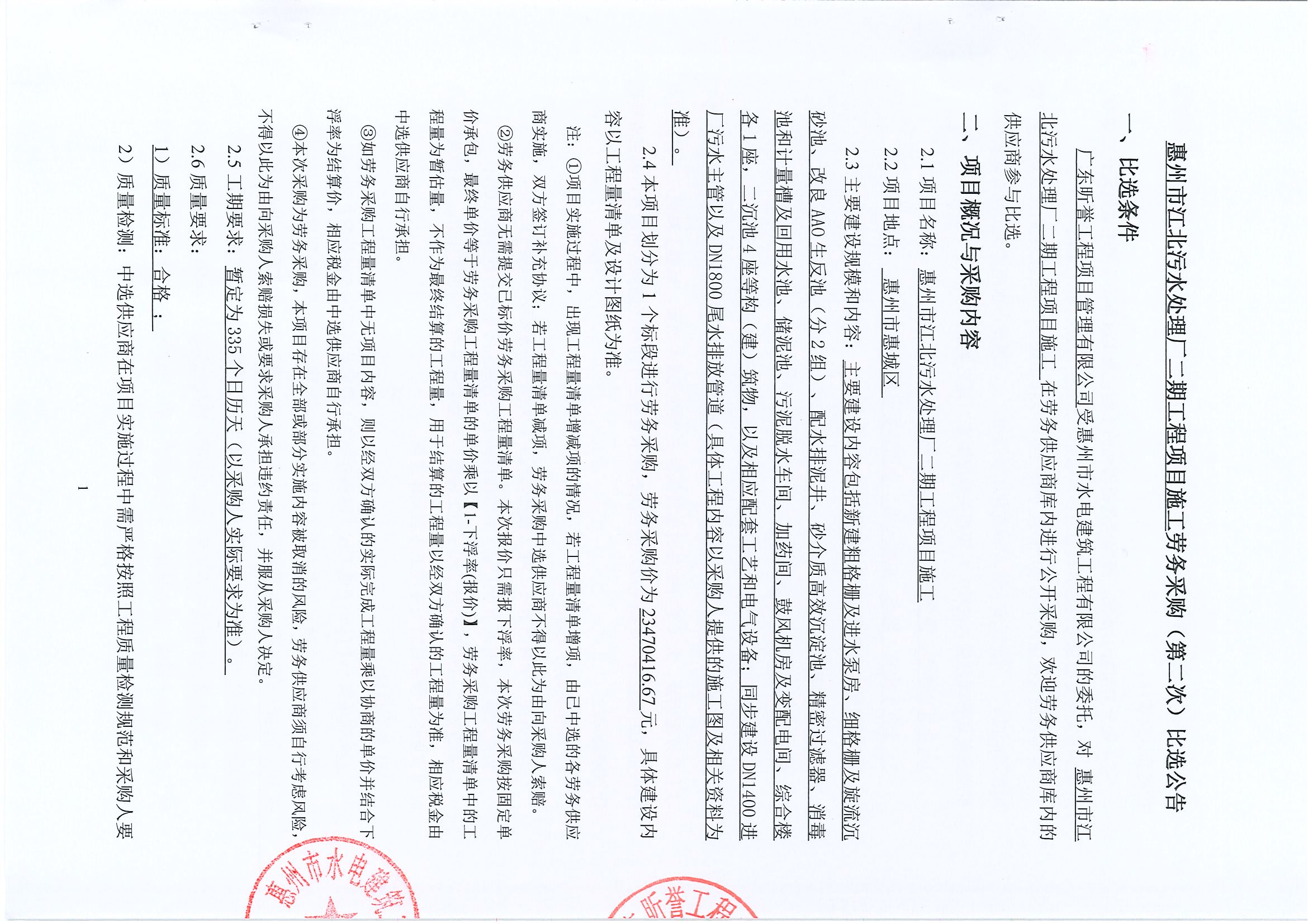 惠州市江北污水處理廠二期工程項目施工勞務采購(第二次)比選公告
