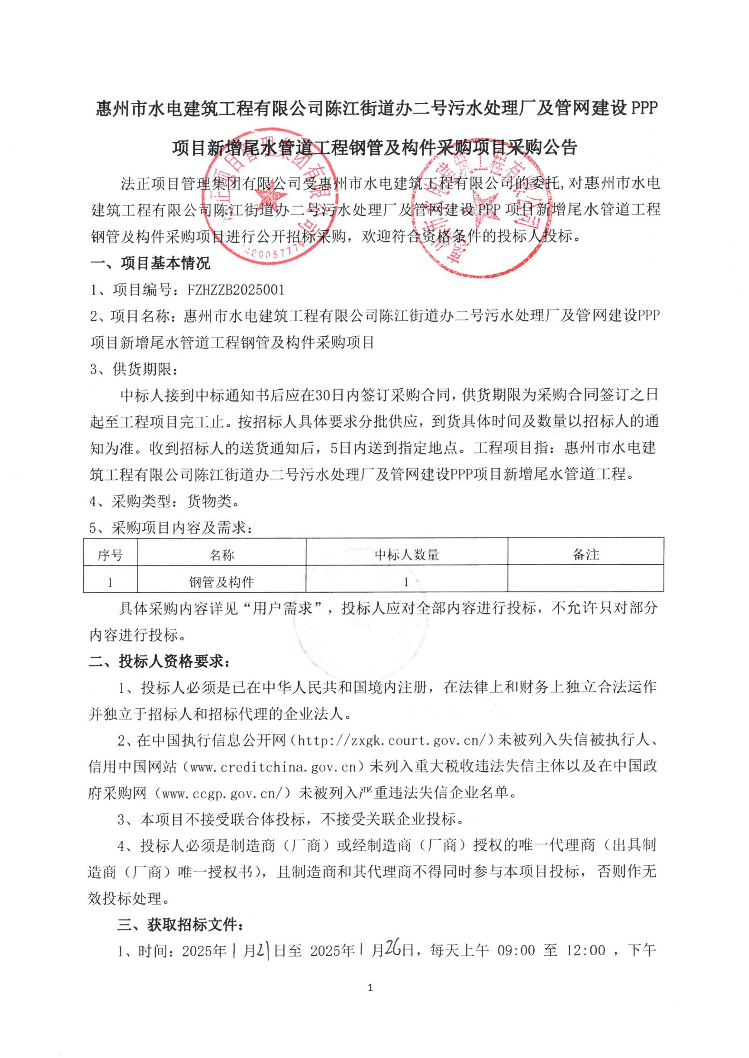 陳江街道辦二號污水處理廠及管網建設PPP項目新增尾水管道工程鋼管及構件采購項目采購公告