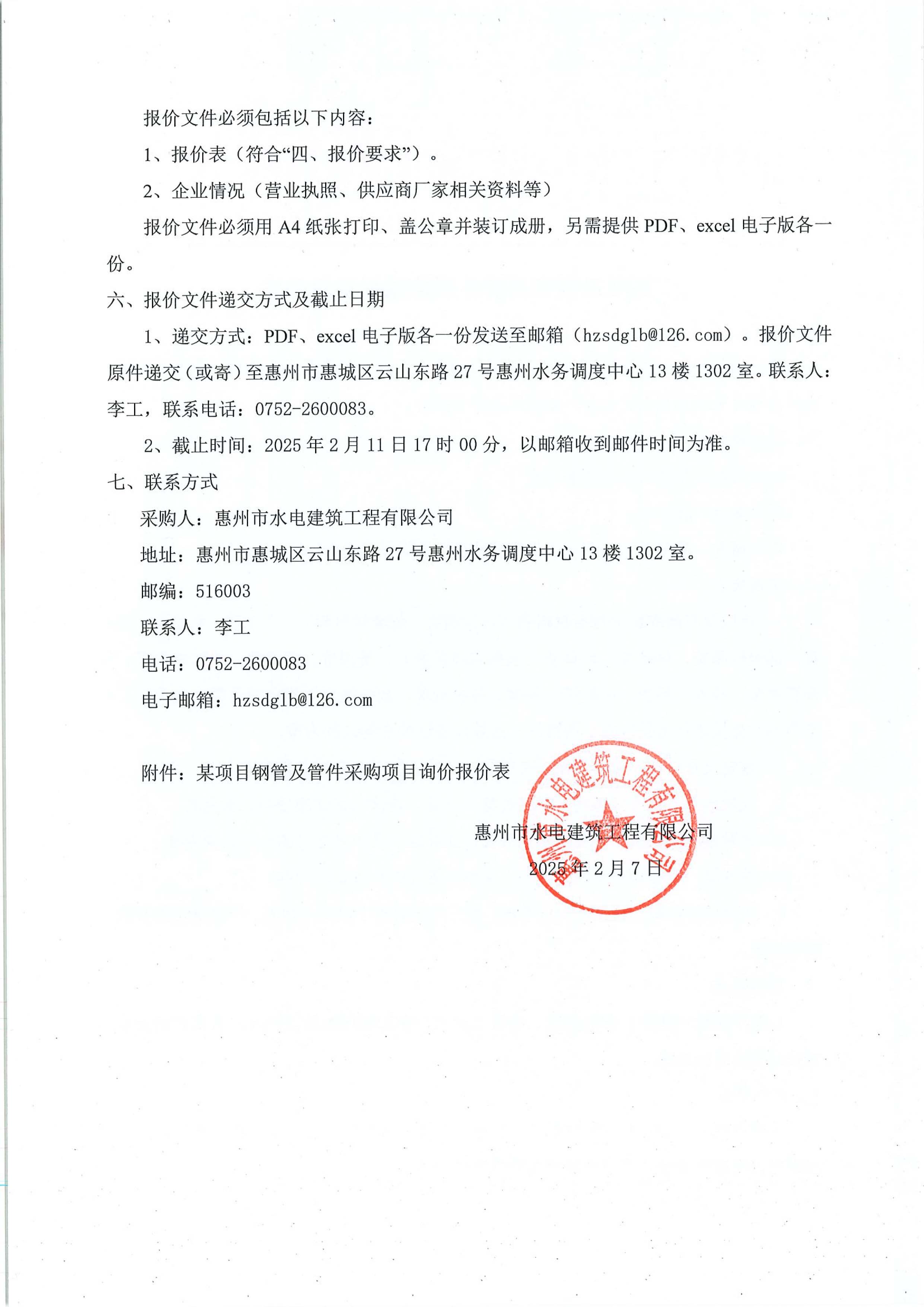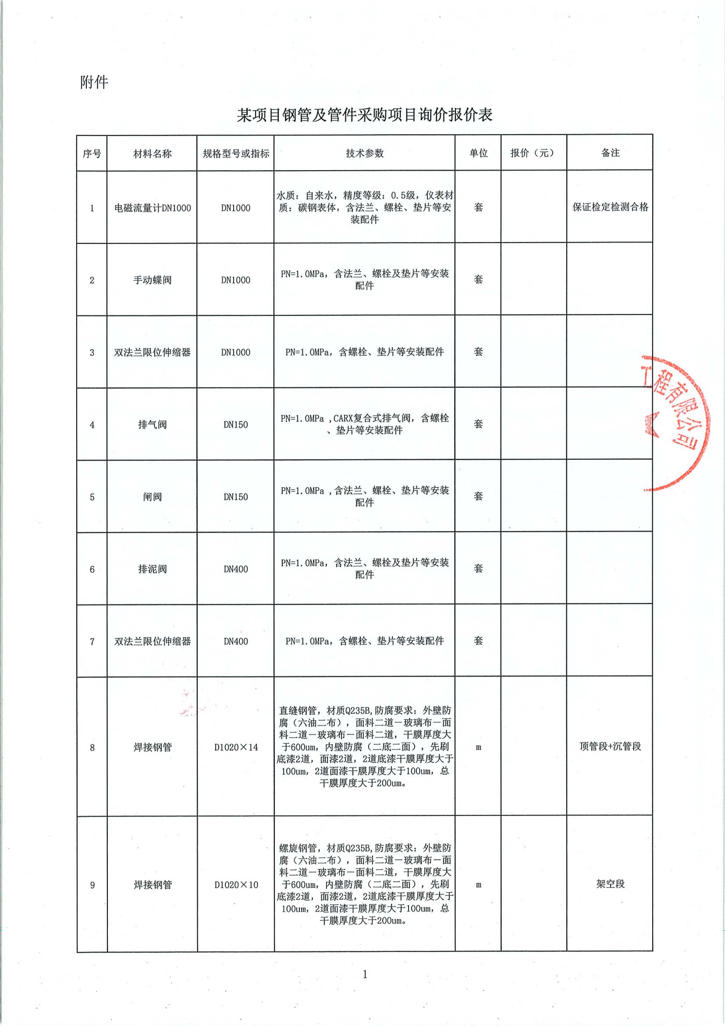 某項目鋼管及管件采購項目詢價公告