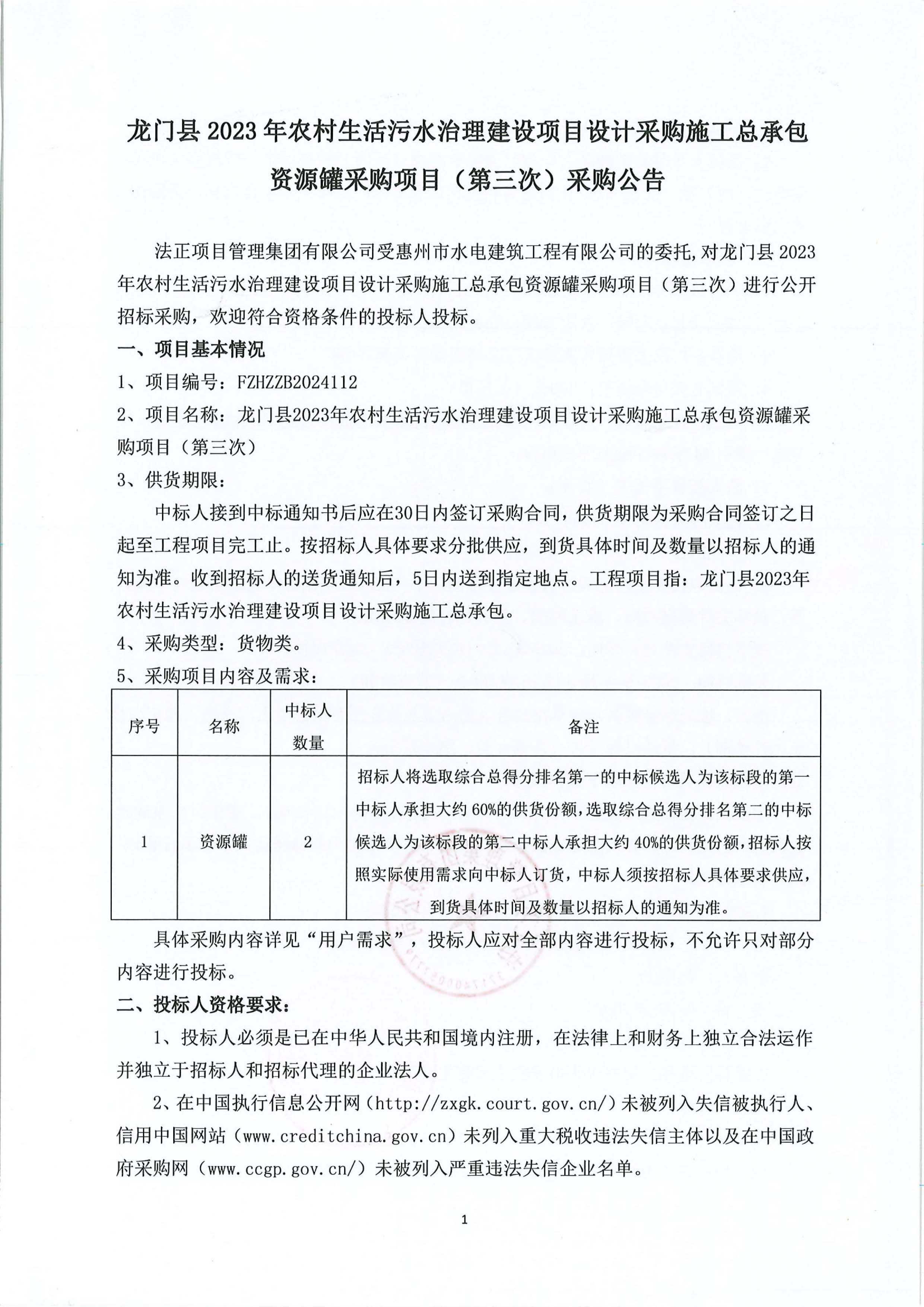 龍門縣2023年農(nóng)村生活污水治理建設項目設計采購施工總承包資源罐采購項目(第三次)采購公告