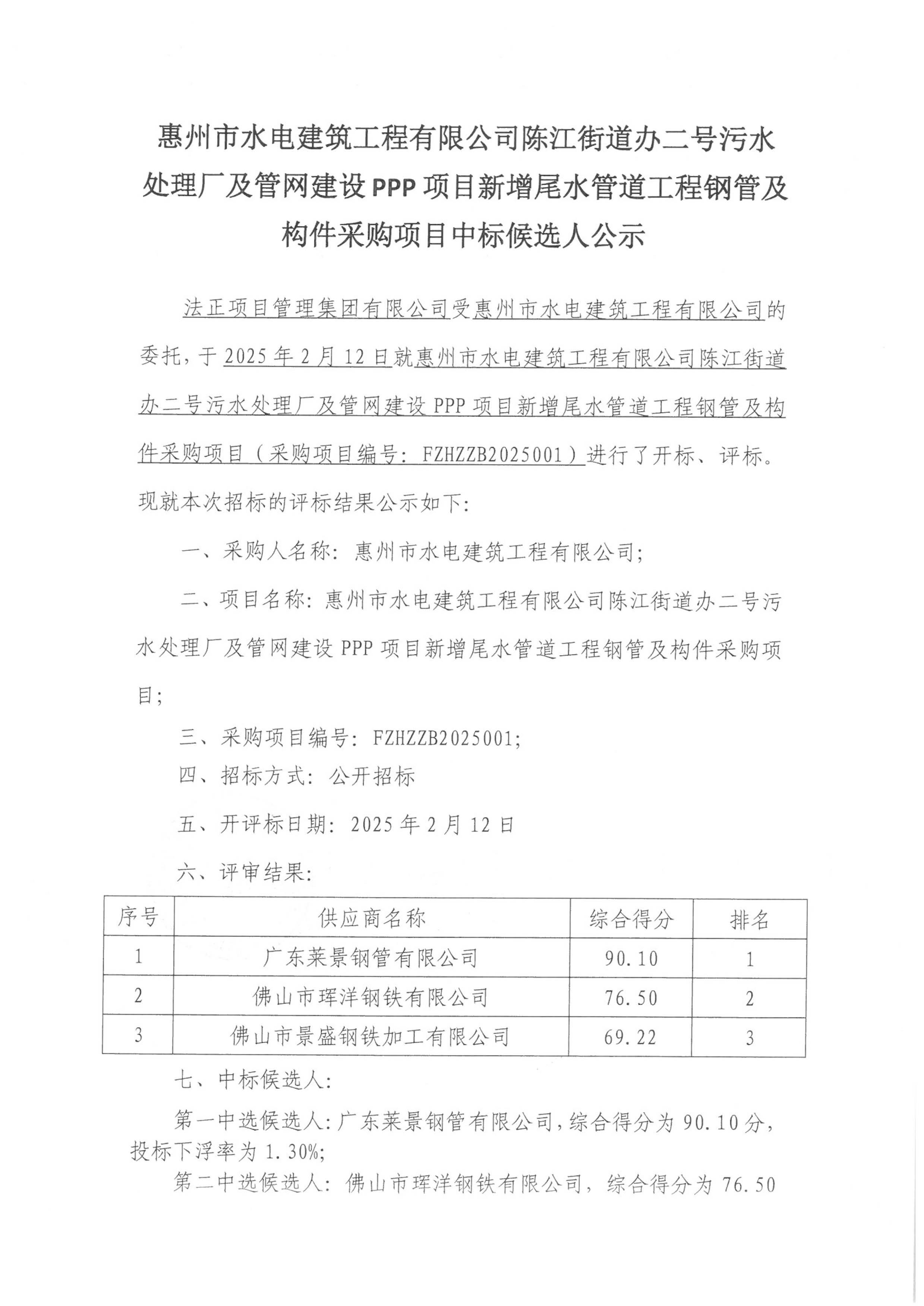 陳江街道辦二號污水處理廠及管網建設PPP項目新增尾水管道工程鋼管及構件采購項目中標候選人公示