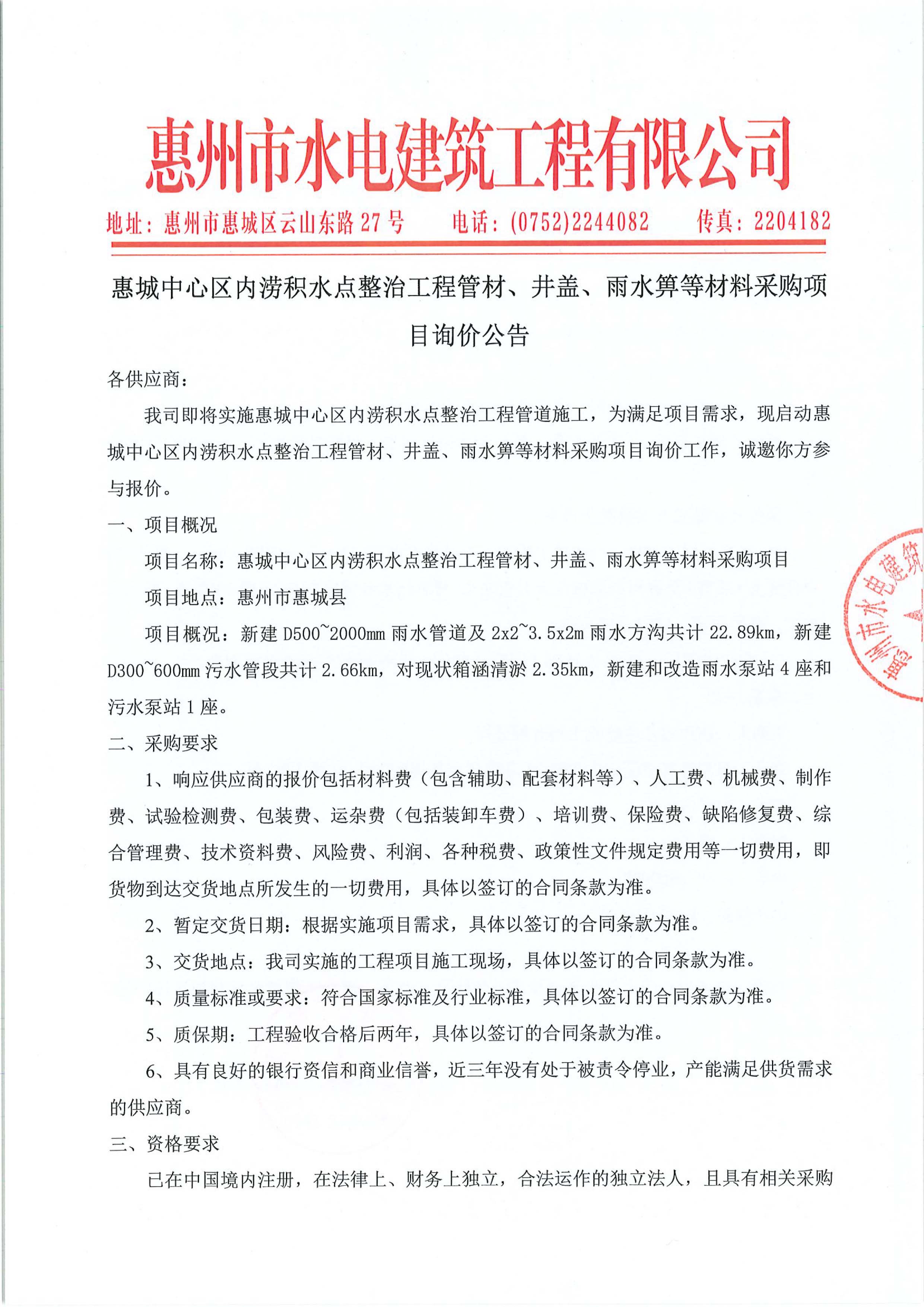 惠城中心區(qū)內(nèi)澇積水點整治工程管材、井蓋、雨水箅等材料采購項目詢價公告