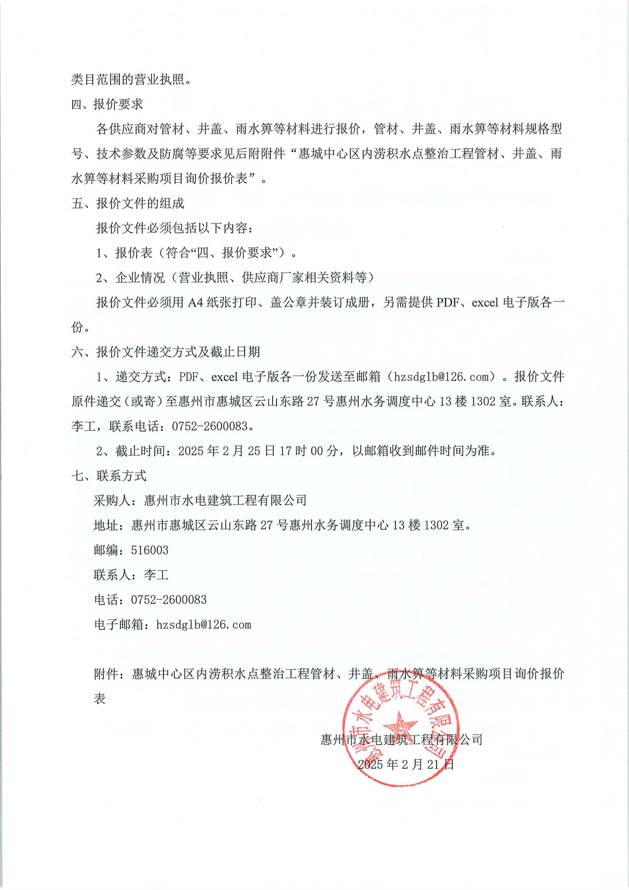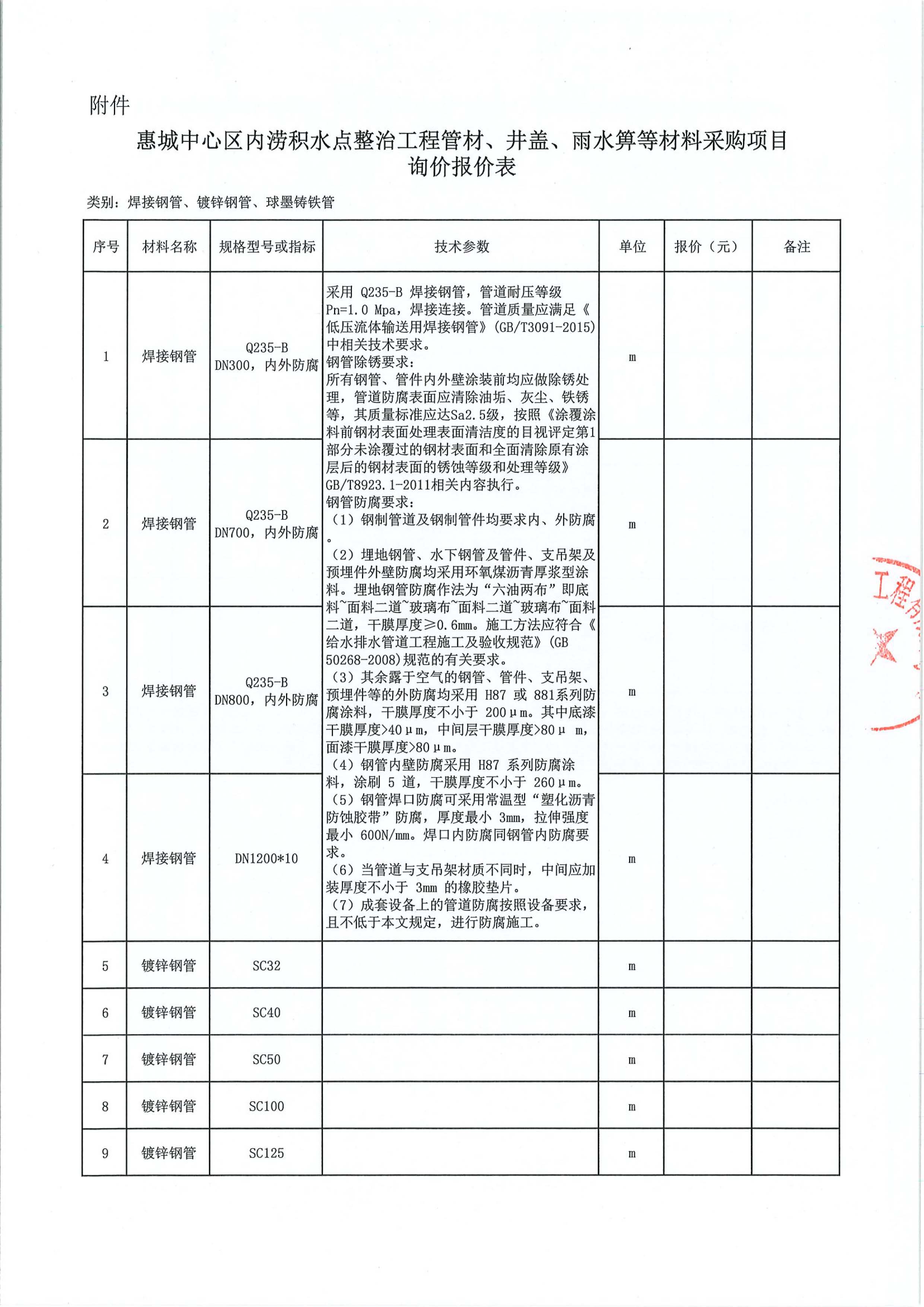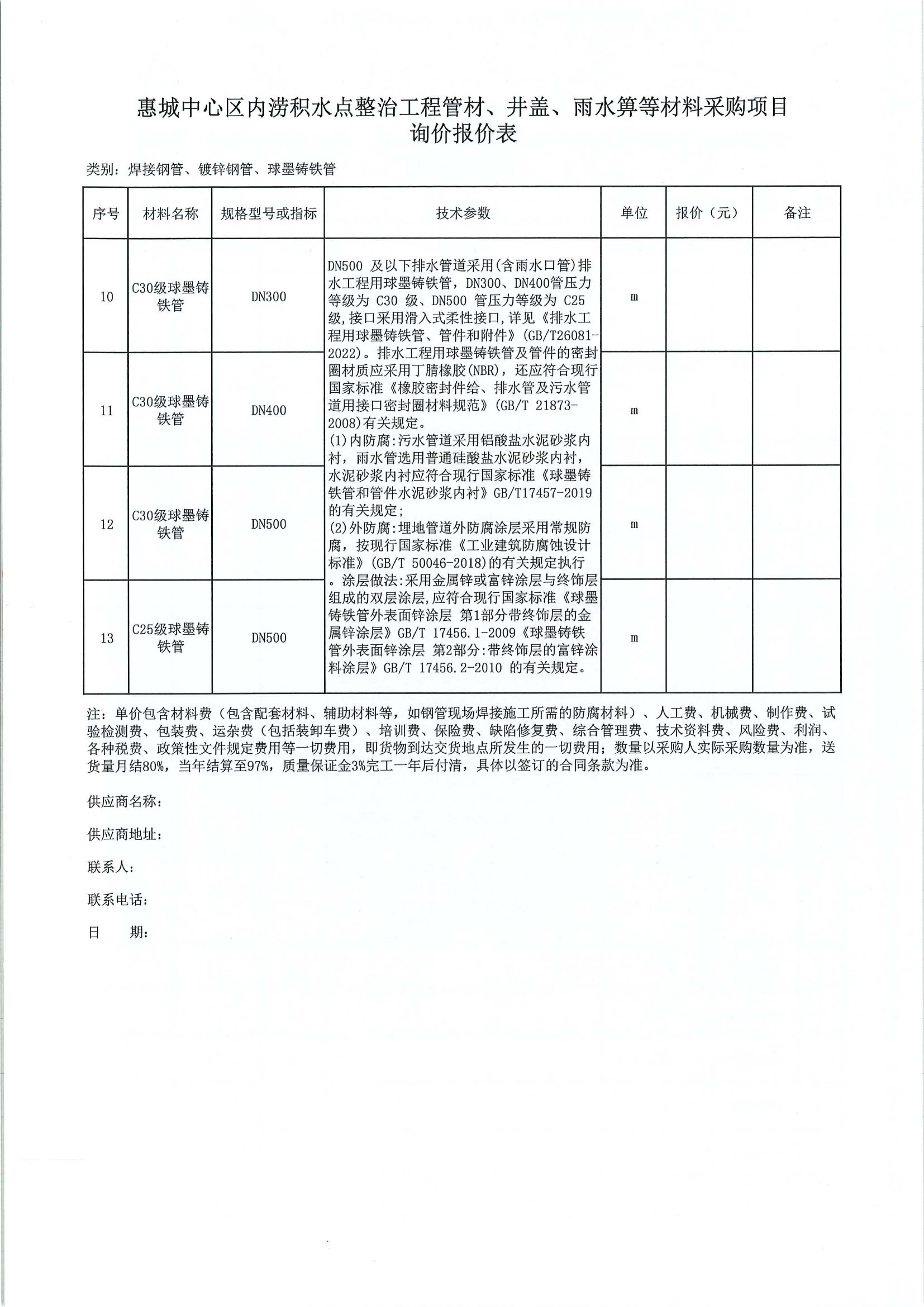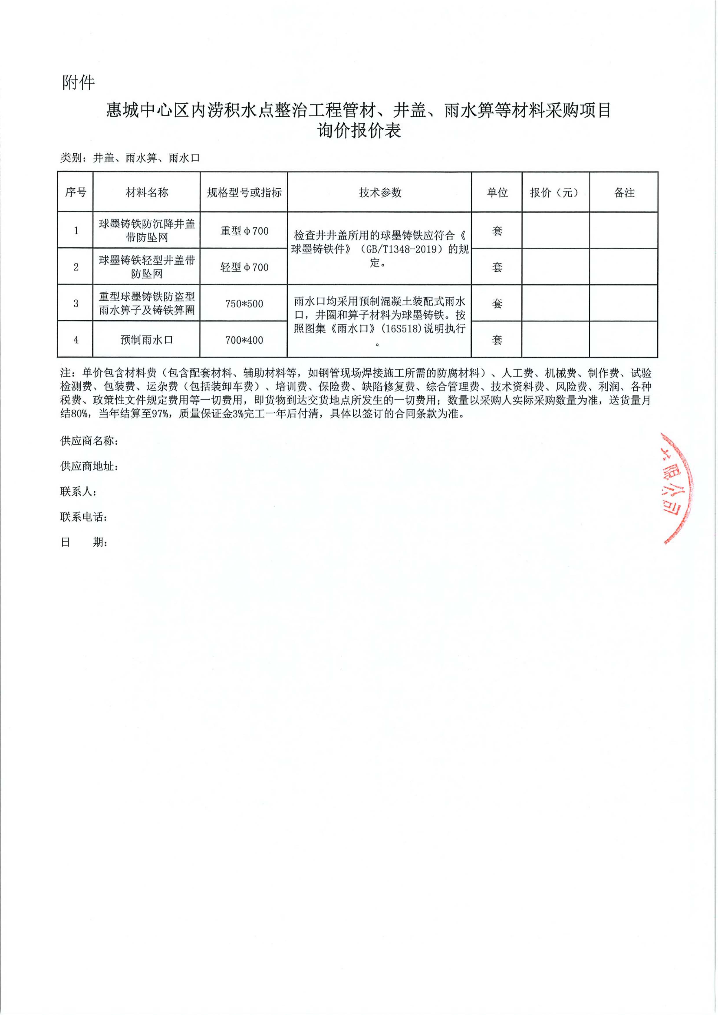 惠城中心區(qū)內(nèi)澇積水點整治工程管材、井蓋、雨水箅等材料采購項目詢價公告附件: