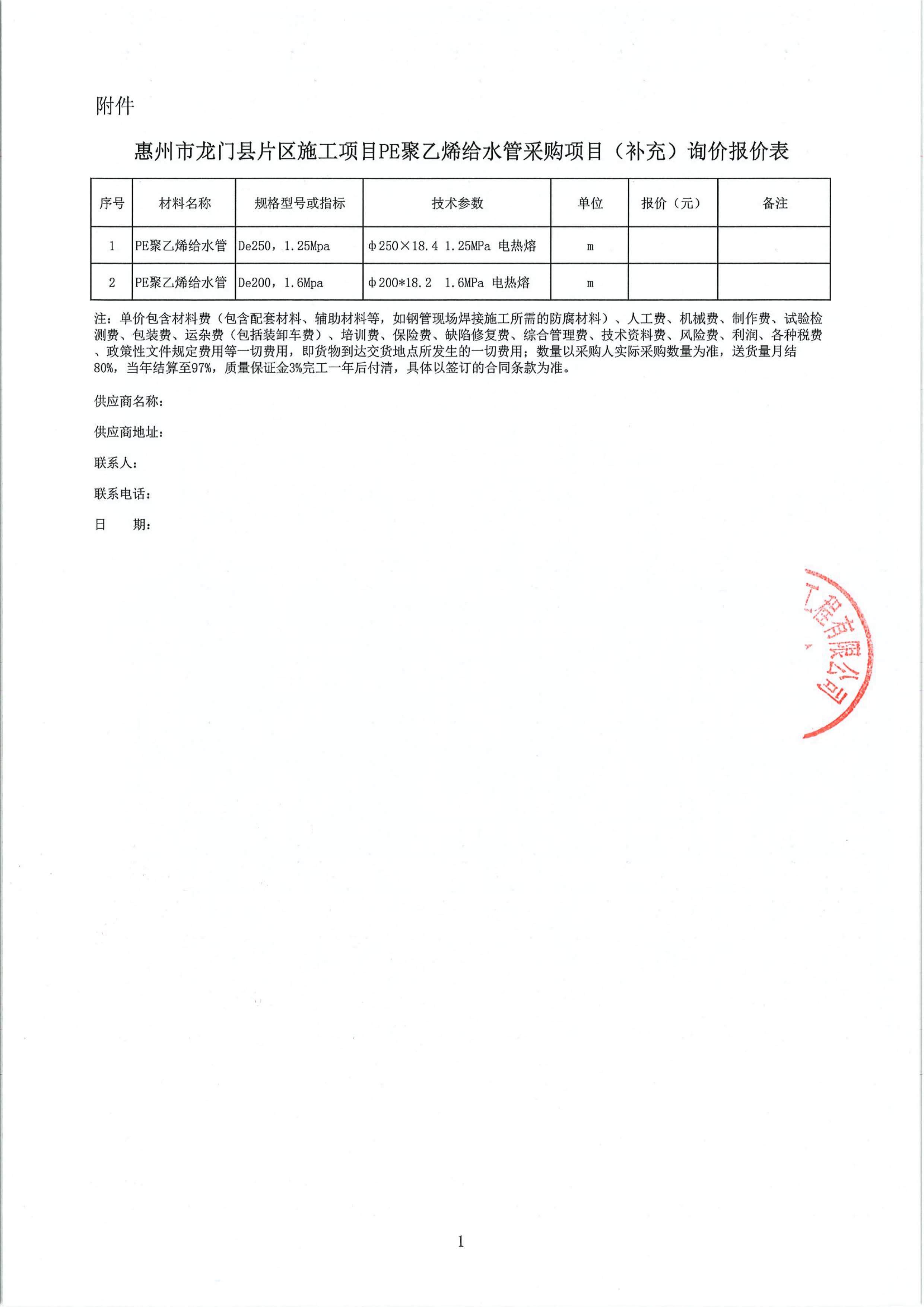 惠州市龍門縣片區(qū)施工項目PE聚乙烯給水管采購項目(補(bǔ)充)詢價公告附件: