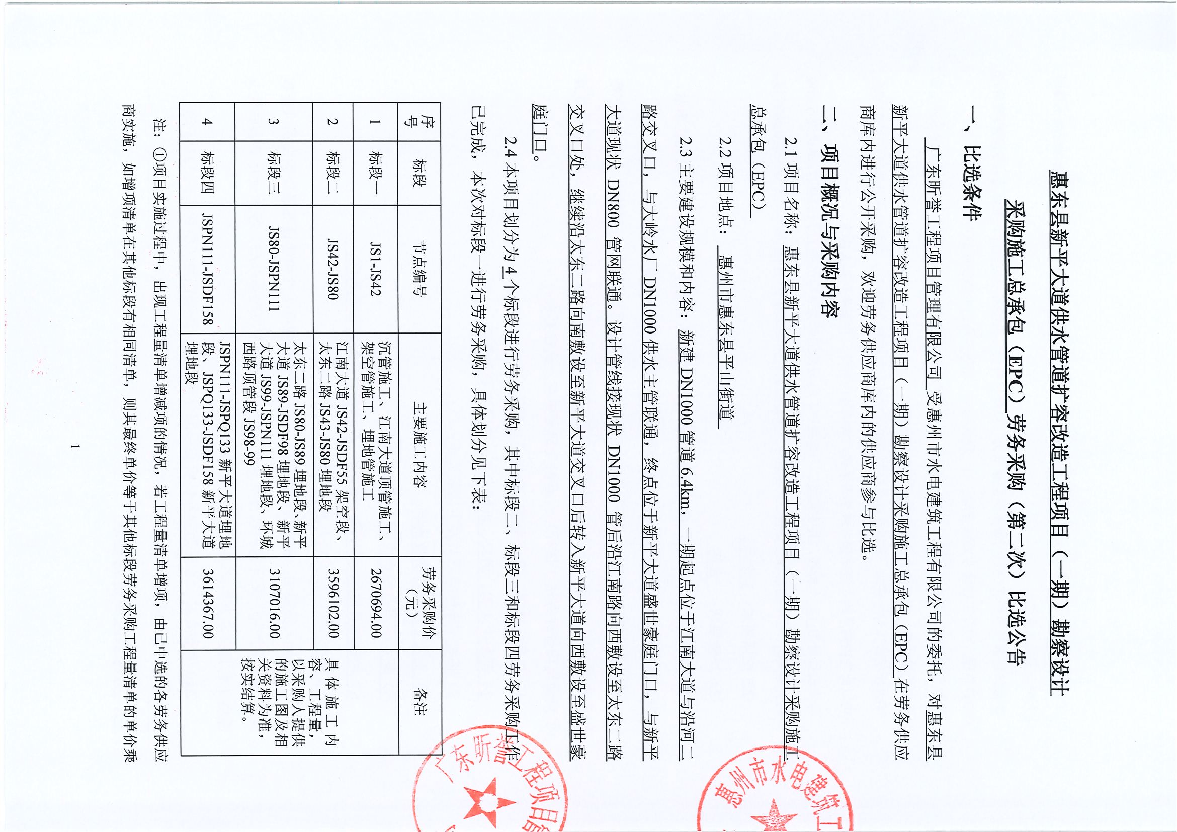 惠東縣新平大道供水管道擴容改造工程項目(一期)勘察設計 采購施工總承包(EPC)勞務采購(第二次)比選公告
