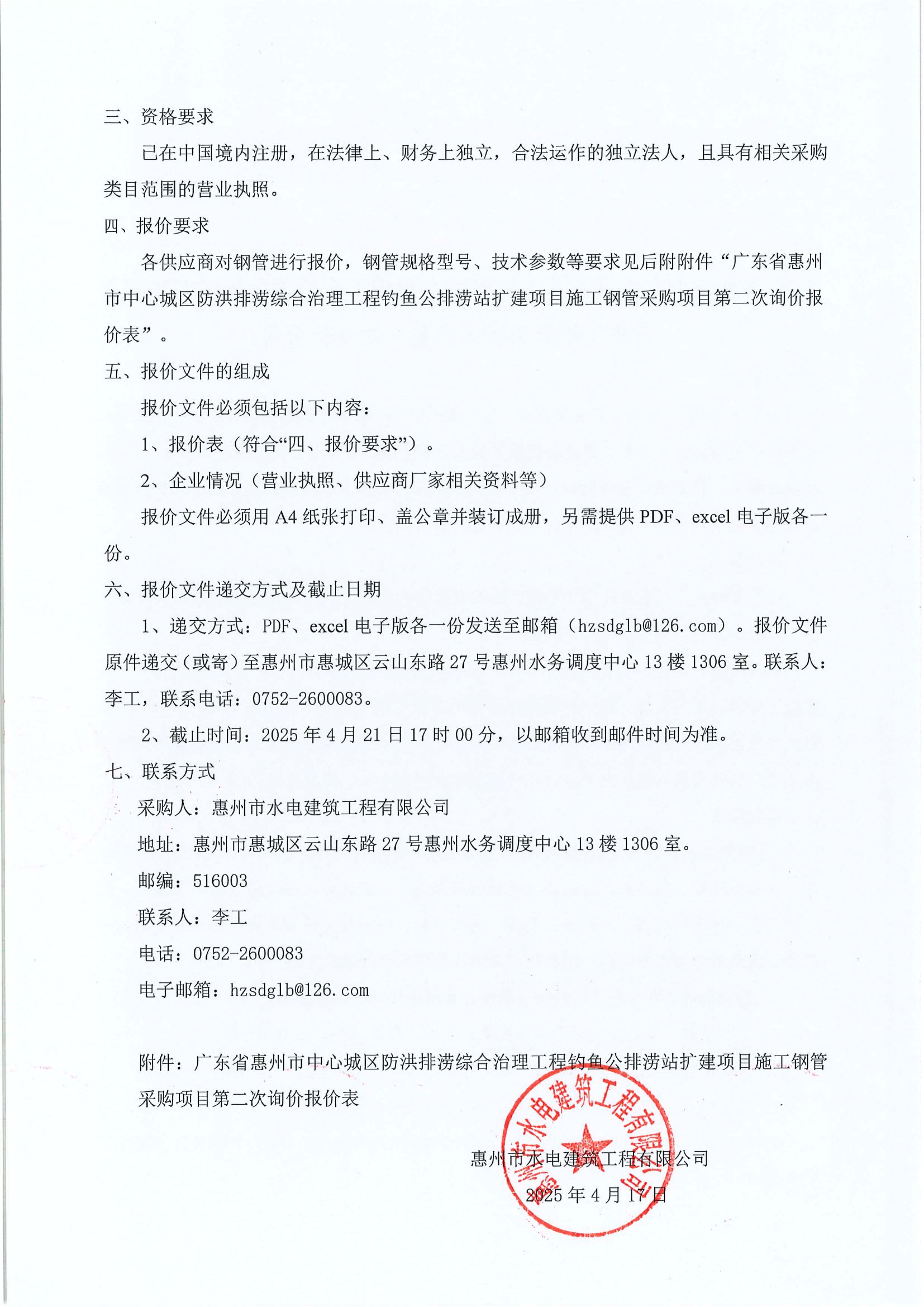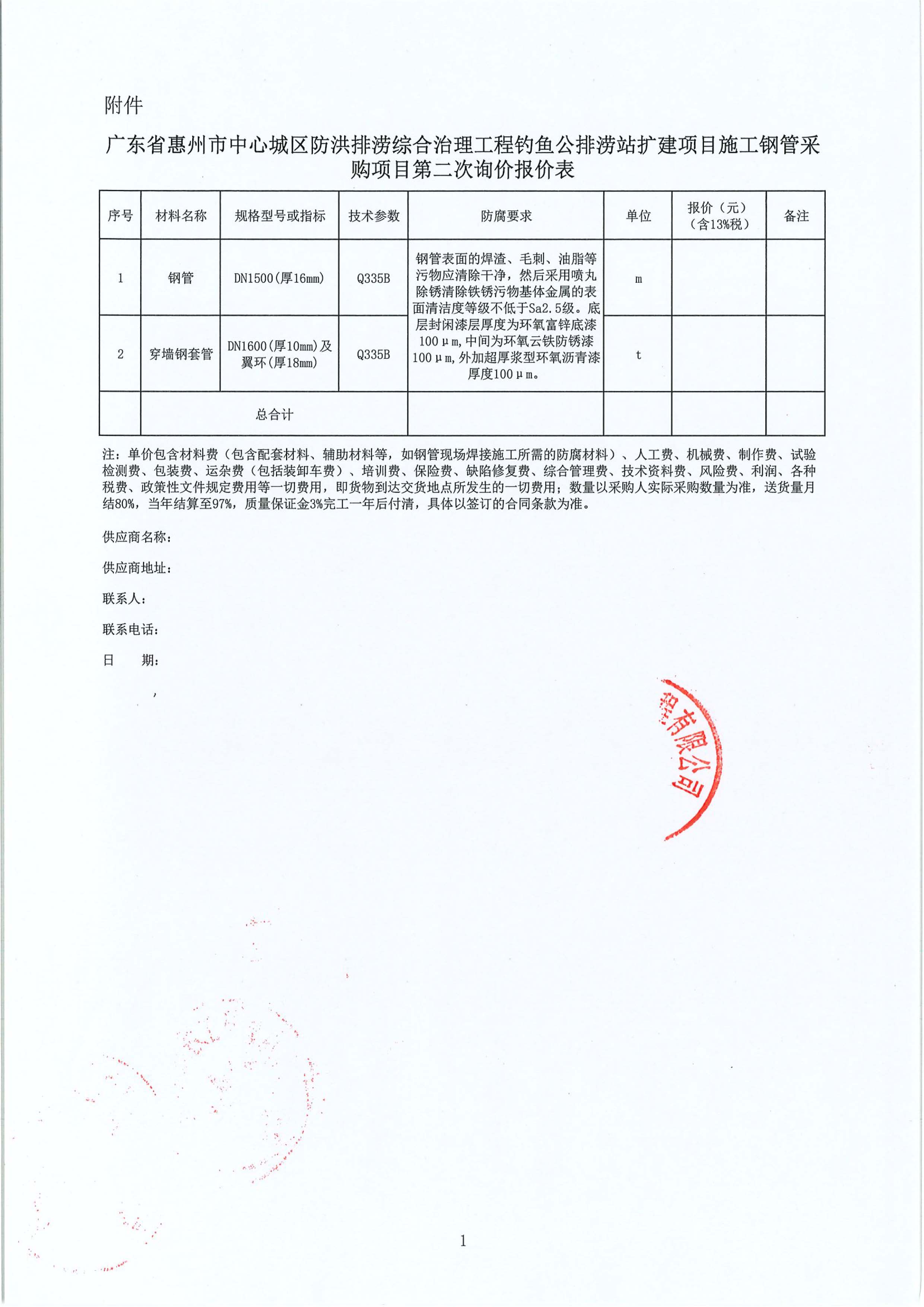 廣東省惠州市中心城區防洪排澇綜合治理工程釣魚公排澇站擴建項目施工鋼管采購項目第二次詢價公告附件: