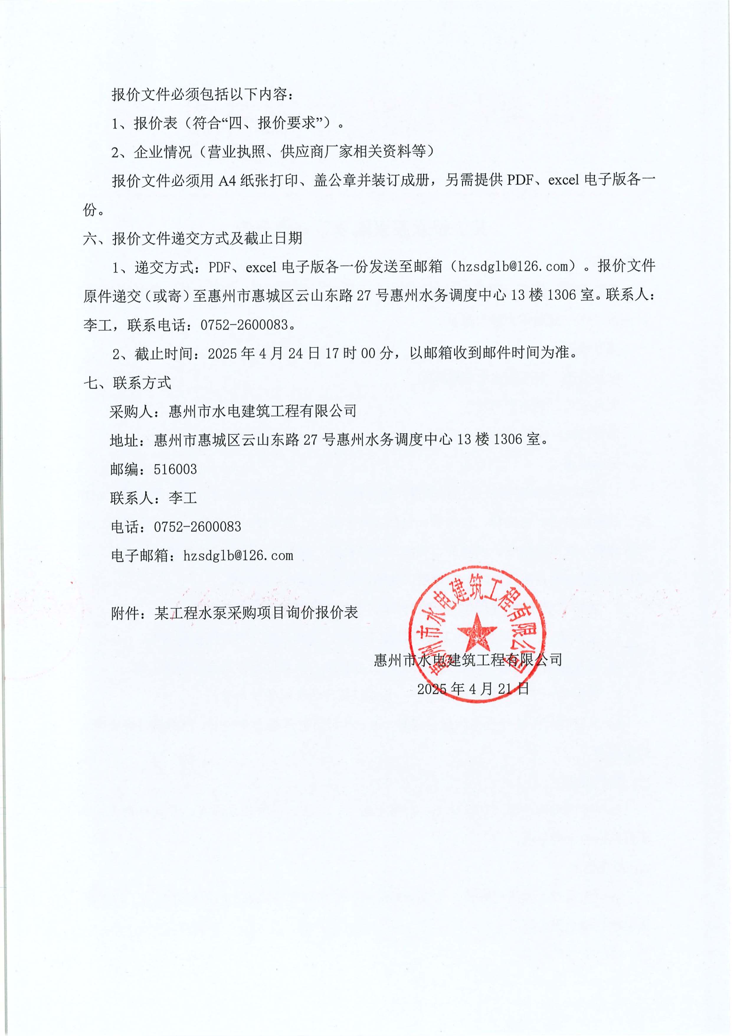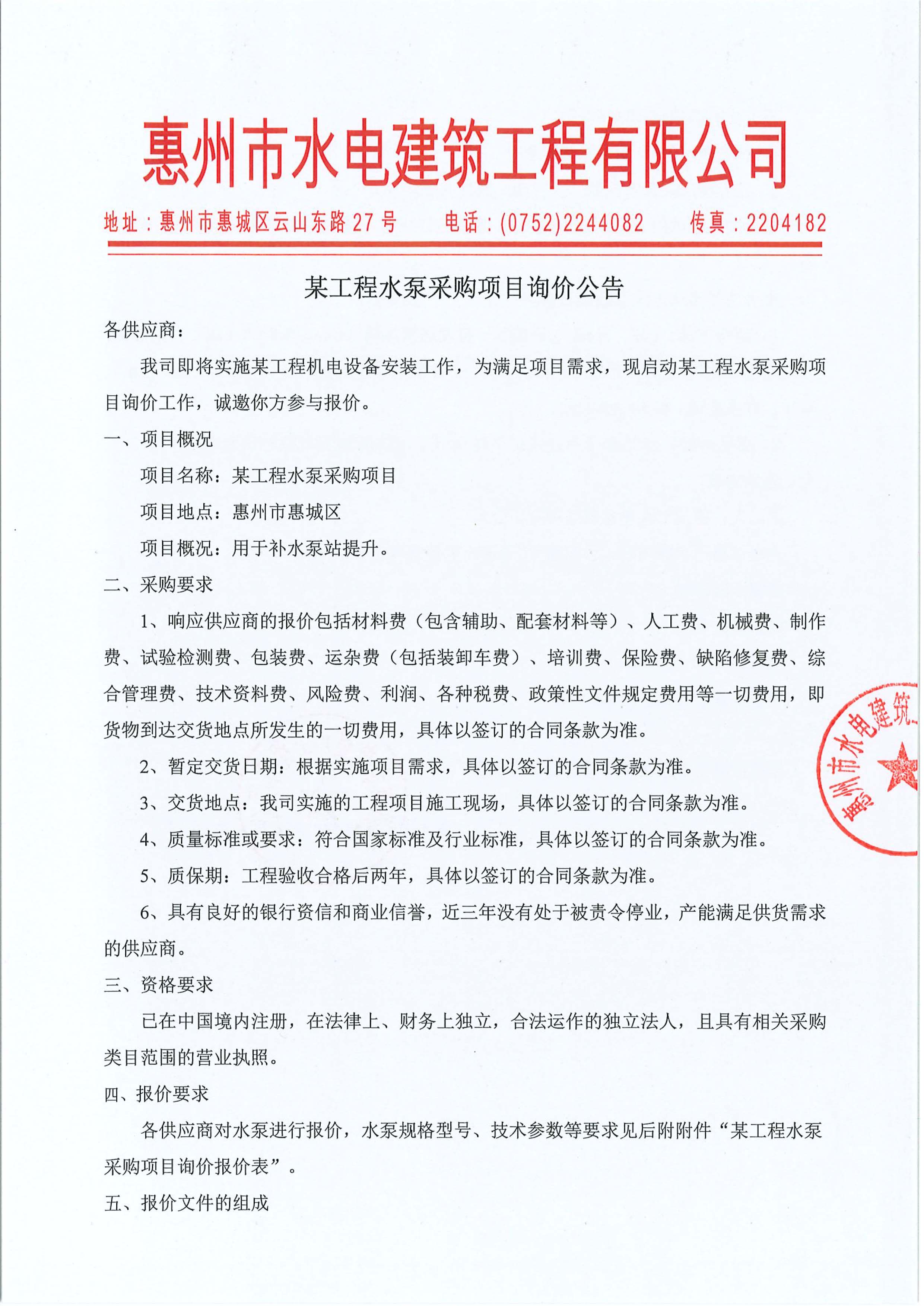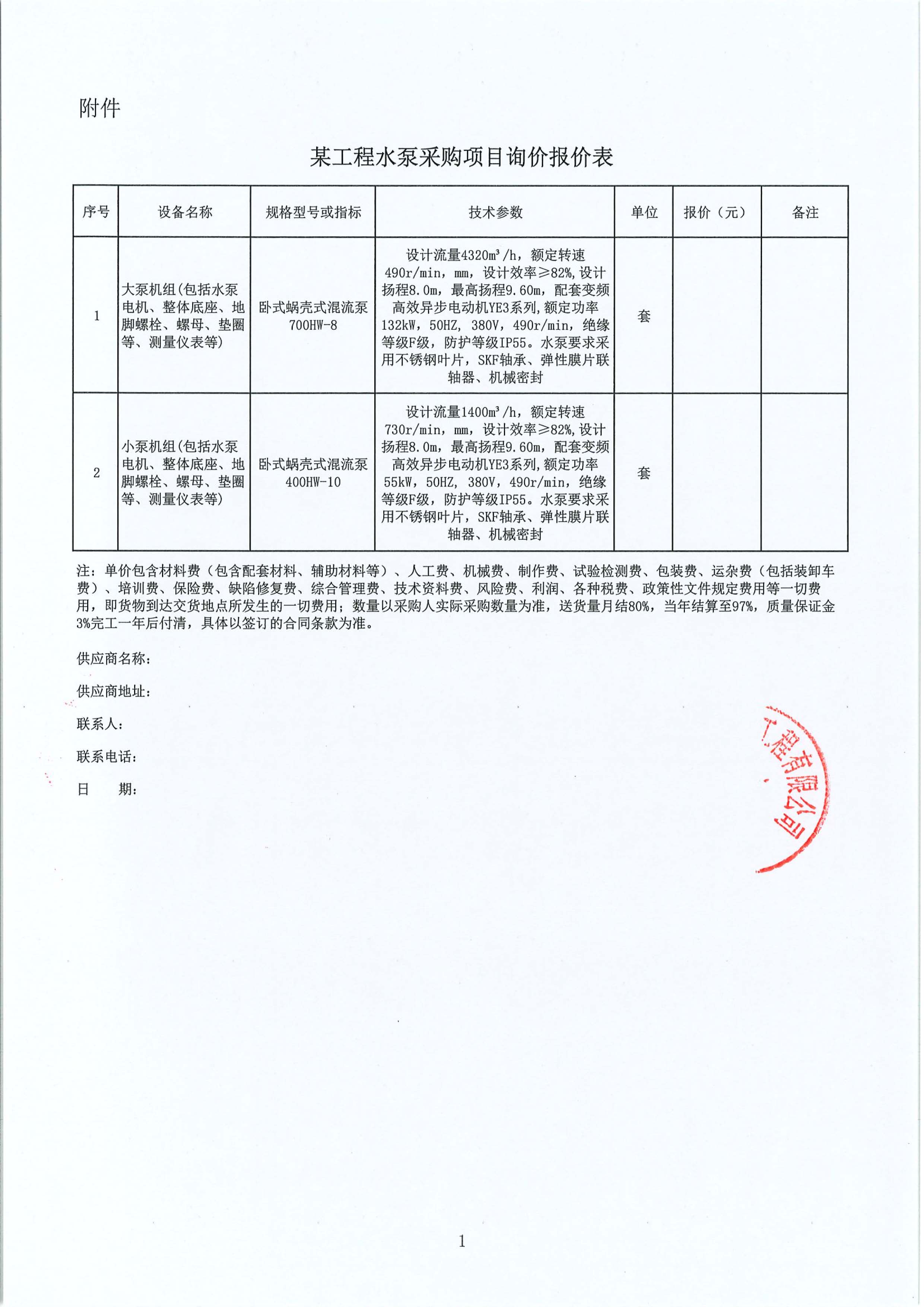 某工程水泵采購項目詢價公告附件: