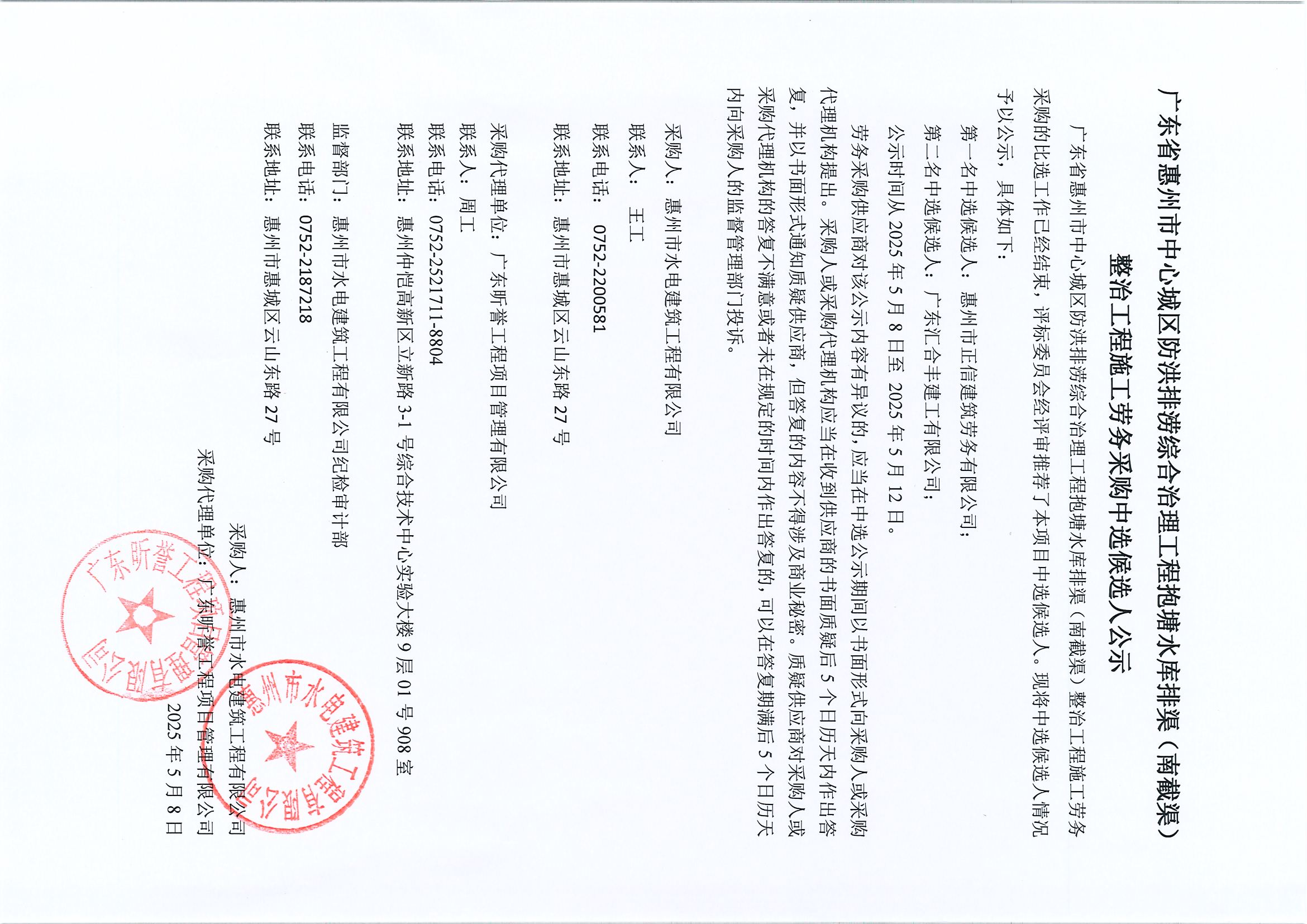 廣東省惠州市中心城區防洪排澇綜合治理工程抱塘水庫排渠(南截渠)整治工程施工勞務采購中選候選人公示
