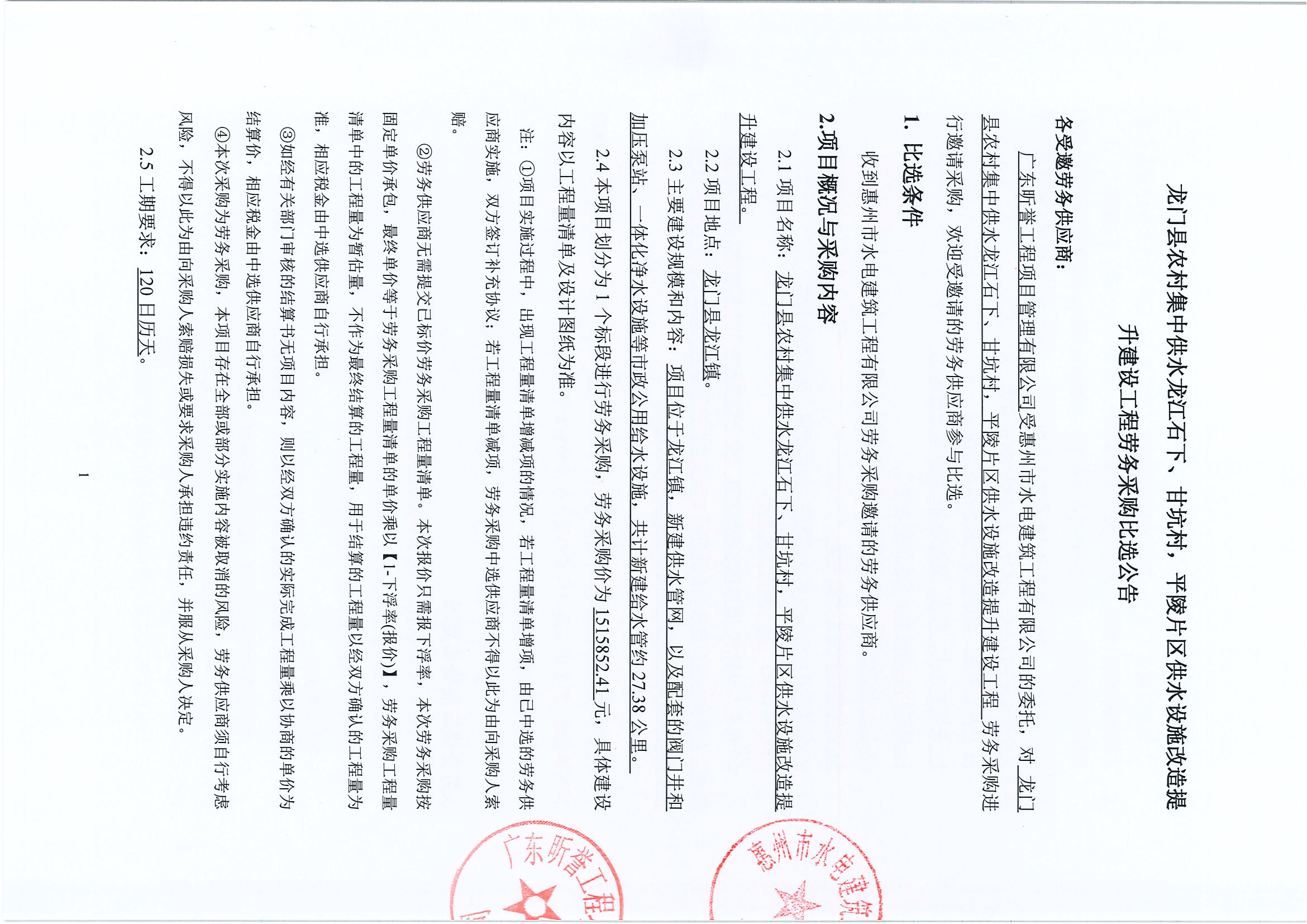 龍門縣農村集中供水縣城擴網至龍華片區大坪、石下塘、花竹村供水管網建設工程勞務采購比選公告