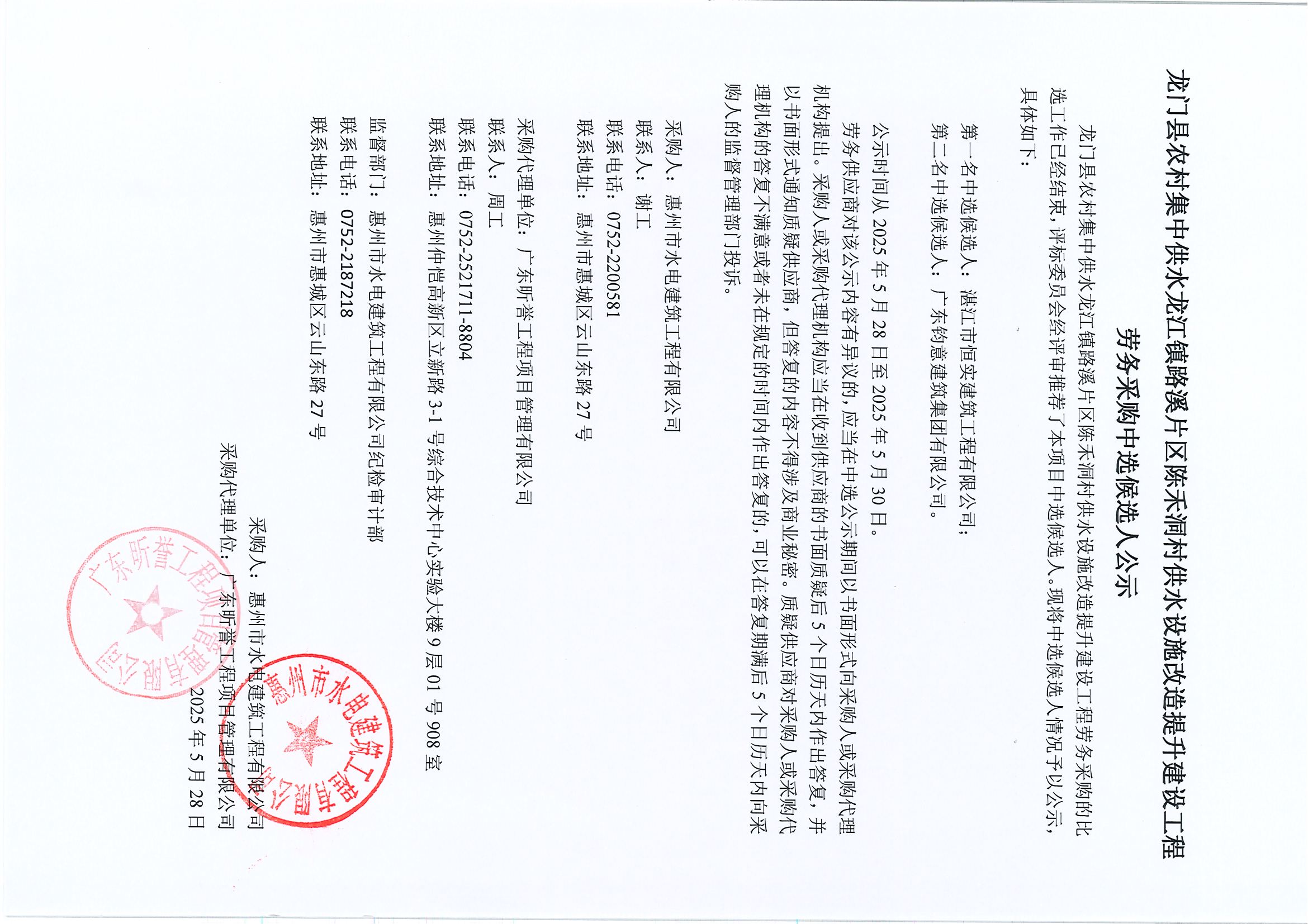 龍門縣農村集中供水龍江鎮路溪片區陳禾洞村供水設施改造提升建設工程勞務采購中選候選人公示