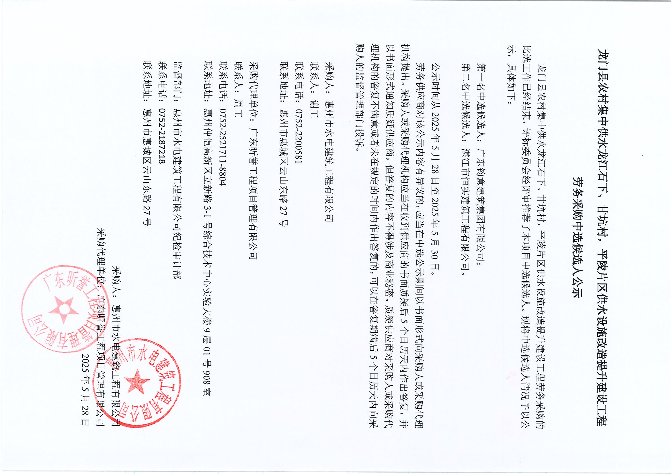 龍門縣農村集中供水縣城擴網至龍華片區大坪、石下塘、花竹村供水管網建設工程勞務采購中選候選人公示