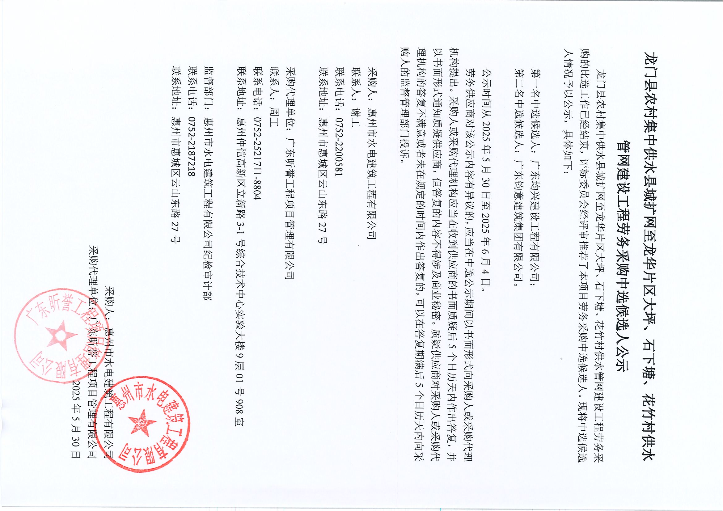 龍門縣農村集中供水縣城擴網至龍華片區大坪、石下塘、花竹村供水管網建設工程勞務采購中選候選人公示