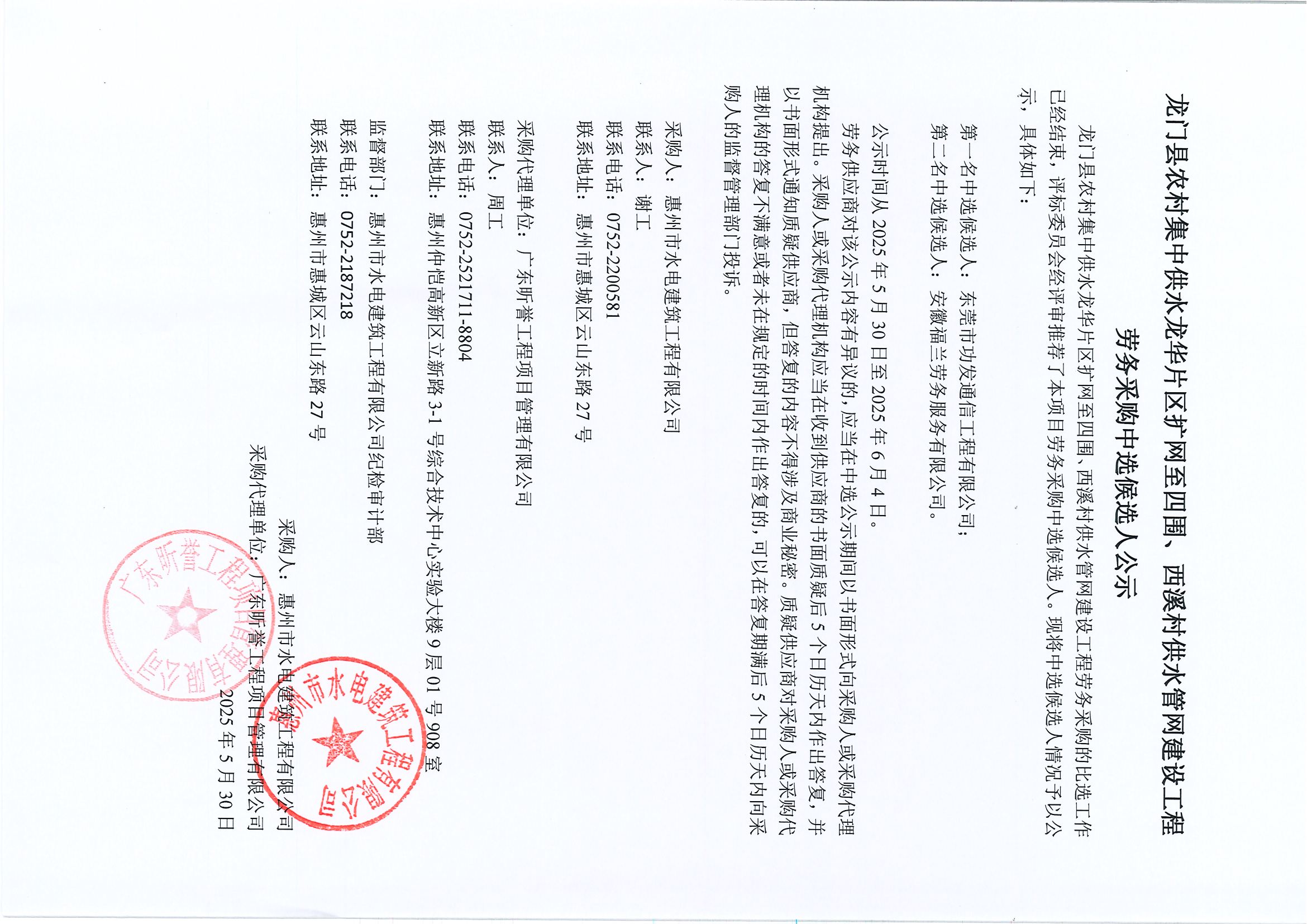 龍門縣農村集中供水縣城擴網至龍華片區大坪、石下塘、花竹村供水管網建設工程勞務采購中選候選人公示