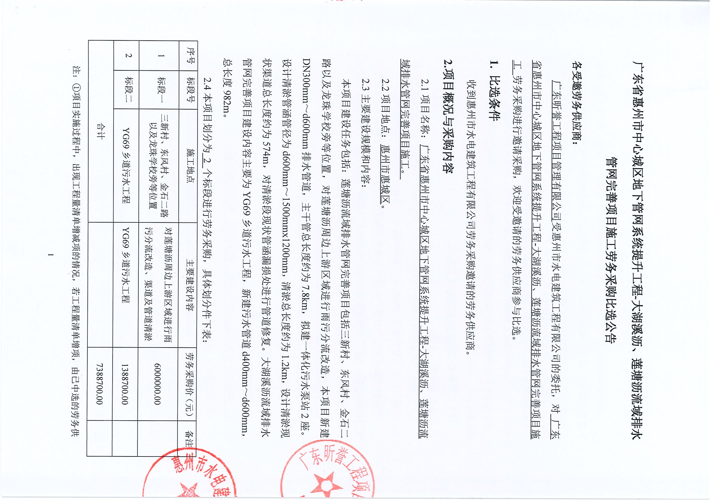 廣東省惠州市中心城區地下管網系統提升工程-大湖溪瀝、蓮塘瀝流域排水管網完善項目施工勞務采購比選公告