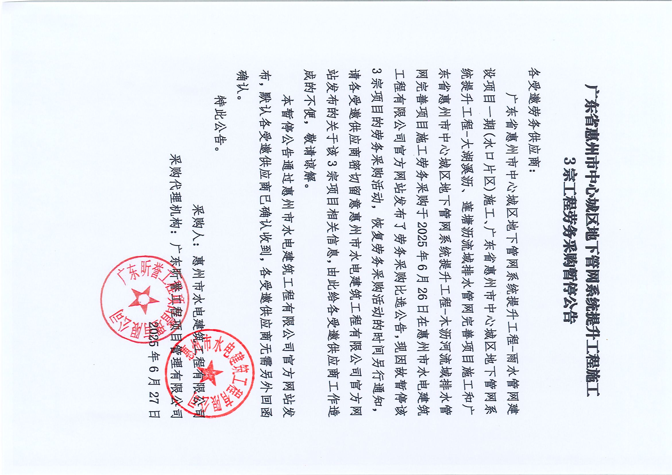 廣東省惠州市中心城區(qū)地下管網(wǎng)系統(tǒng)提升工程施工 3宗工程勞務采購暫停公告