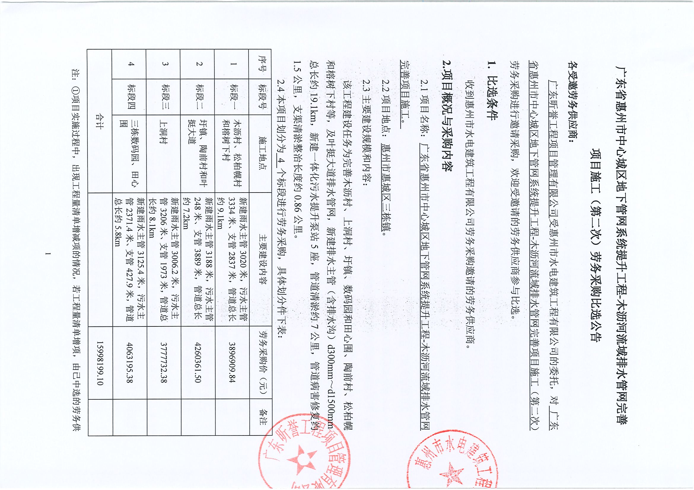 廣東省惠州市中心城區地下管網系統提升工程-木瀝河流域排水管網完善項目施工(第二次)勞務采購比選公告