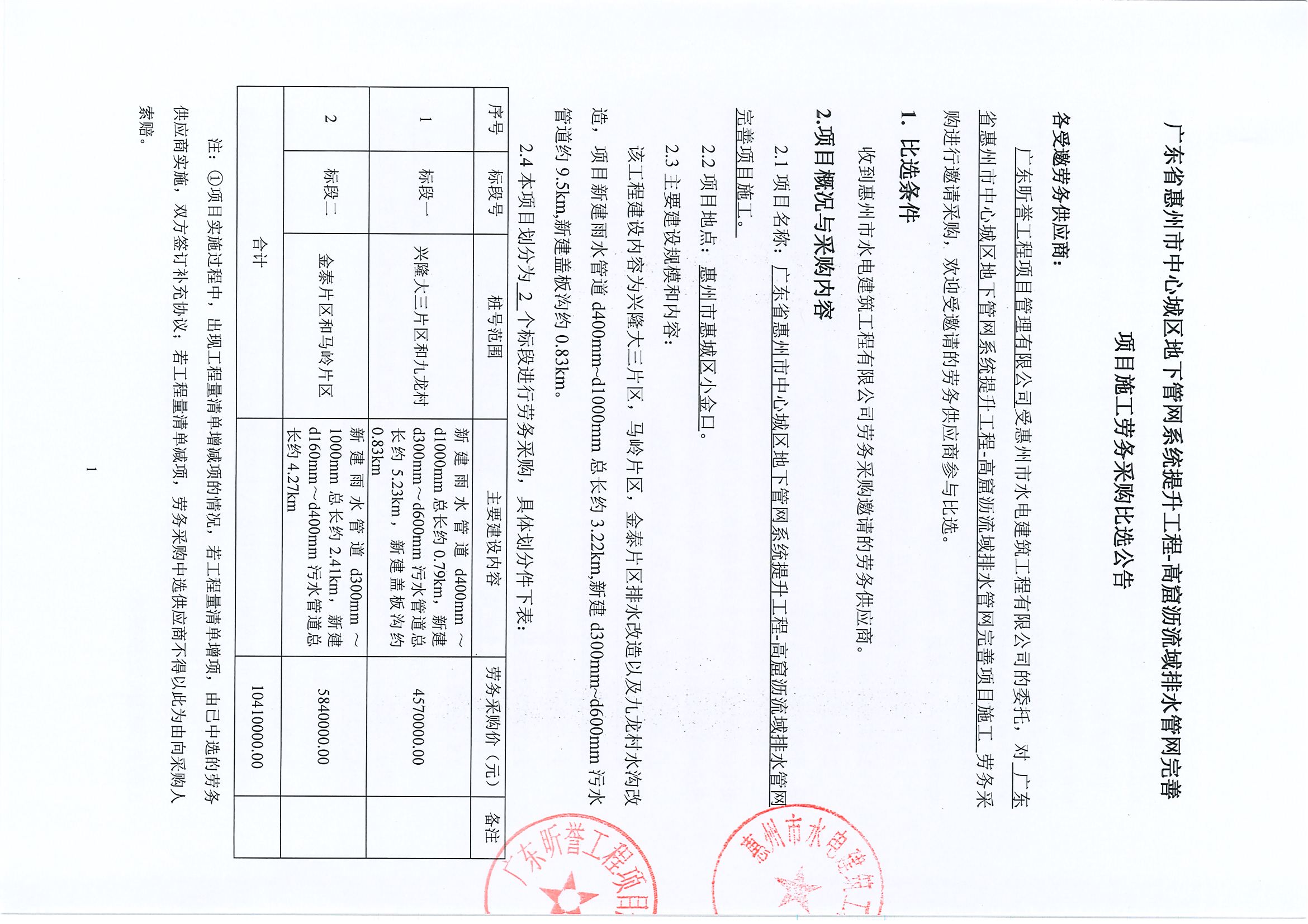 廣東省惠州市中心城區地下管網系統提升工程-高窟瀝流域排水管網完善項目施工勞務采購比選公告