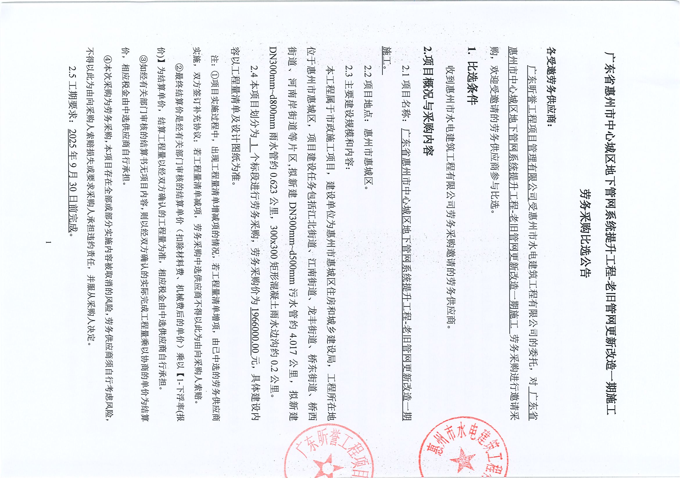 廣東省惠州市中心城區(qū)地下管網(wǎng)系統(tǒng)提升工程-老舊管網(wǎng)更新改造一期施工勞務(wù)采購(gòu)比選公告