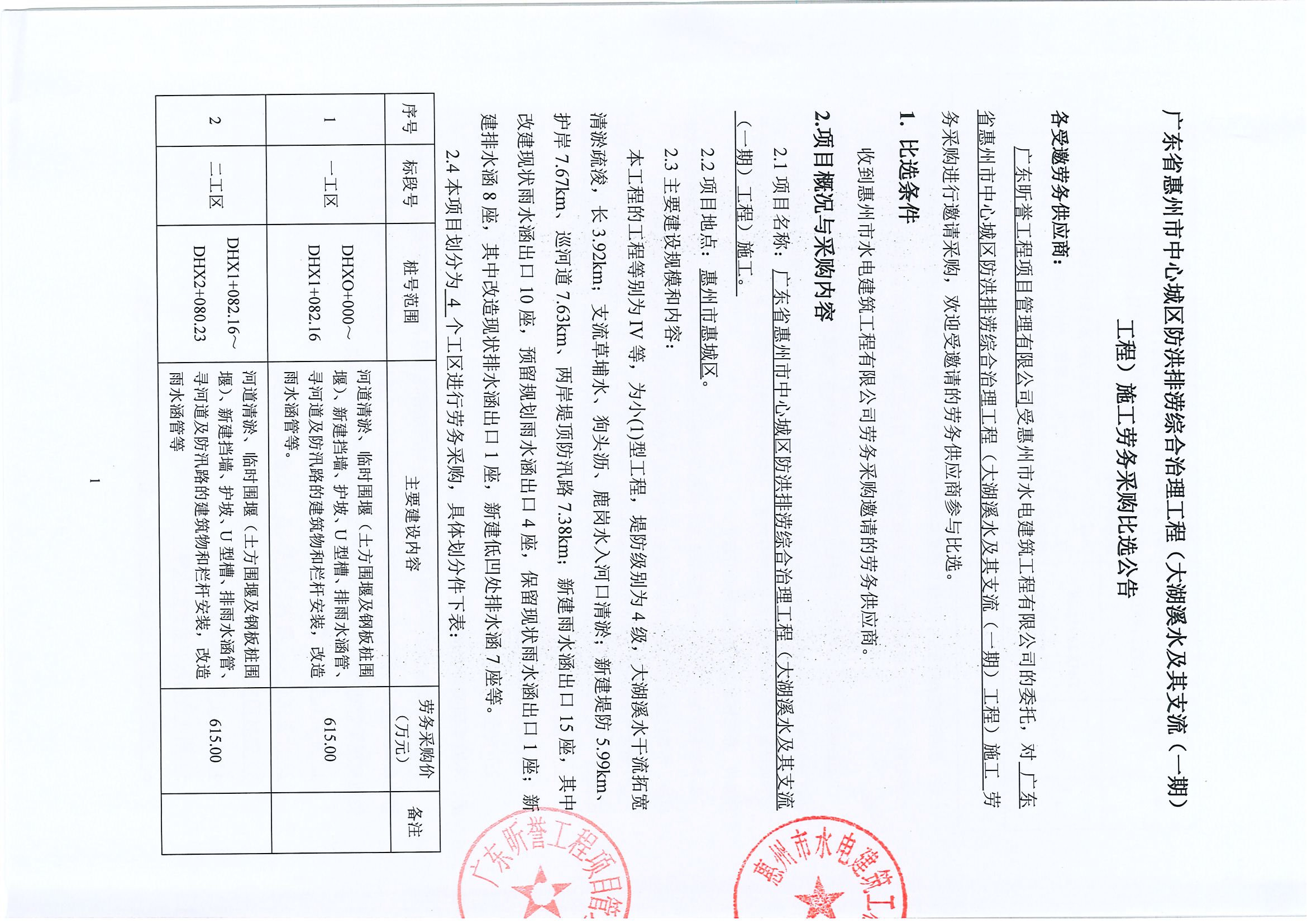 廣東省惠州市中心城區防洪排澇綜合治理工程(大湖溪水及其支流(一期)工程)施工勞務采購比選公告