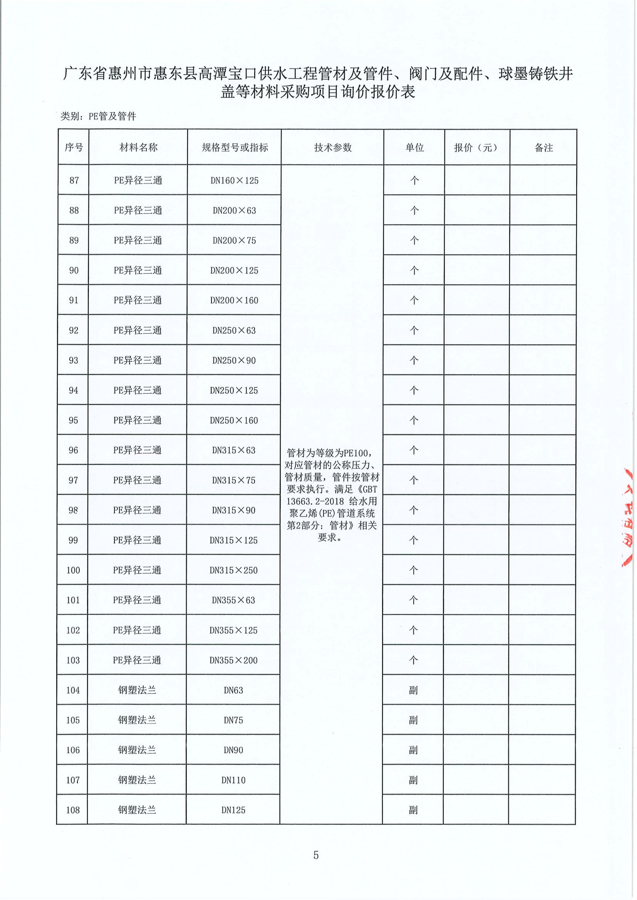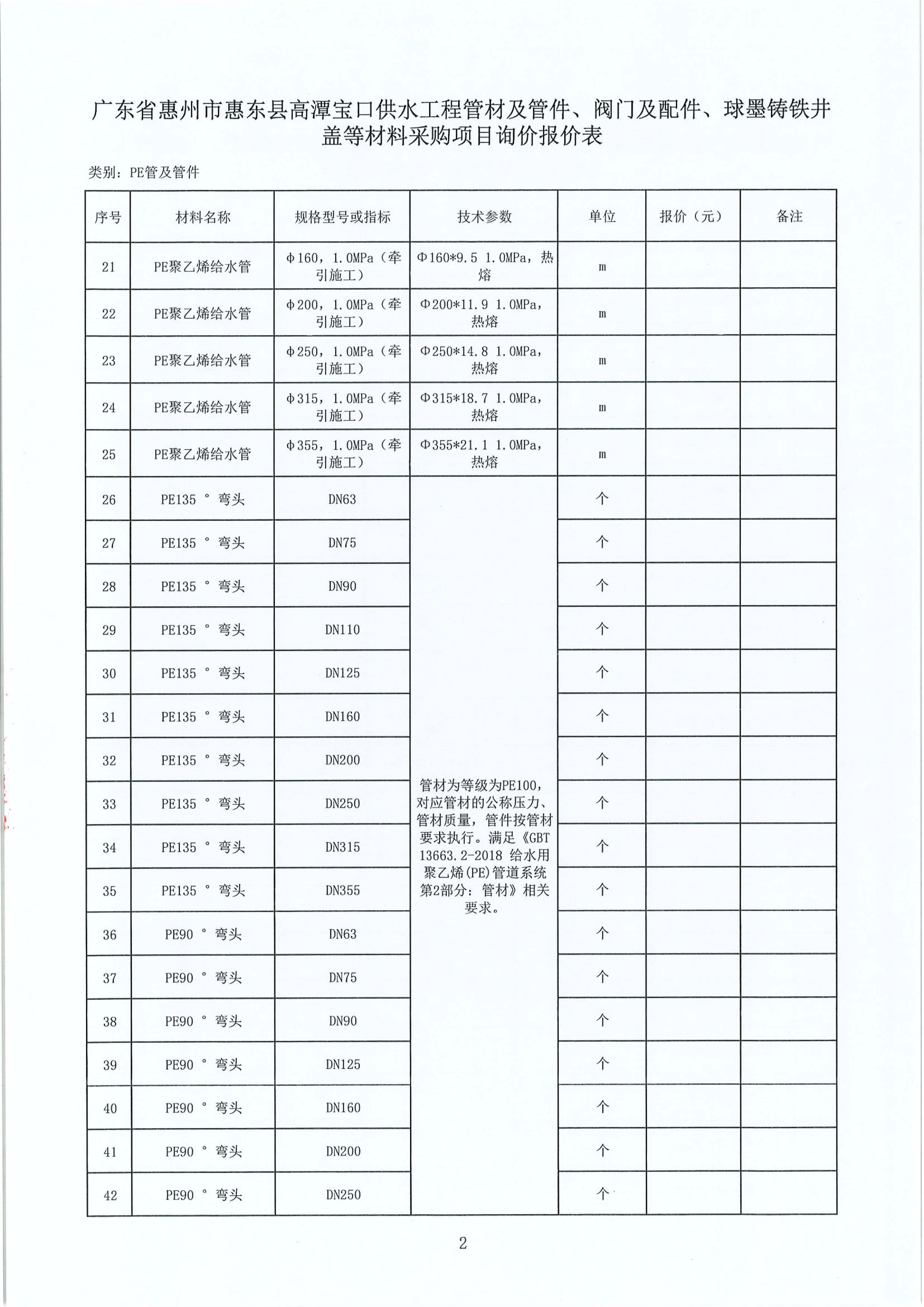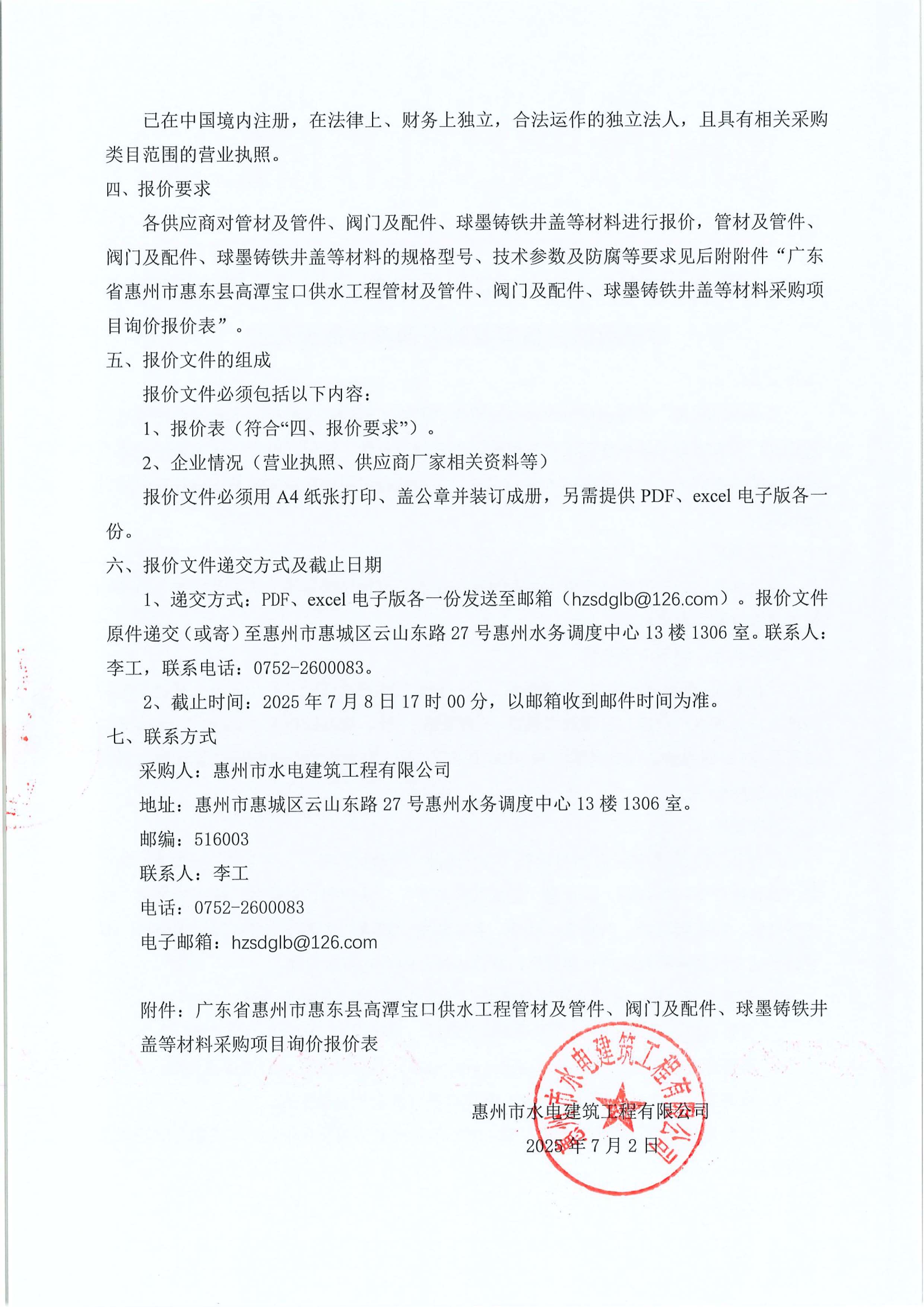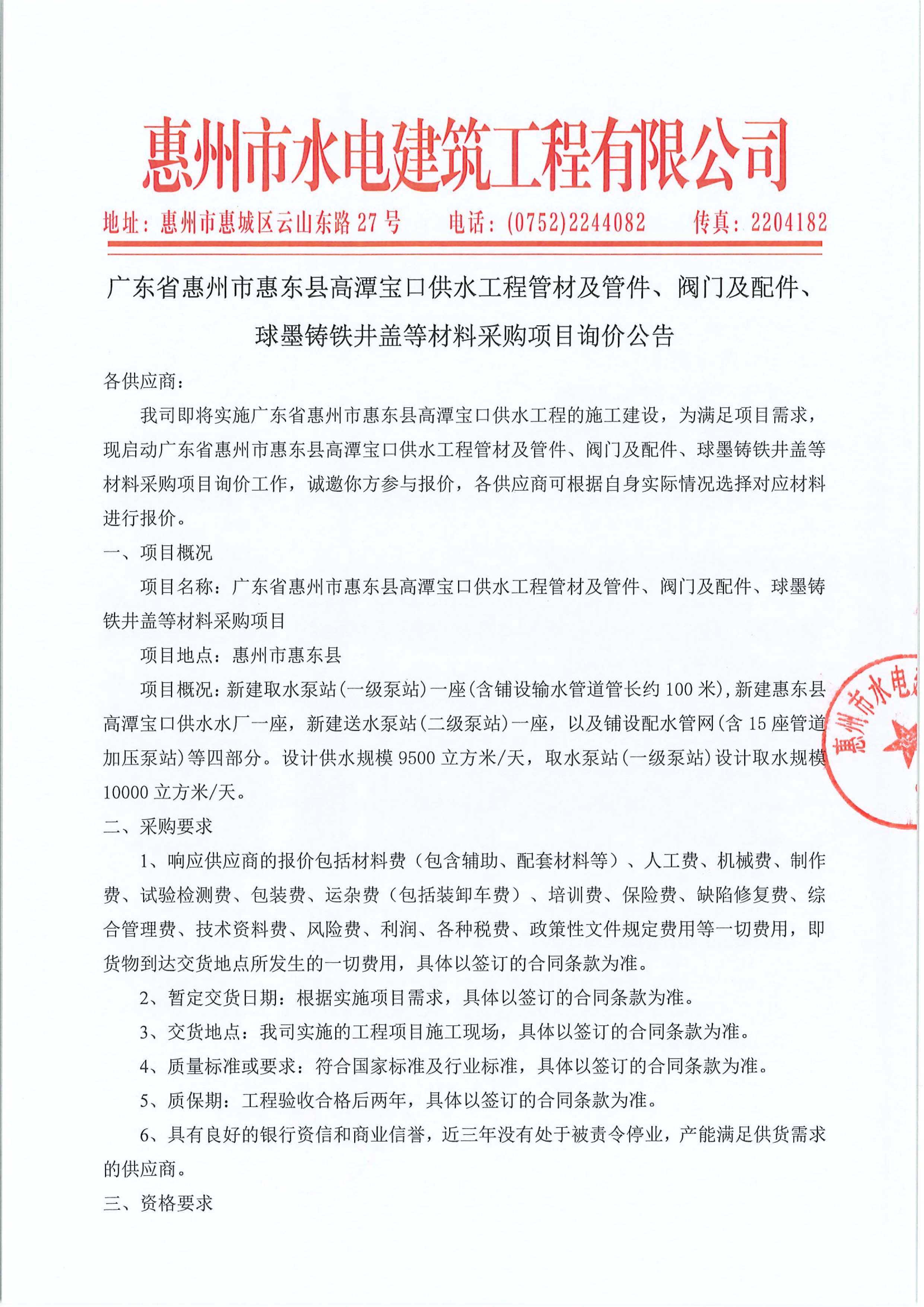 廣東省惠州市惠東縣高潭寶口供水工程施工管材及管件、閥門及配件、球墨鑄鐵井蓋等材料采購項目詢價公告
