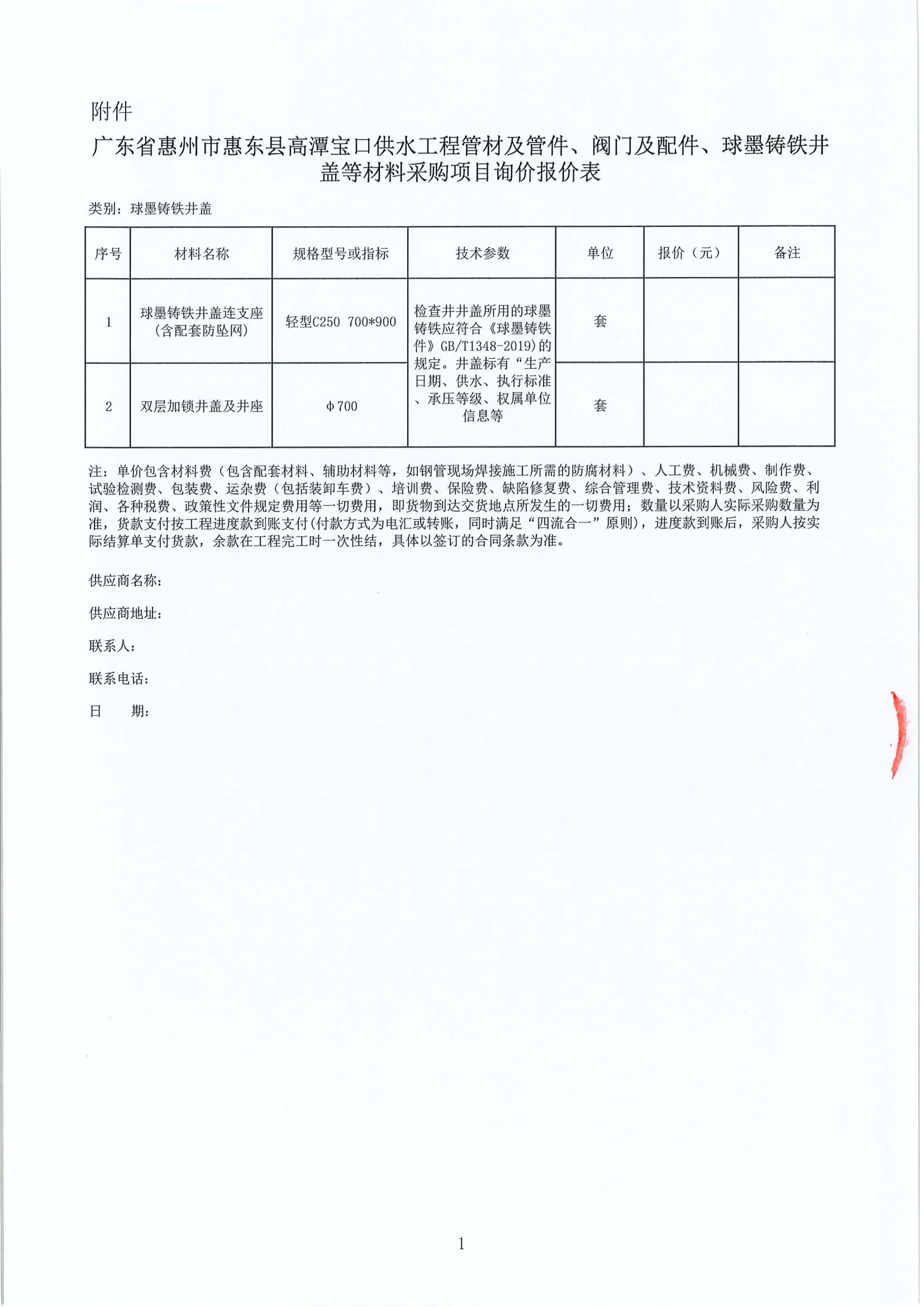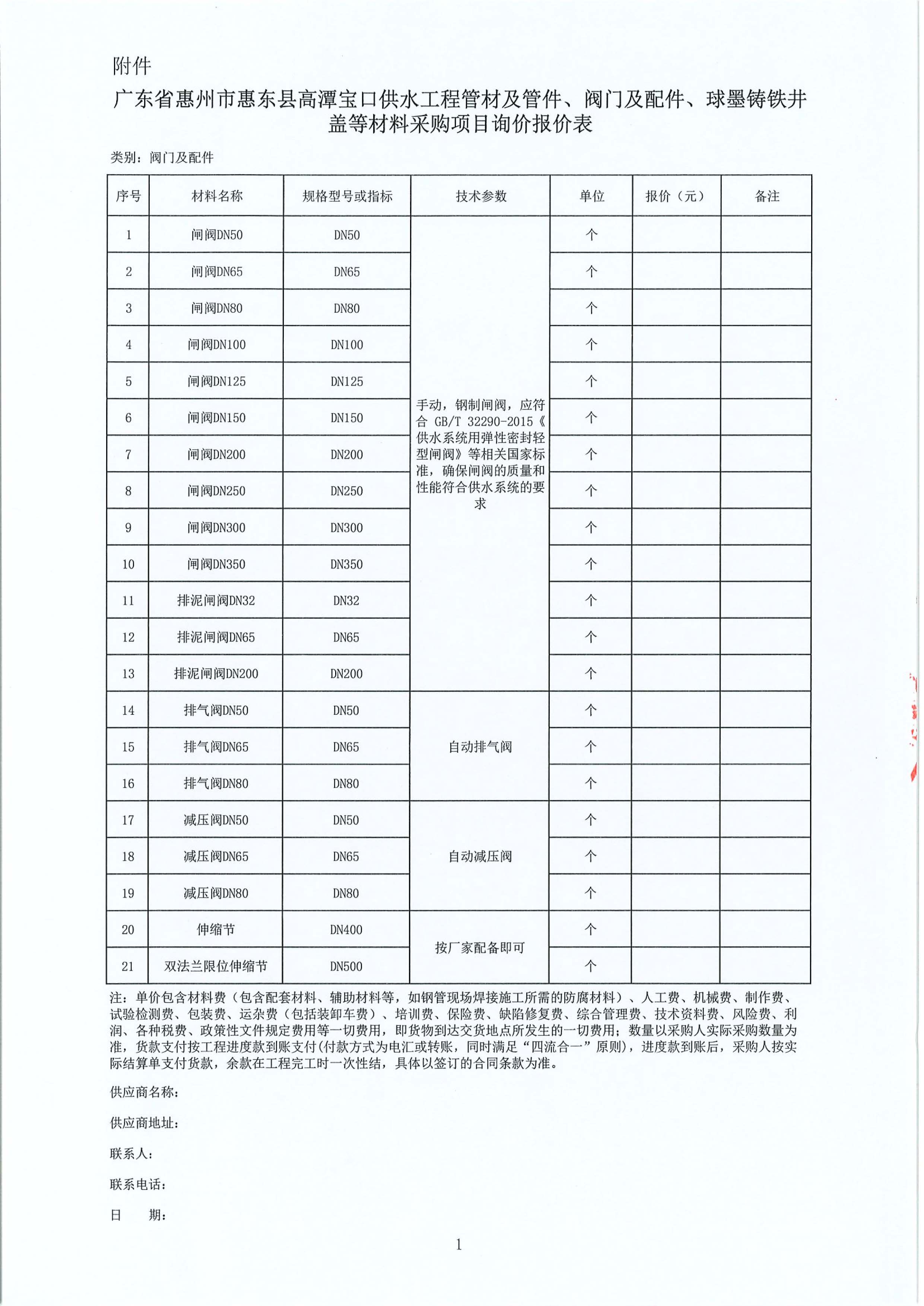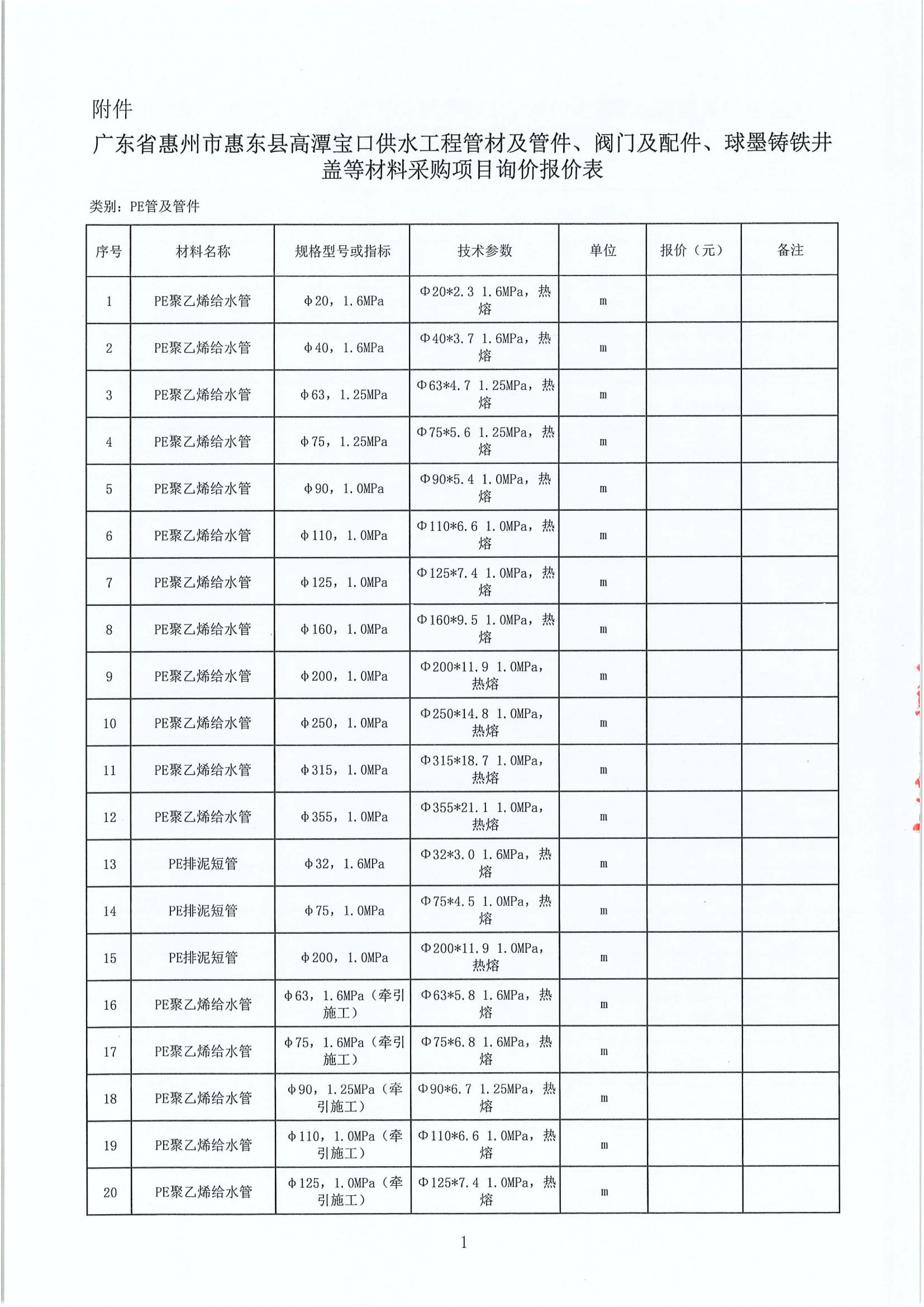 附件:廣東省惠州市惠東縣高潭寶口供水工程施工管材及管件、閥門及配件、球墨鑄鐵井蓋等材料采購項目詢價報價表
