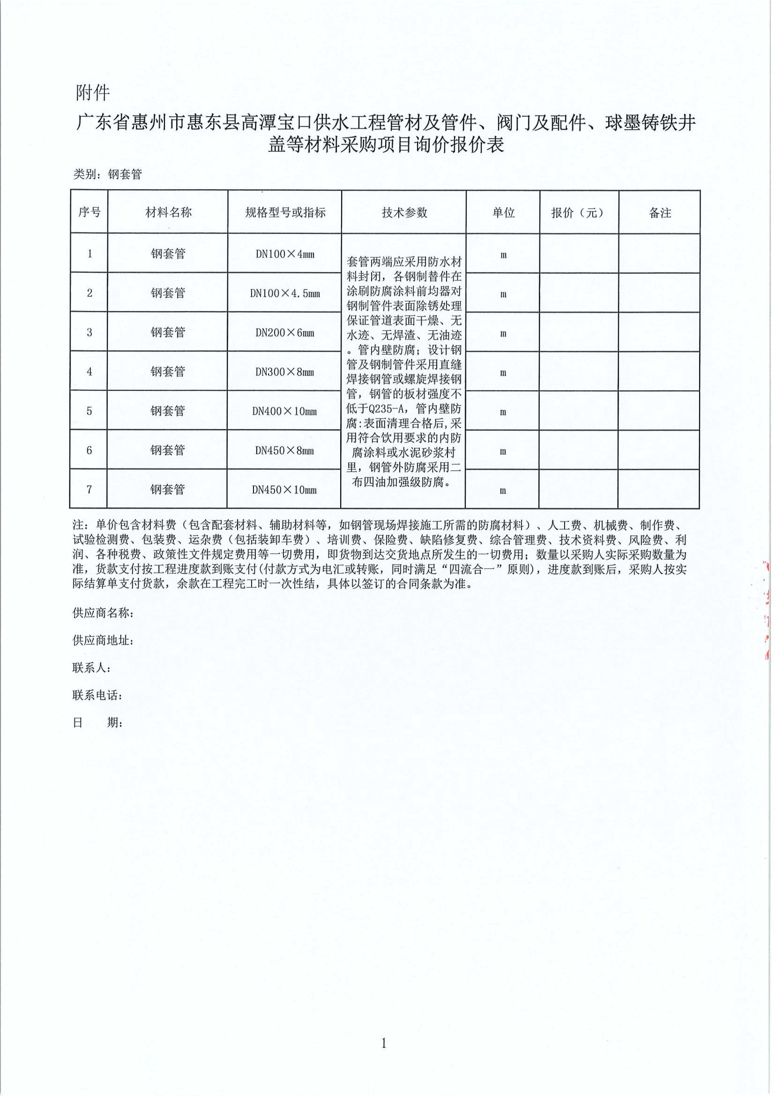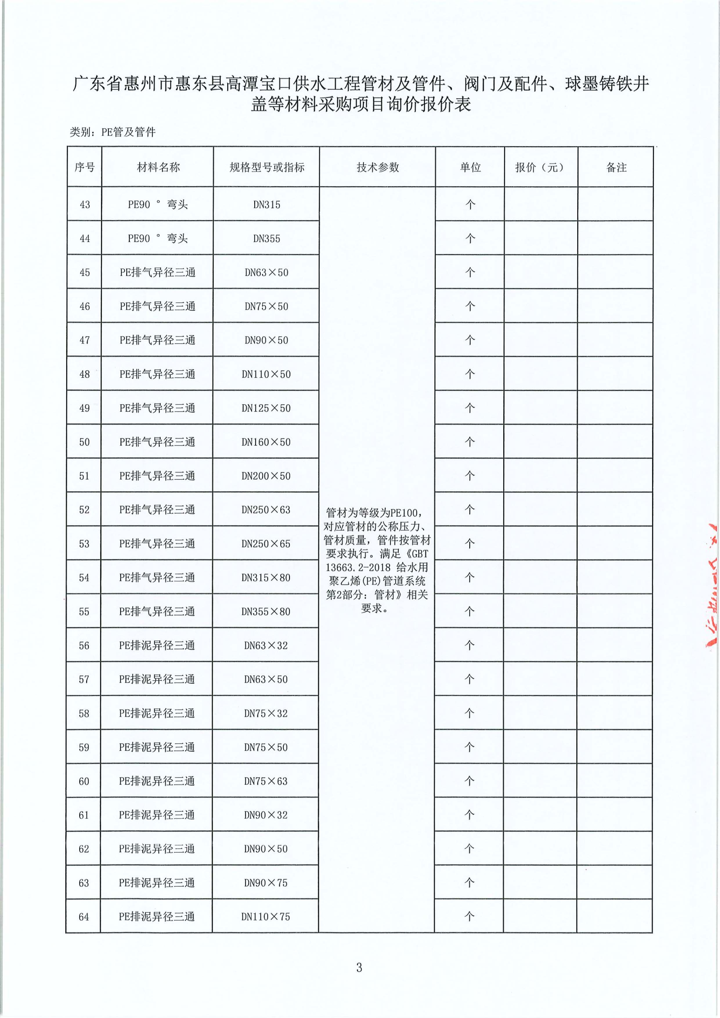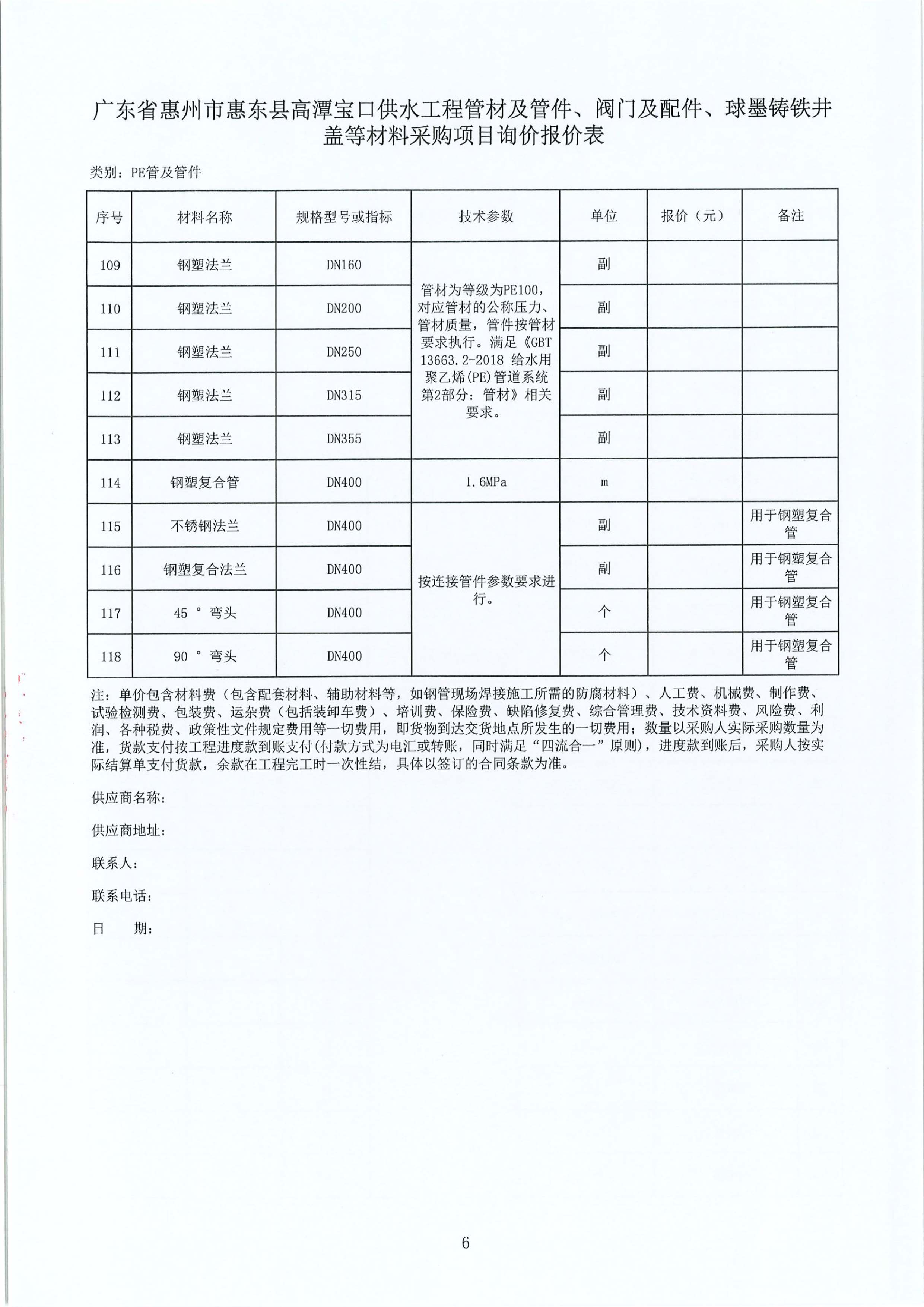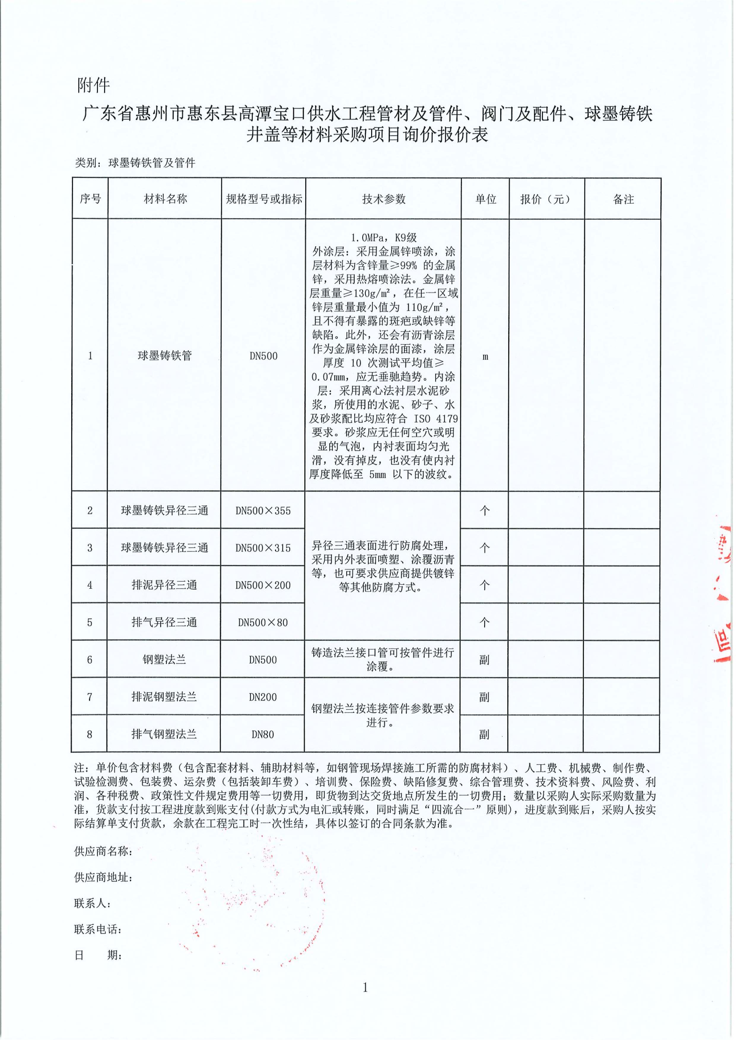 附件:廣東省惠州市惠東縣高潭寶口供水工程施工管材及管件、閥門及配件、球墨鑄鐵井蓋等材料采購項目詢價報價表