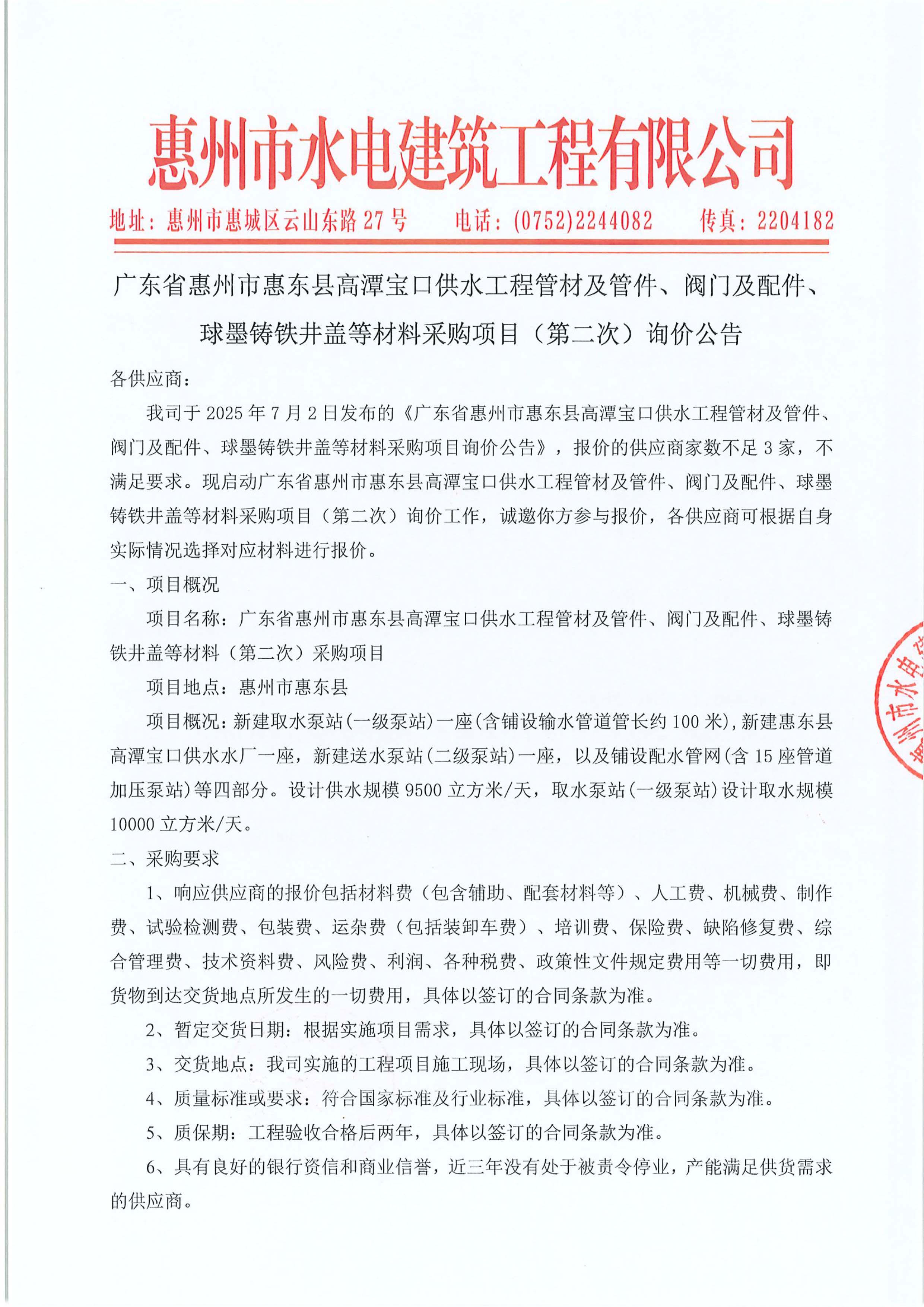 廣東省惠州市惠東縣高潭寶口供水工程施工管材及管件、閥門及配件、球墨鑄鐵井蓋等材料采購項目(第二次)詢價公告