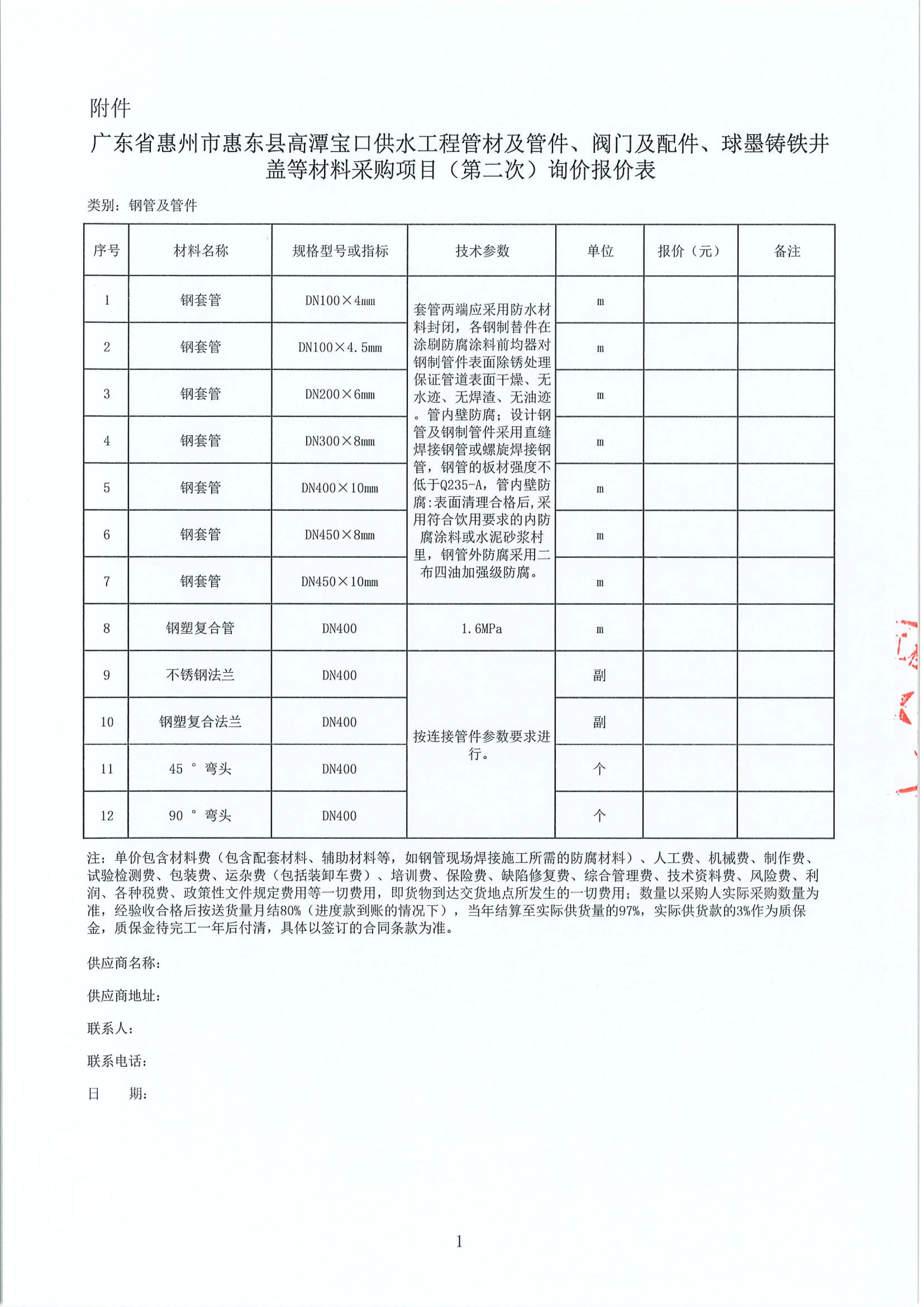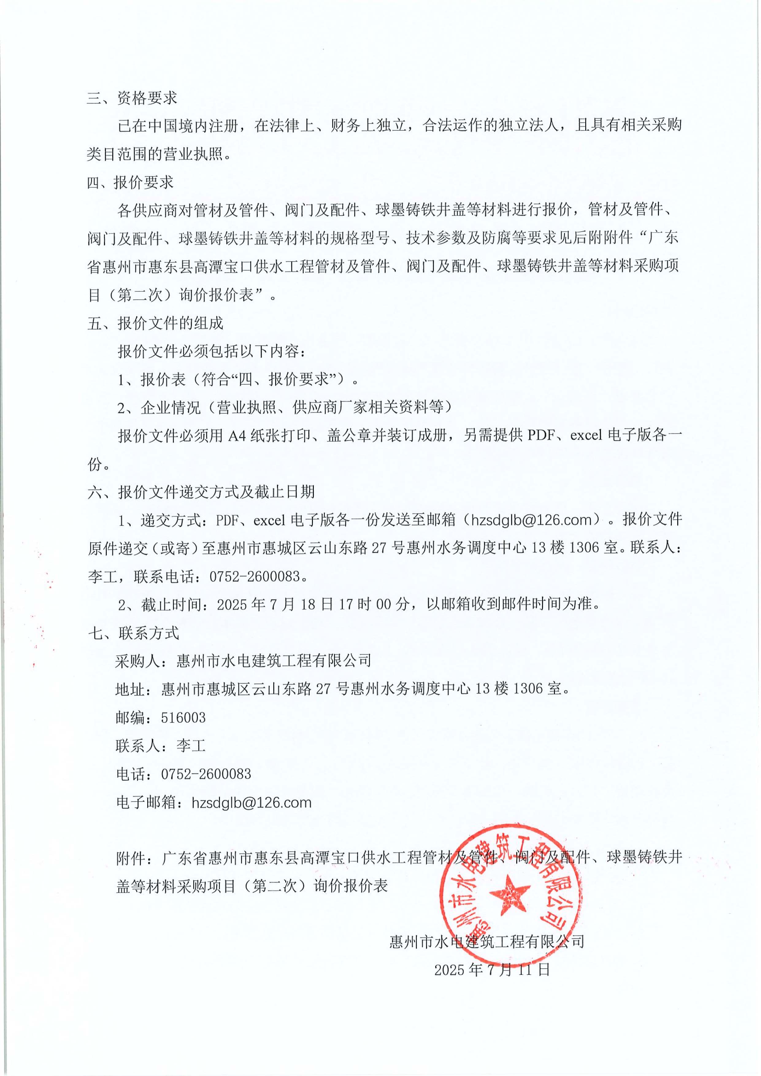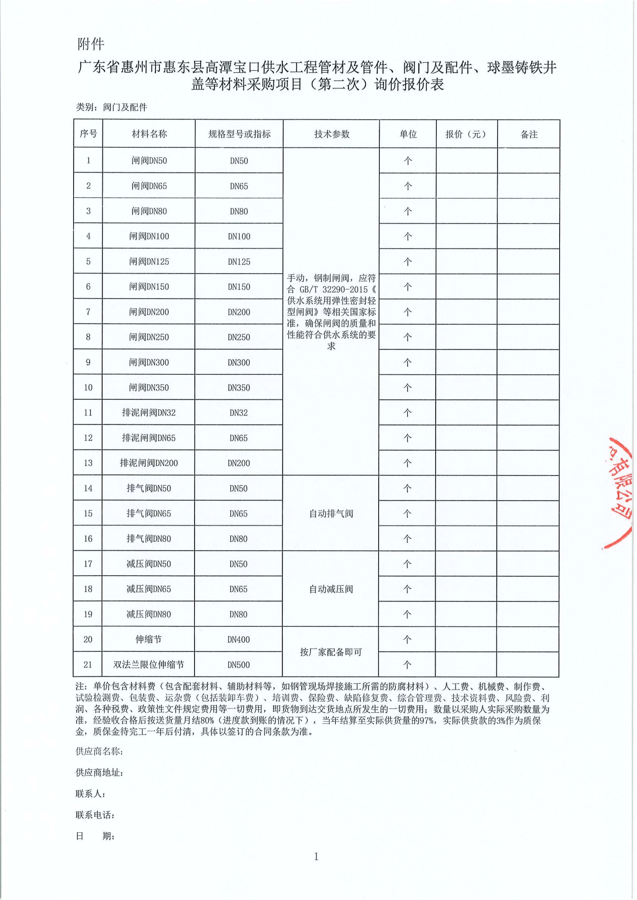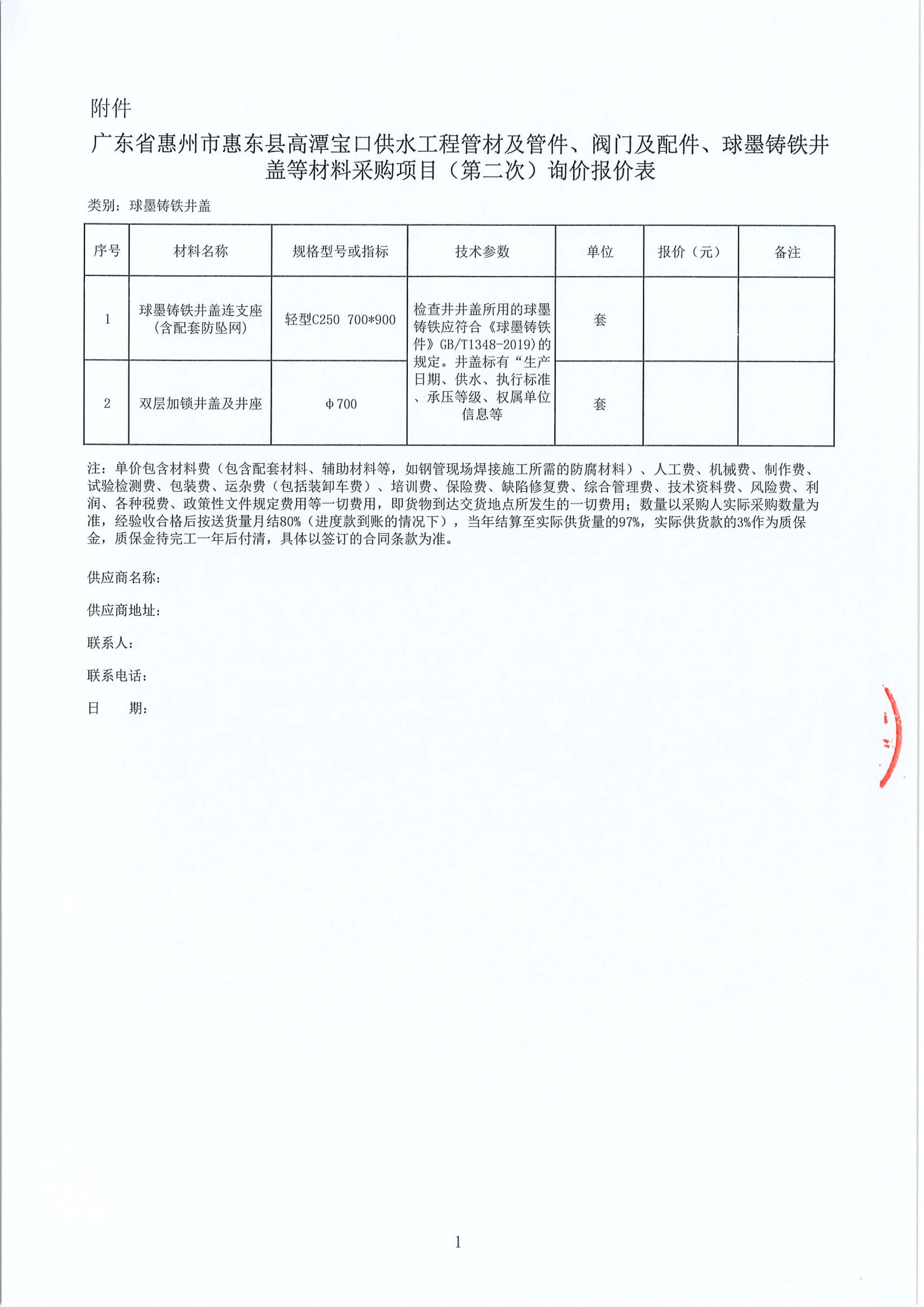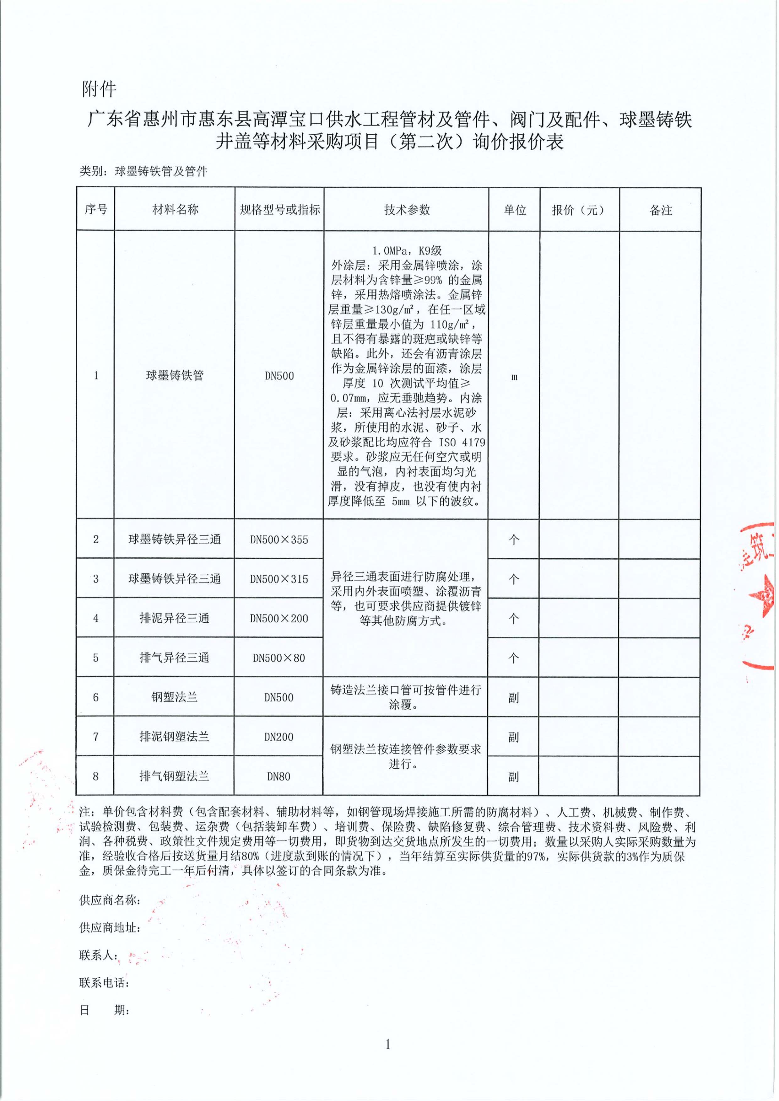 廣東省惠州市惠東縣高潭寶口供水工程施工管材及管件、閥門及配件、球墨鑄鐵井蓋等材料采購項目(第二次)詢價公告附件: