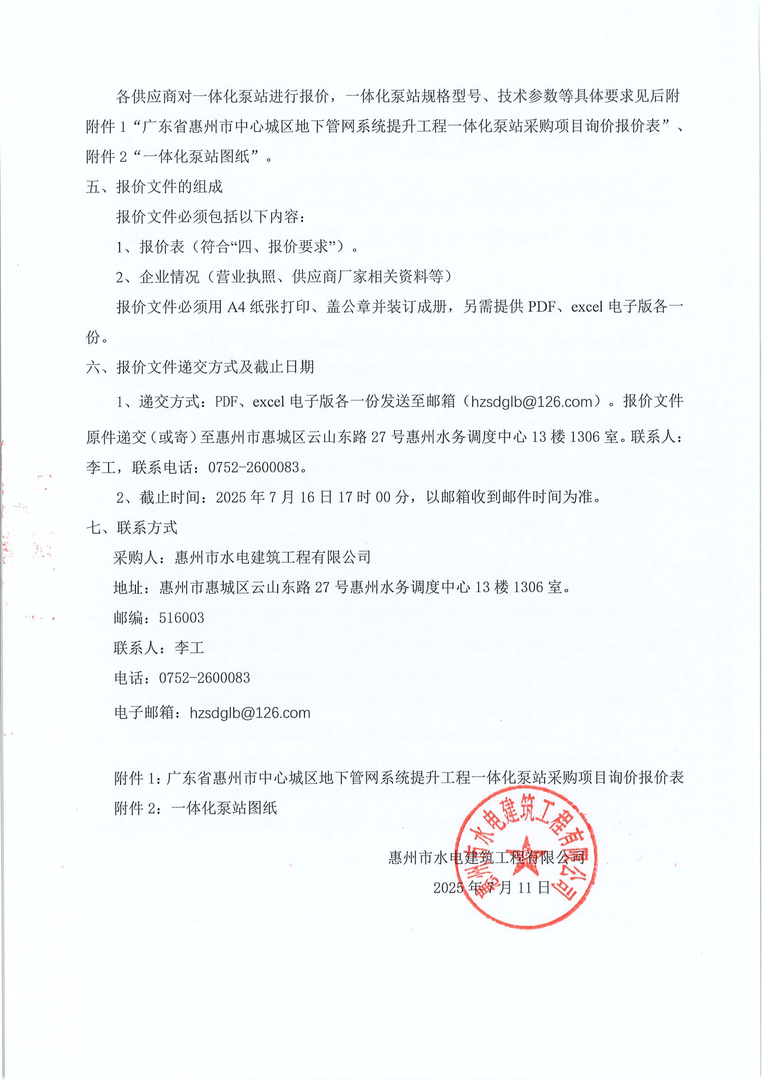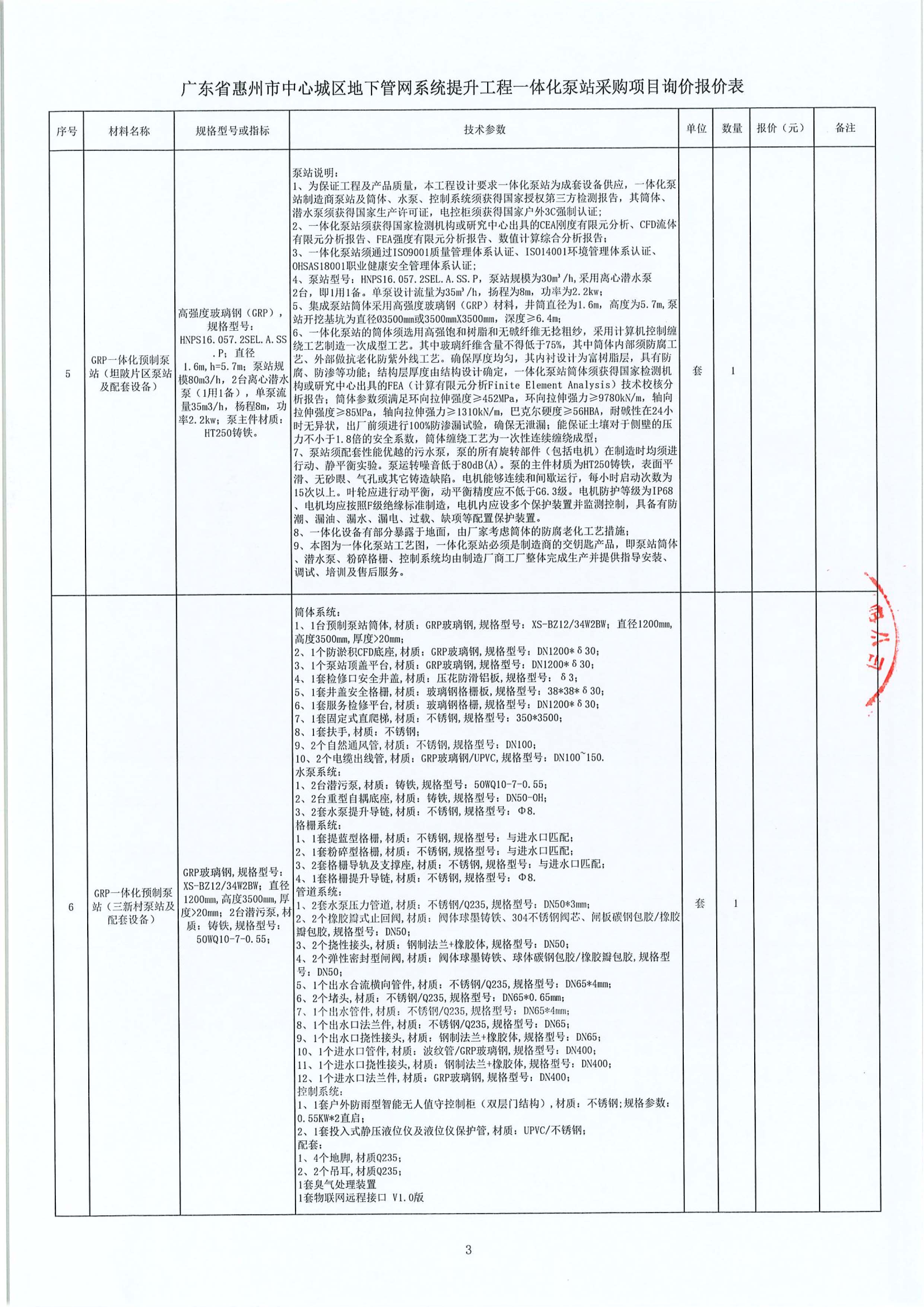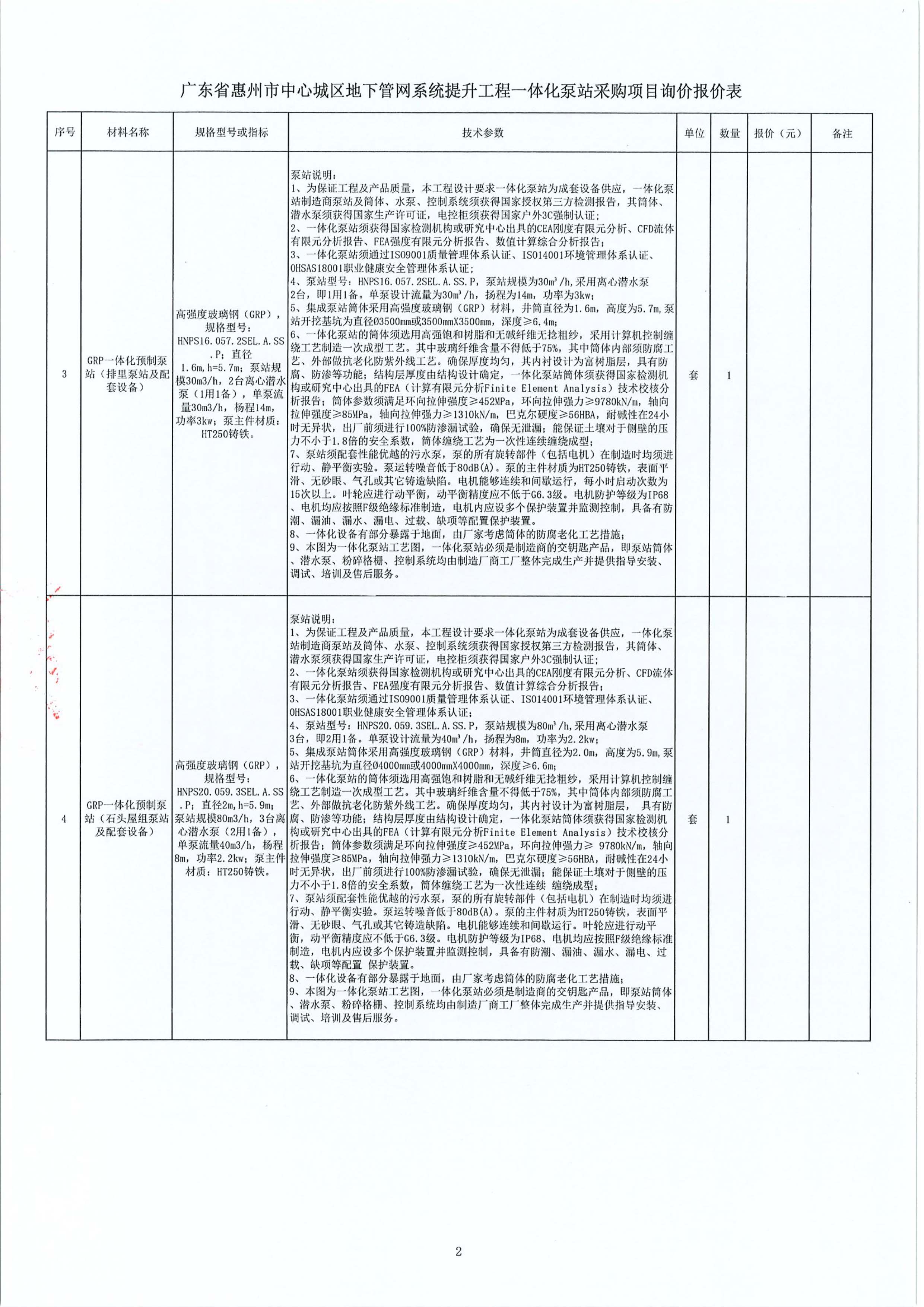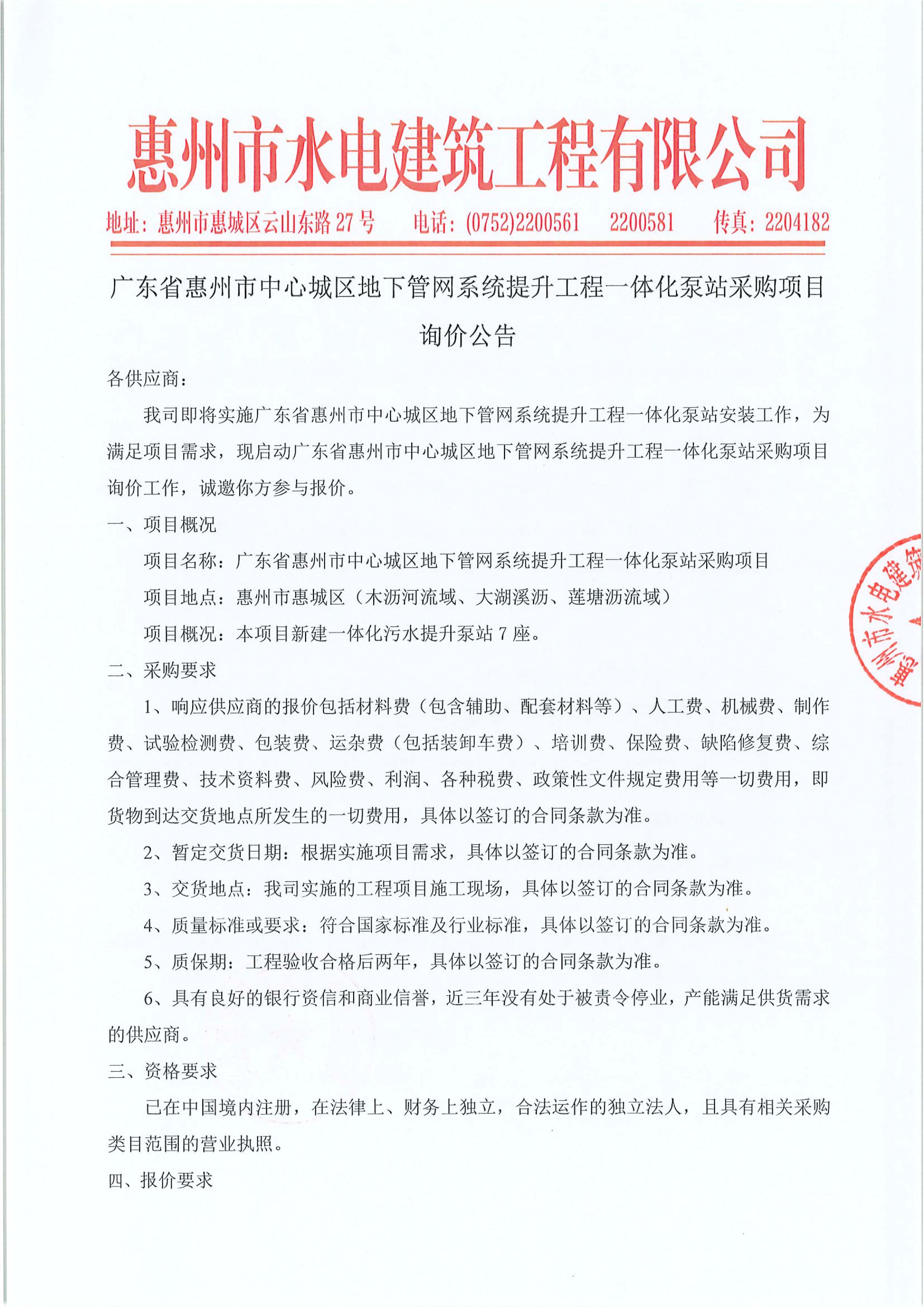 廣東省惠州市中心城區地下管網系統提升工程一體化泵站采購項目詢價公告附件: