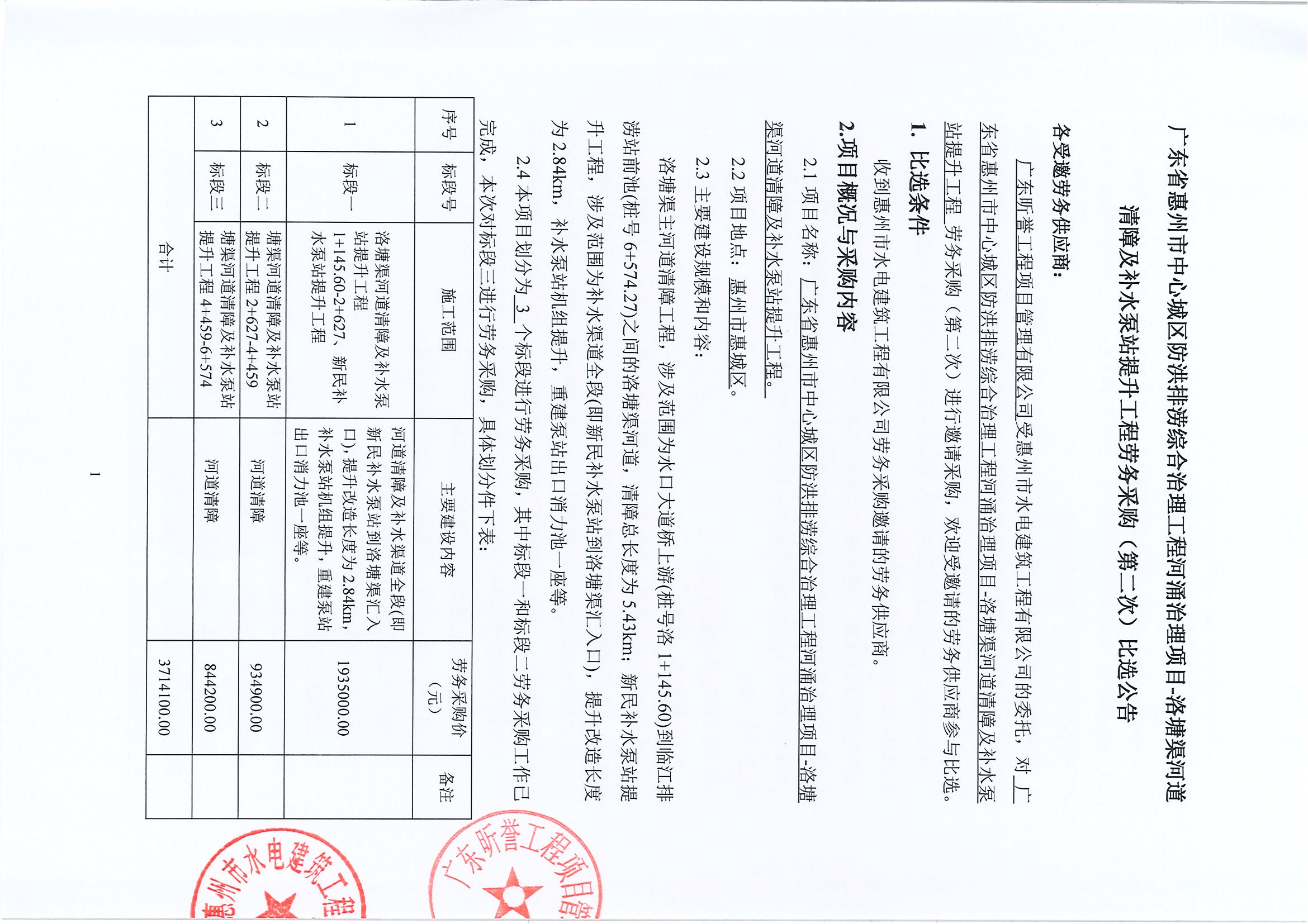 廣東省惠州市中心城區防洪排澇綜合治理工程河涌治理項目-洛塘渠河道清障及補水泵站提升工程勞務采購(第二次)比選公告