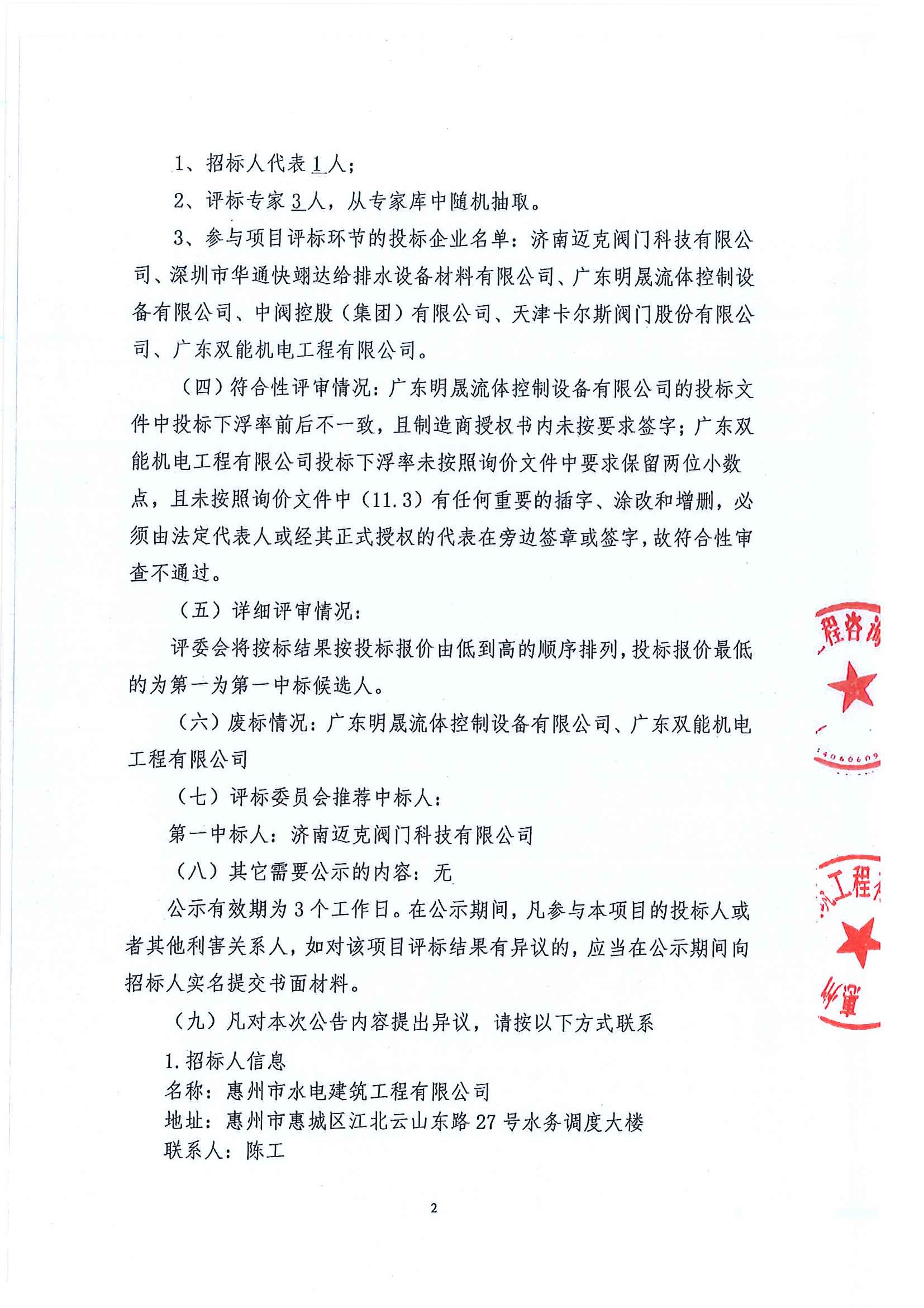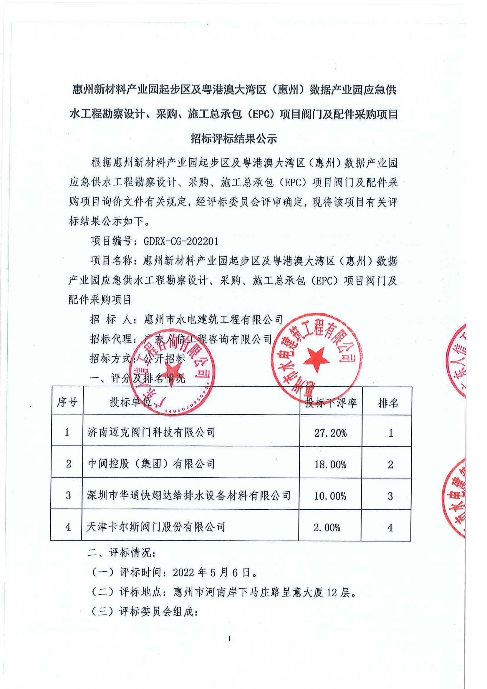 惠州新材料產業園起步區及粵港澳大灣區(惠州)數據產業園應急供水工程勘察設計、采購、施工總承包(EPC)項目閥門及配件采購項目招標評標結果公示