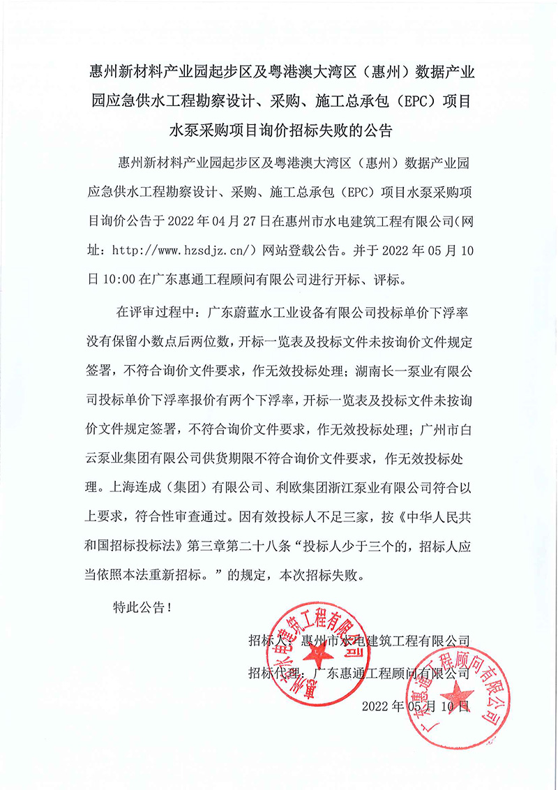 惠州新材料產業園起步區及粵港澳大灣區(惠州)數據產業園應急供水工程勘察設計、采購、施工總承包(EPC)項目水泵采購項目招標失敗公告