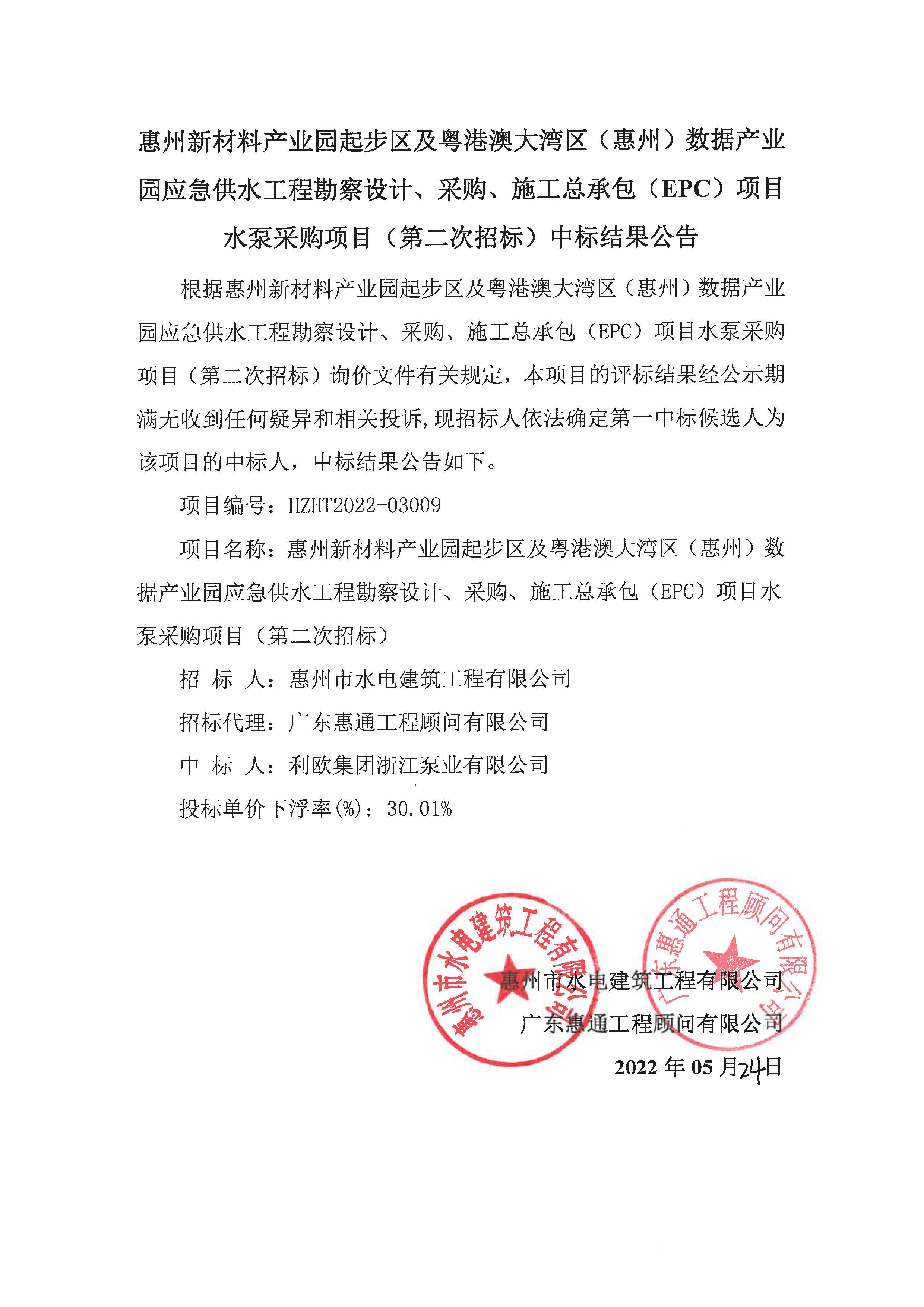 惠州新材料產業園起步區及粵港澳大灣區(惠州)數據產業園應急供水工程勘察設計、采購、施工總承包(EPC)項目水泵采購項目(第二次招標)評標結果公示