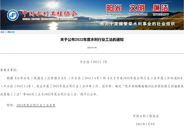 近日,中國水利工程協(xié)會發(fā)布了《關(guān)于公布2022年度水利行業(yè)工法的通知》(中水協(xié)〔2023〕3號),公布了2022年度水利行業(yè)工法名單,其中,市水電公司申報的《長距離全斷面巖石頂管施工工法》(工法編號:SDGF1095-2022)順利通過評審,獲評為水利行業(yè)工法。