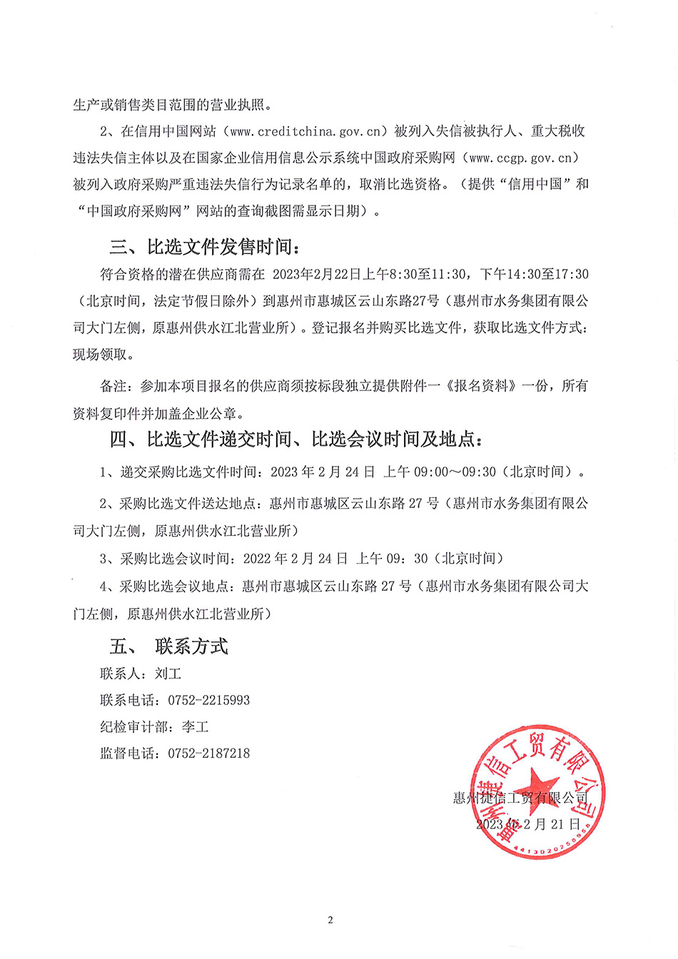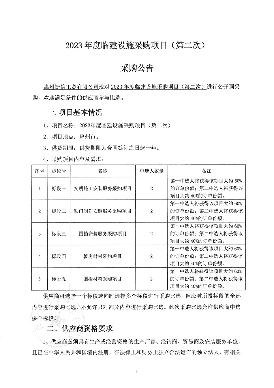 捷信工貿(mào)公司2023年度臨建設(shè)施采購項目(第二次)采購公告