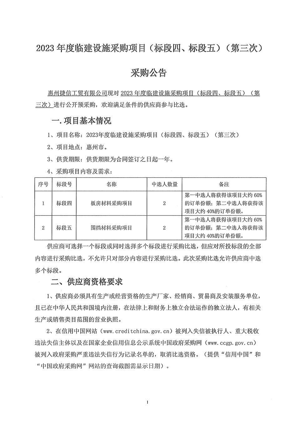 捷信工貿公司2023年度臨建設施采購項目(第四次)采購公告