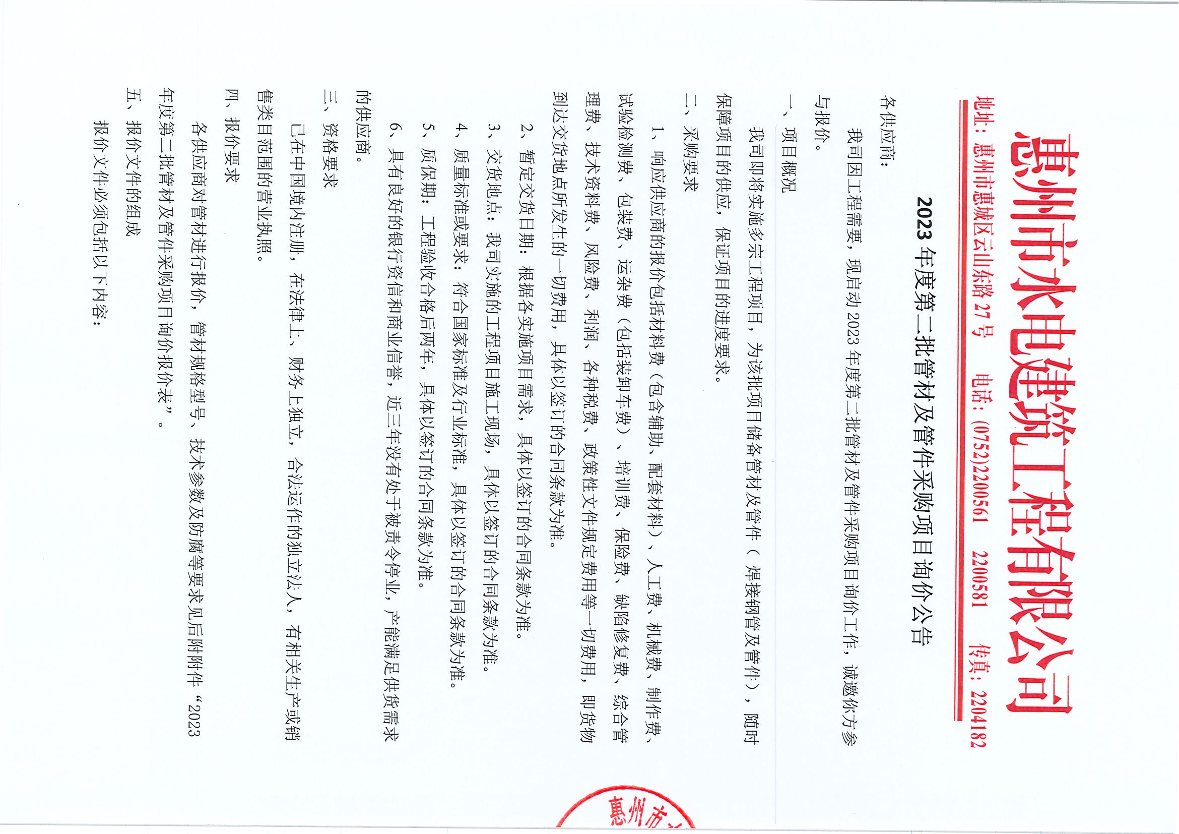 捷信工貿(mào)公司2023年度第一批管材及管件采購項目(標段一)(第二次)評標結(jié)果公示