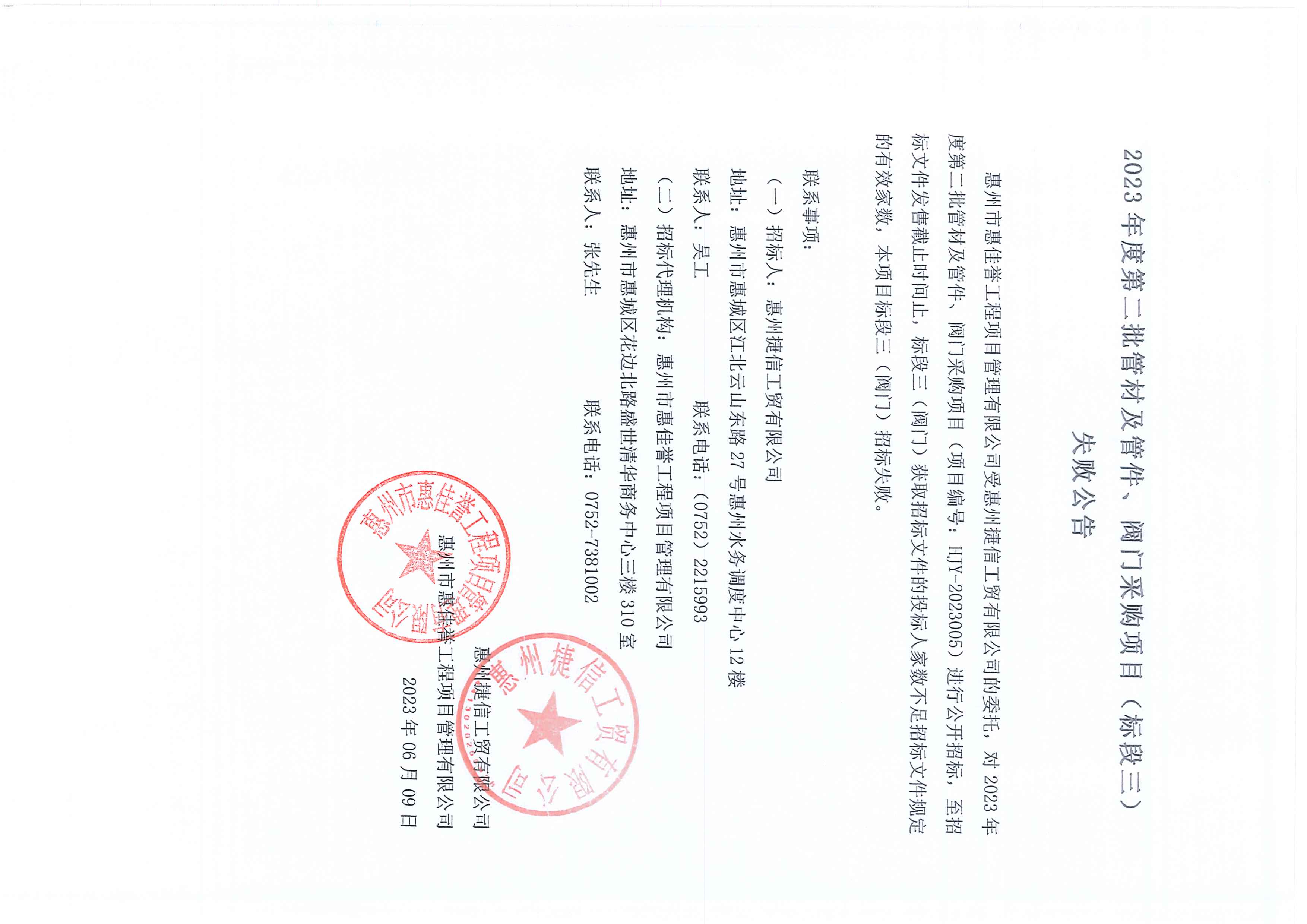 捷信工貿公司2023年度第二批管材及管件、閥門采購項目(標段三) 失敗公告