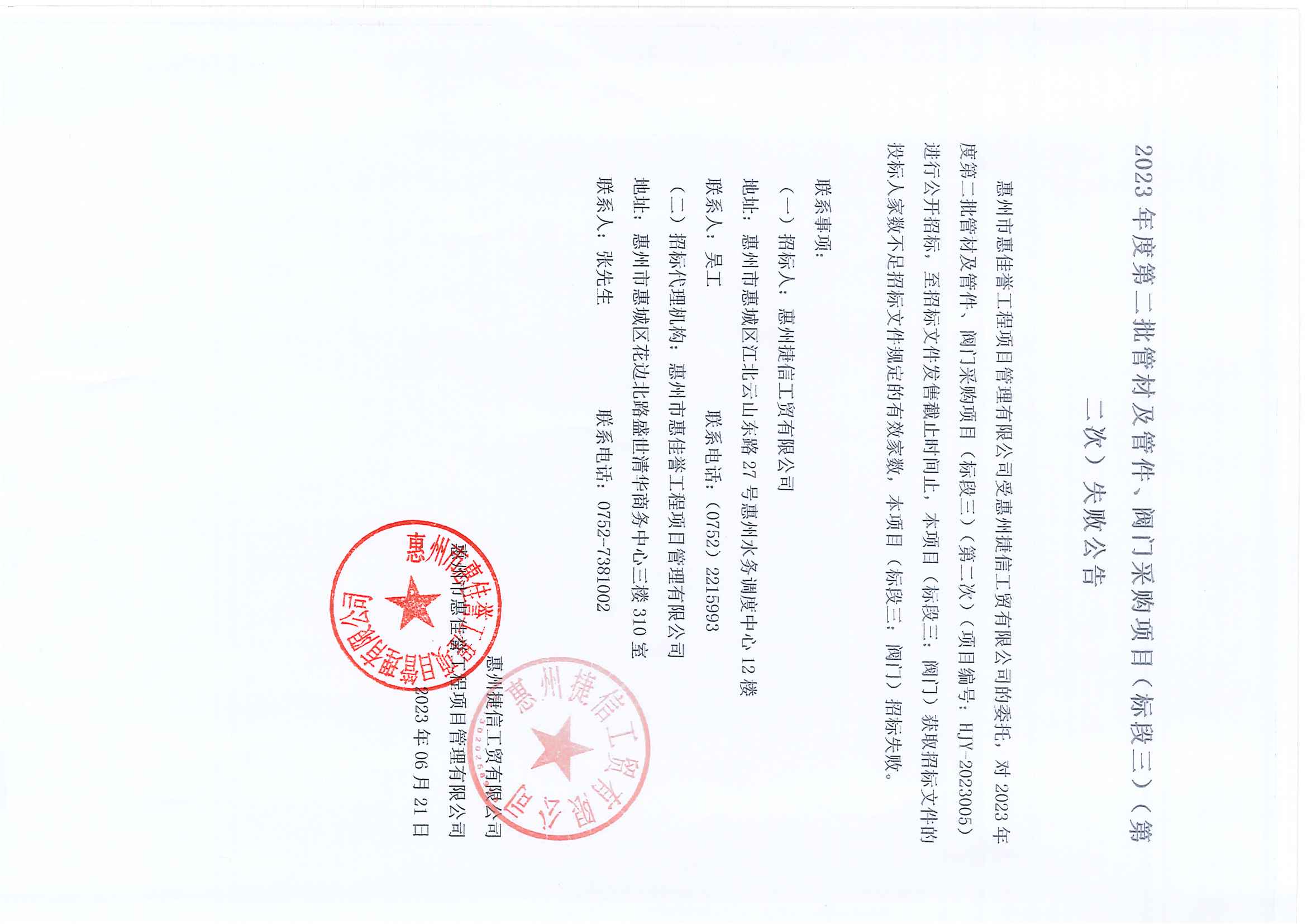 捷信工貿公司2023年度第二批管材及管件、閥門采購項目(標段三)(第二次)失敗公告